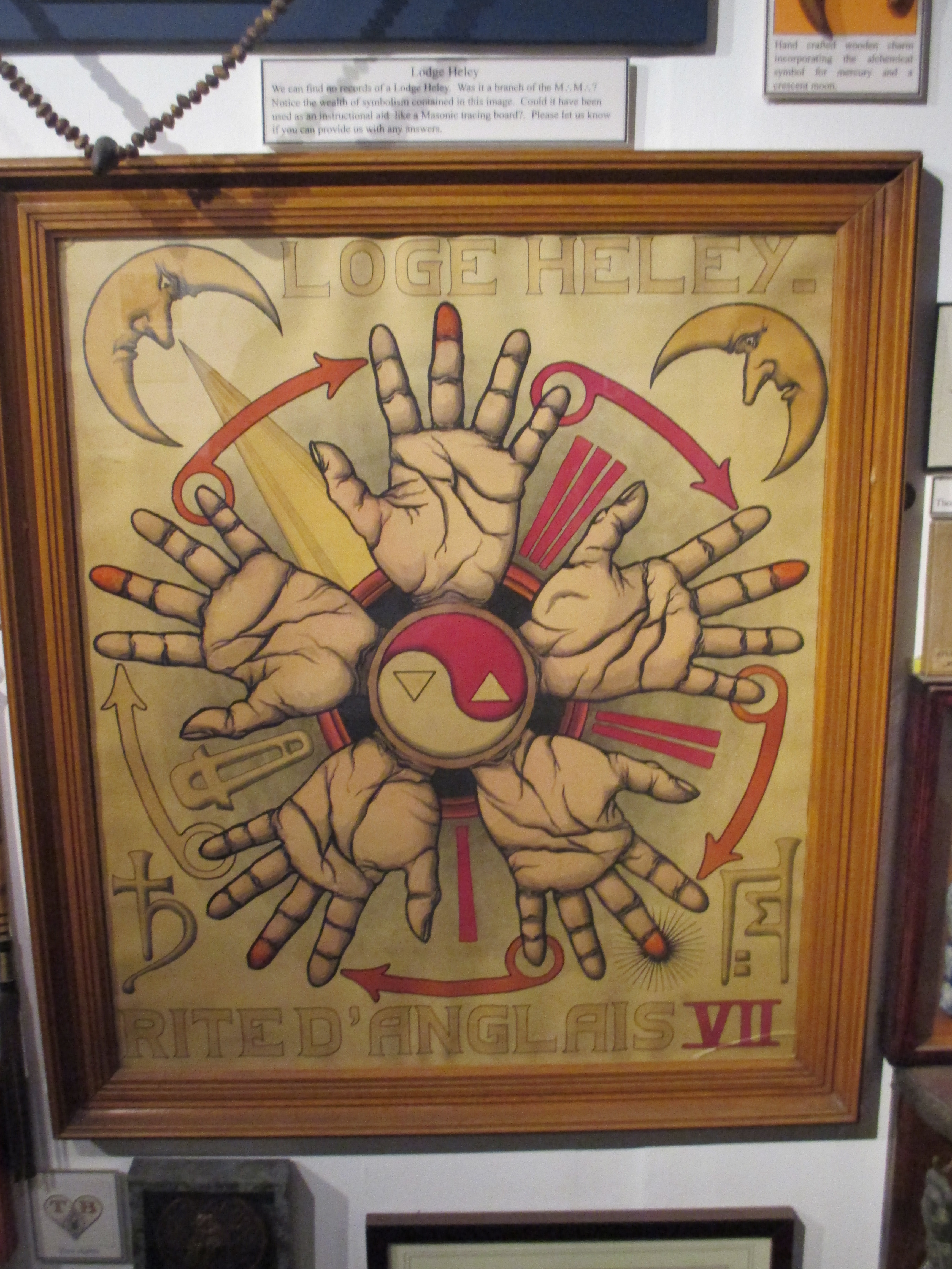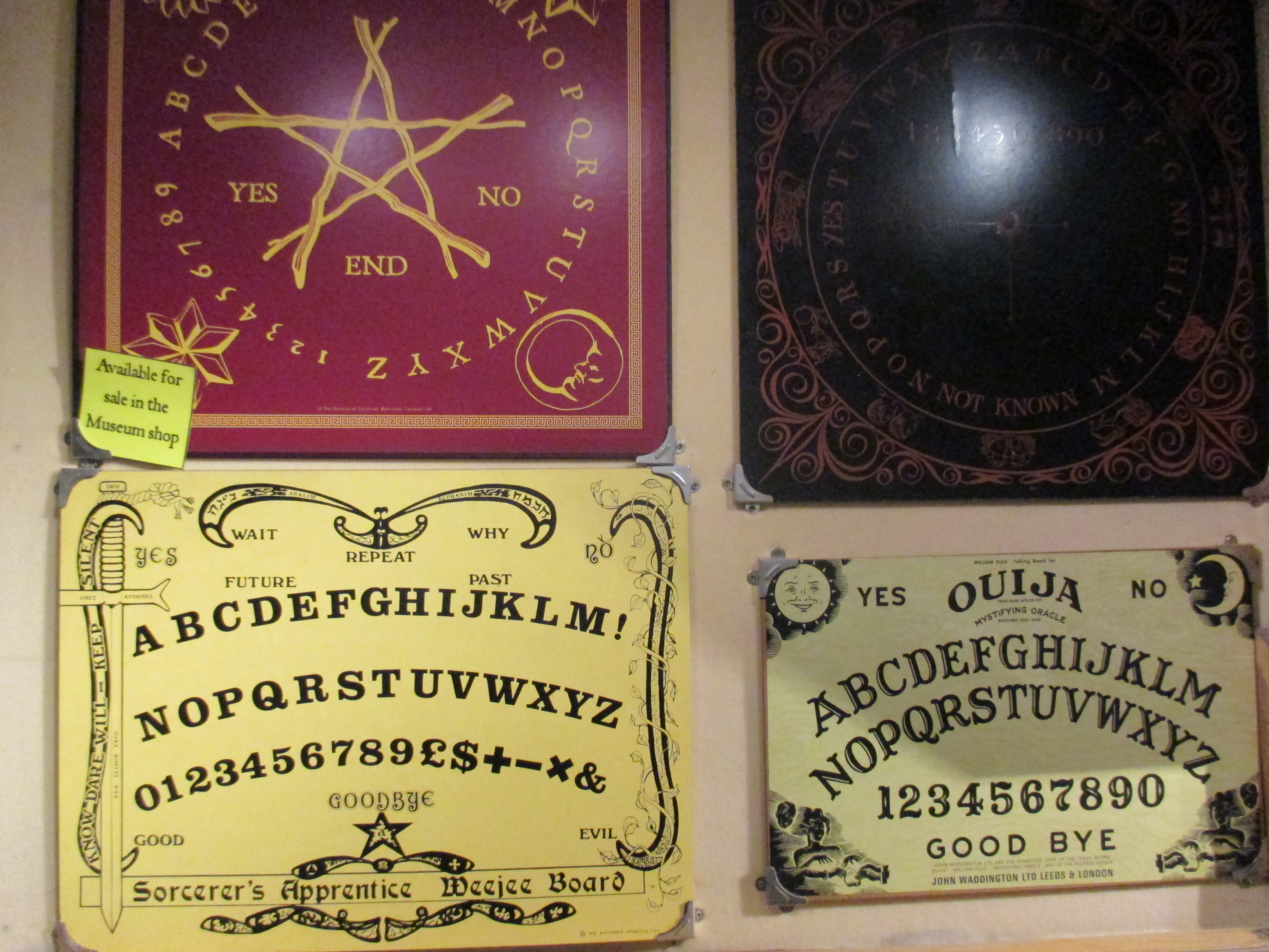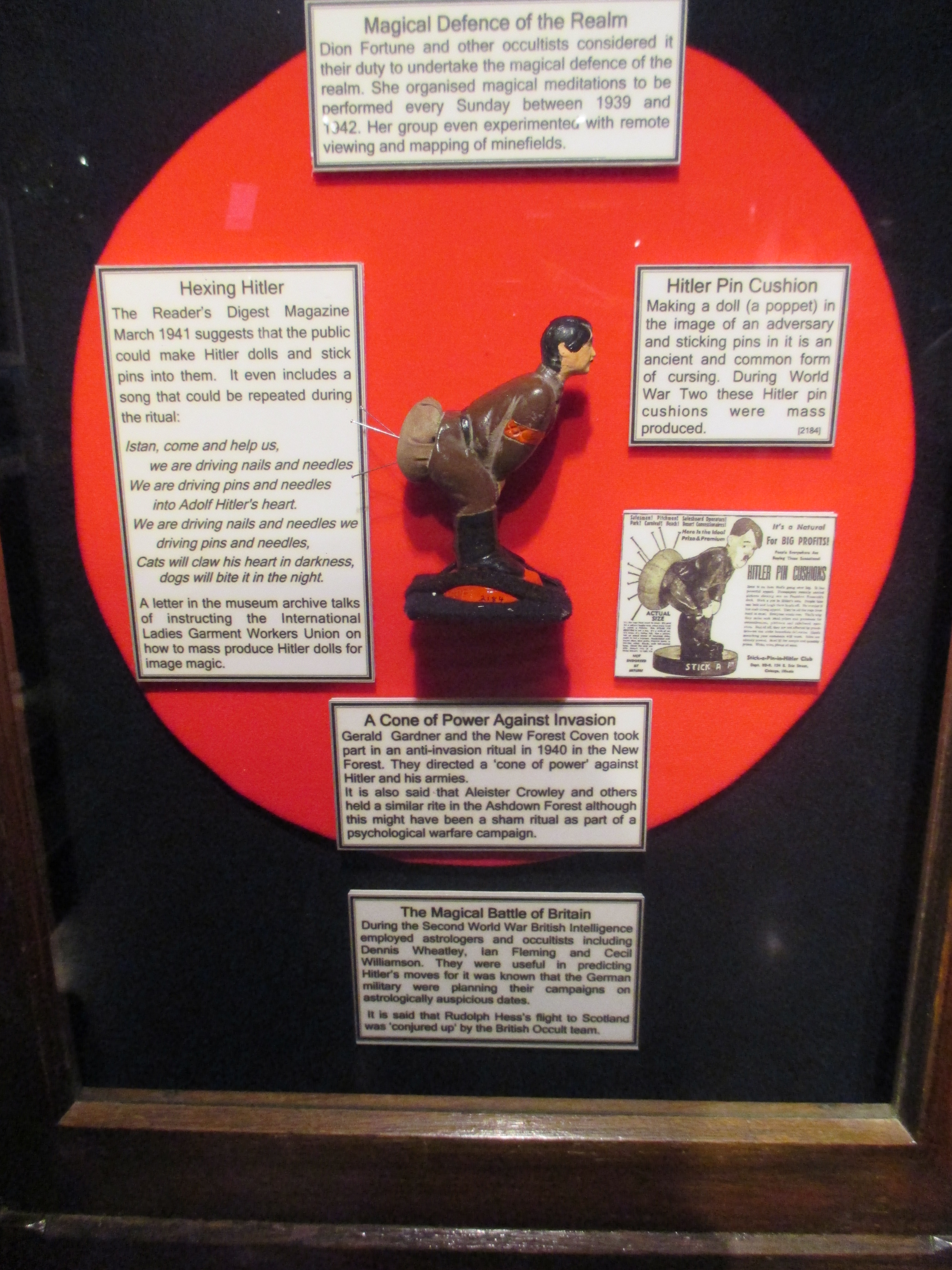I wander around the exhibits, impressed by the scale of the collection. Artefacts, objects, verses and beer bottles narrate the tales of wise and benevolent witches, magical hares, staffs and stangs, worship of an archetypical mother – the Goddess, as well as folk charms seeking revenge, desiring love, mandrake roots or other things. Some attempt to represent infinity, or some kind of supreme mystery, labyrinths scratched into stone, portals to another world, or wooden boards that attempt communication with the dead. Nor are these all aged and twee objects. Cecil Williamson worked for M16 during WW2, helping intelligence agents understand the occult reasoning of top Nazi officials as well as carrying out some very strange ‘black ops’. Rumour has it that Williamson helped capture Rudolf Hess after producing a fake Nostradamus book that tricked the Nazi deputy into flying to Scotland, whilst Aleister Crowley carried out elaborate spells to protect the mainland from German invasion. More recently, British intelligence officers planted black candles, upside-down crucifixes and other ‘black magic’ across Belfast during the Troubles of 1972-4, exploiting fears of Satanism and attaching them to paramilitary Republicans and Loyalists. The fact is not in the belief itself, but in its being believed.