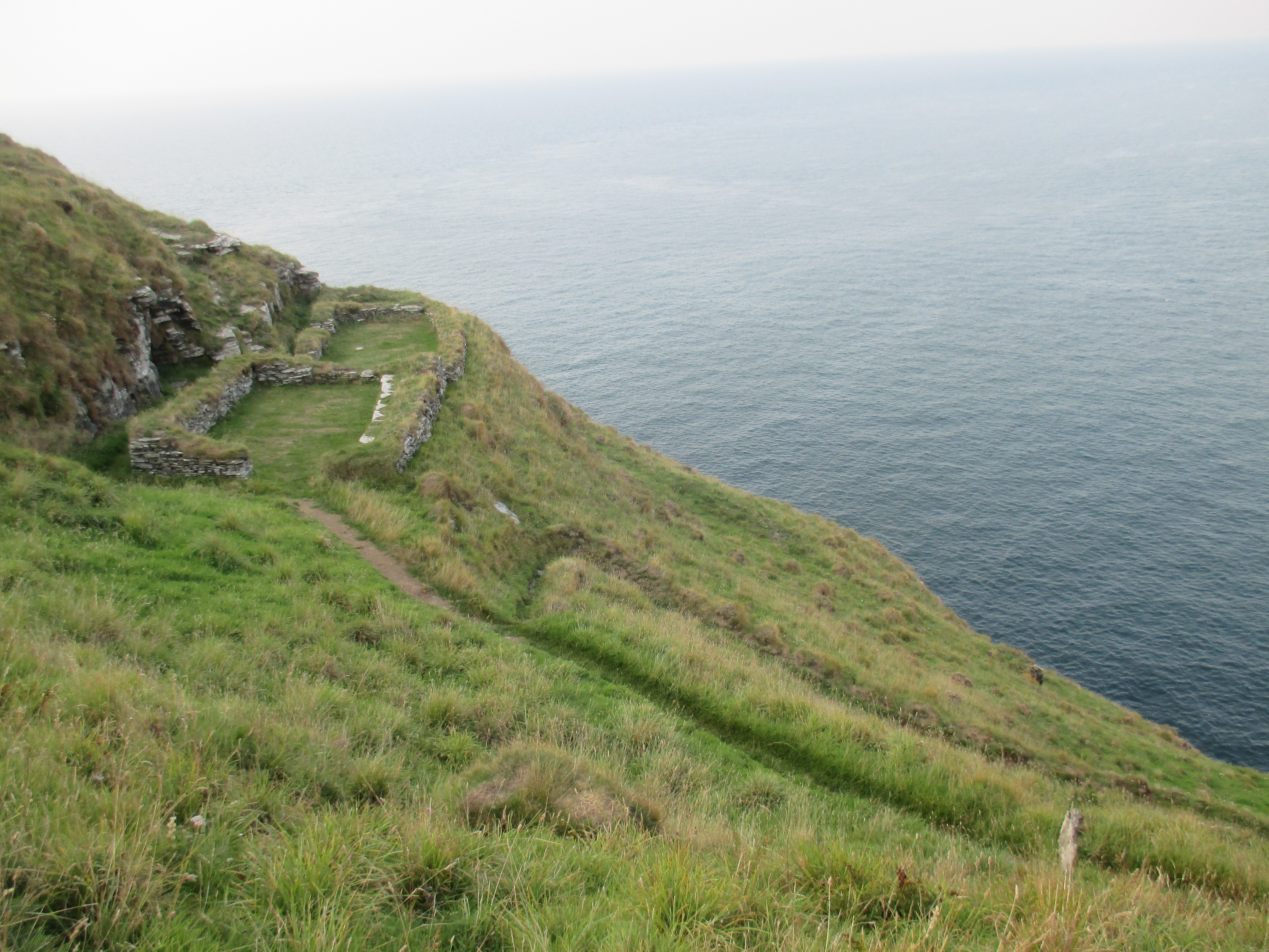 Tintagel, just a little ahead, is a special place. The spectacular ruins of its castle, cast adrift on a jagged rock in the midst of surging seas, is quite unforgettable. Geoffrey of Monmouth claims it is where King Arthur was conceived (combining magic with plain deception). Victorians made even more of this minor association, turning Tintagel Castle into the bastion of Arthurian myth. Yet wandering around the ruins of this castle, I discover that these fortifications were largely built in early medieval times, then later, abandoned. Tintagel’s magic, disconnected from the land and its time, is a relatively modern effect. Archaeological evidence suggests the castle was once part of the headland until some sea washed its thin link with the world away. When John Leland arrived, one could only reach the ruins of Tintagel by way of a flimsy bridge of tree-trunks. Now one must scale staircases cut into the cliff, then wander around on the plateau, among the ruins of past lives.