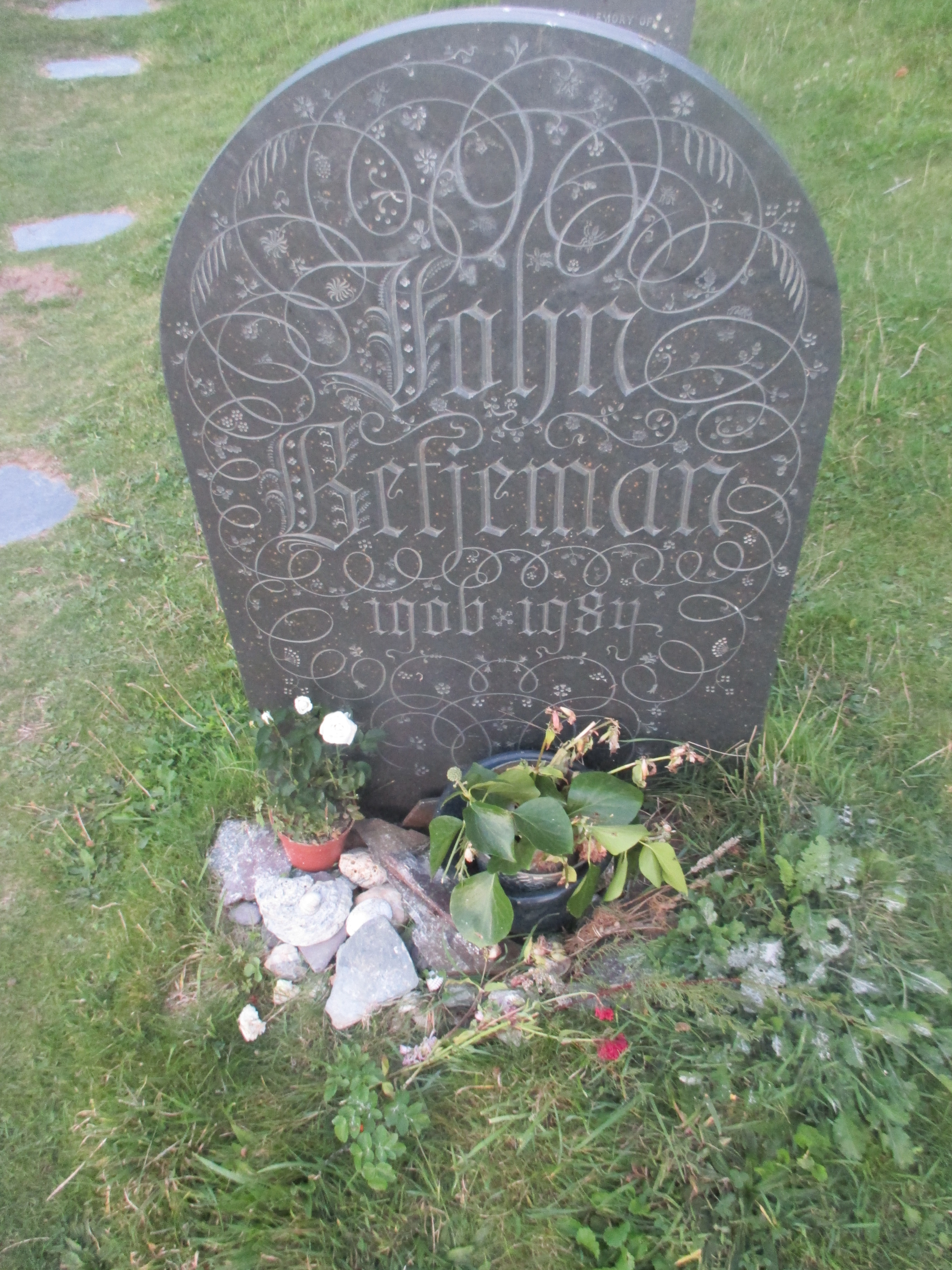 Betjeman’s words are significant to my project: his poetry tells a story of England made up of train journeys, of life lived through the anodyne and humdrum, with teasing glints of tantalising delights, of misguided or plain ugly new buildings, of the ‘tinned minds’ that testify to a lack or loss of imagination, that the way we live is produced by the buildings and objects around us. In his final days he was drawn here, to Trebetherick and this eccentric little church, with its cone-shaped Norman tower and odd Victorian features inside. It’s a fitting place to sit by his grave, alone perhaps, unless one counts the songbirds and the moths still flickering about in the fading gloaming light.
