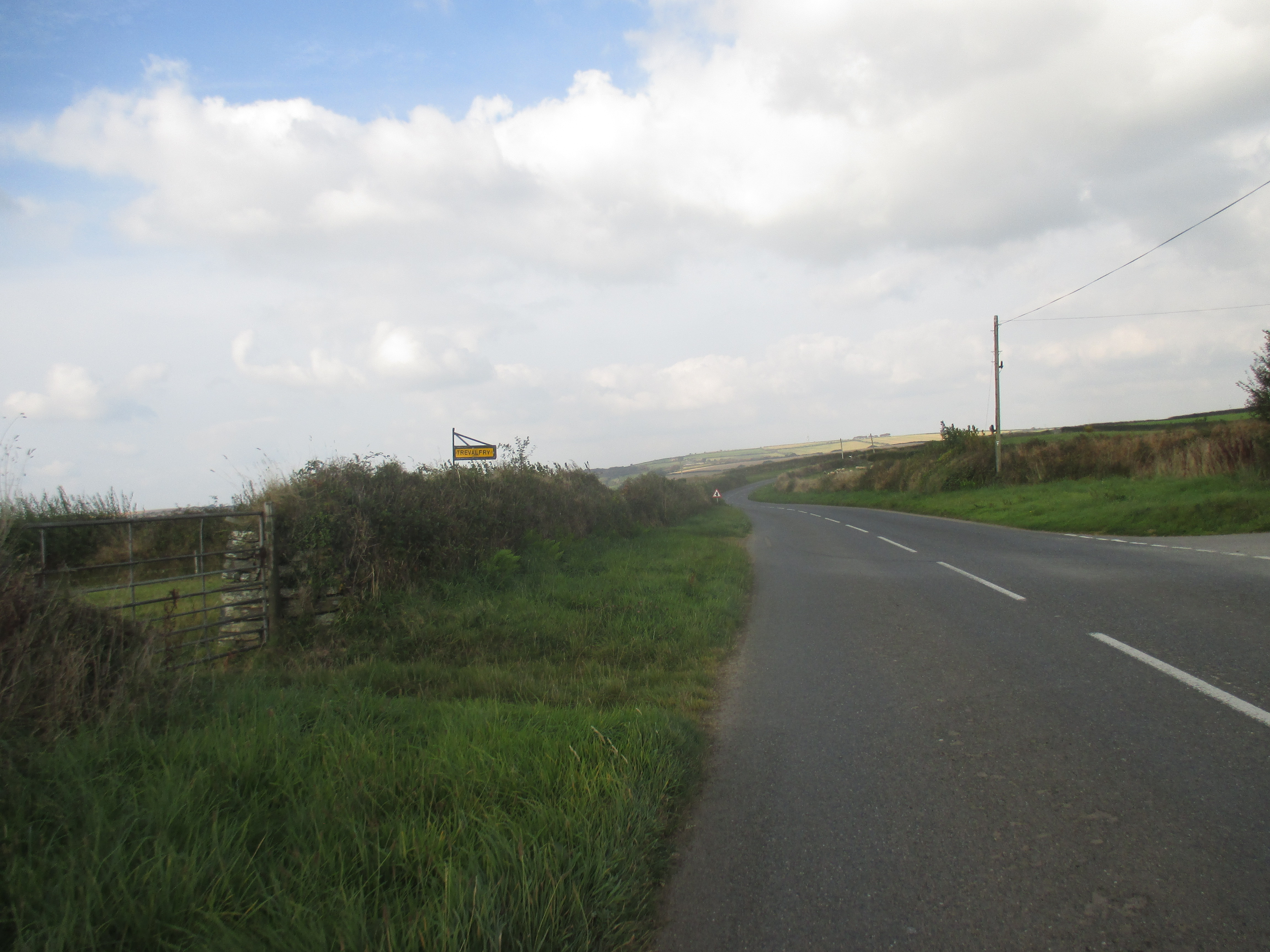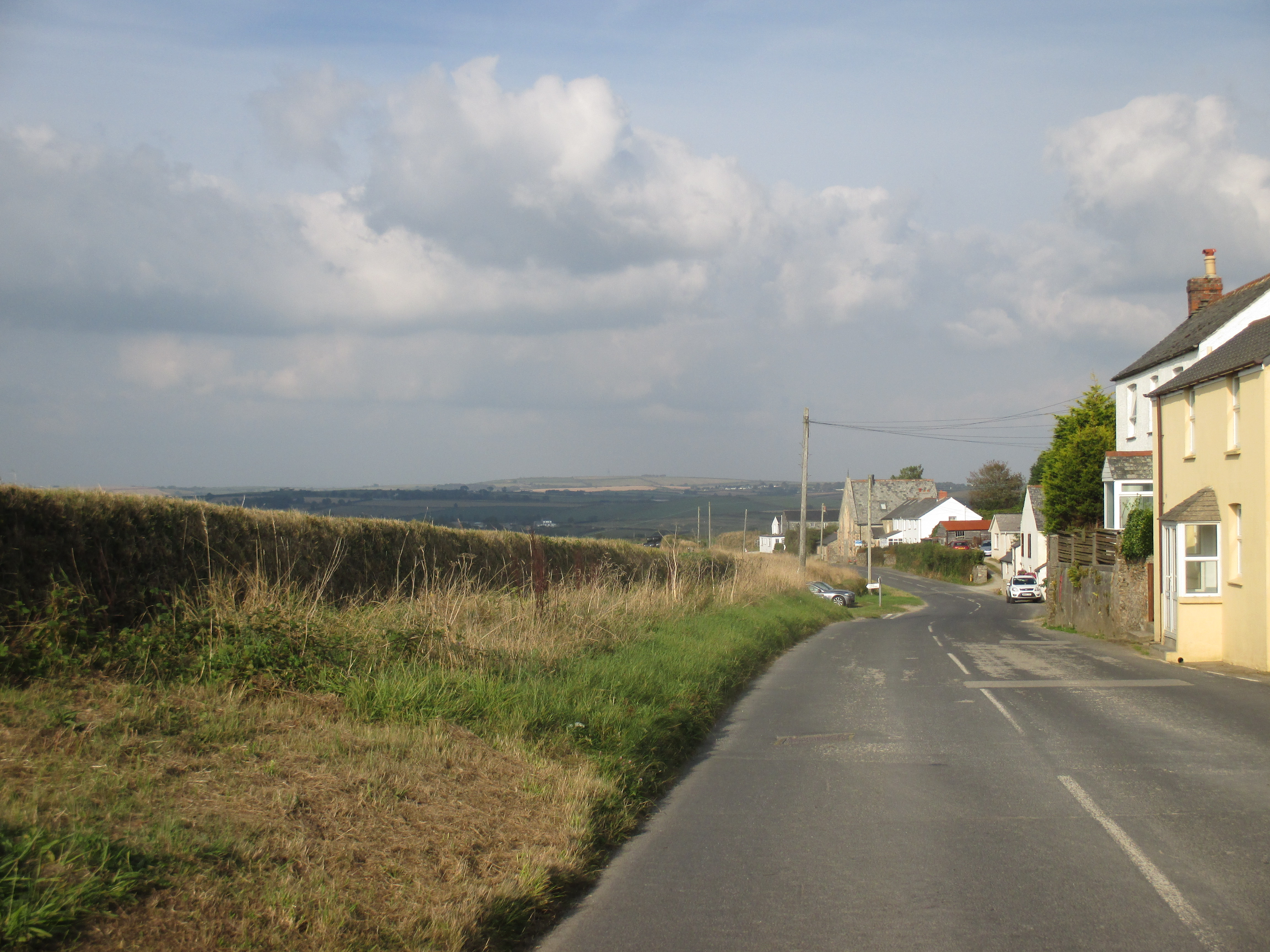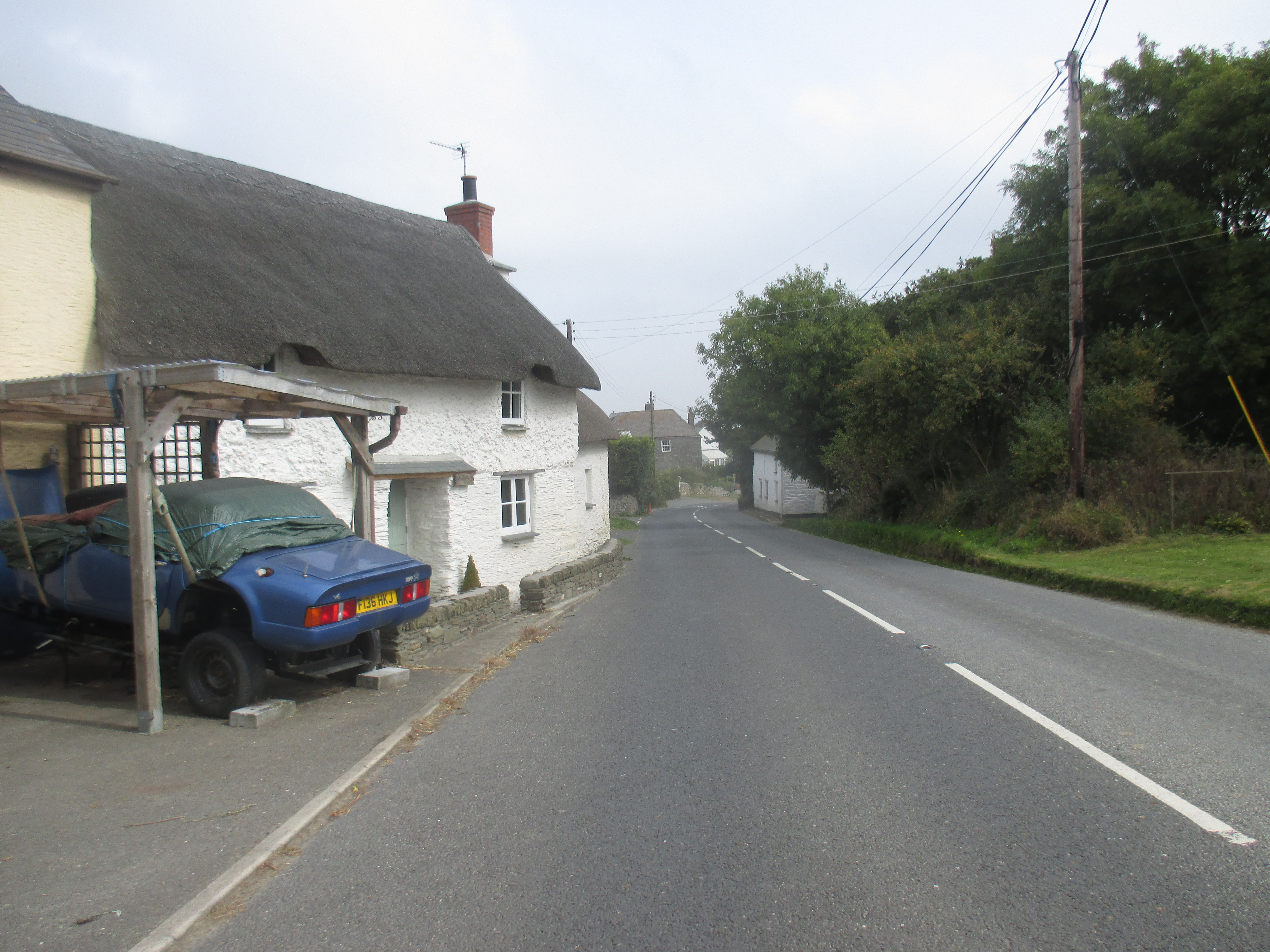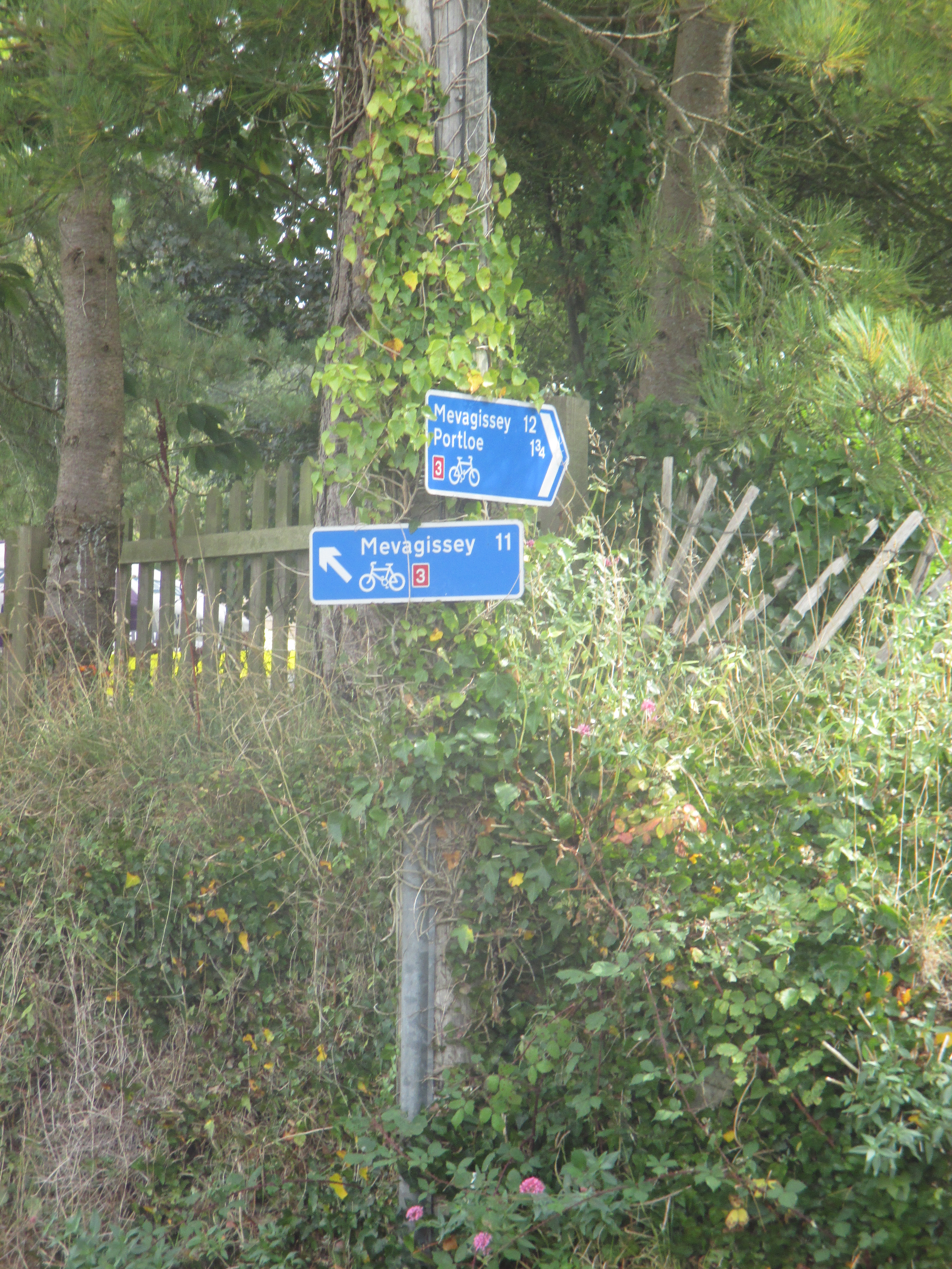 From St. Mawes I ride up and out towards St Austells, along a quiet and uninteresting country lane. There are undulating fields all around, but no drama to this scene, no wilderness, just hedgerows and tame fields, over and again. I’m riding through the Roseland, a remote and depopulated peninsula. Unlike the Lizard, Roseland’s rich in rural scenery. Villages with thatched roofs, a prissy community noticeboard, trestle-tables and jumble sales, then outside, small fields that suggest generational ownership, and bushes with blackberries that burst in one’s fingers. I ride out of St. Just and later, Veryan, then lose track of the eastward trail, veering up to the larger village of Tregony before following a road towards St. Austell. The scenery’s pleasant but little stays in mind. Mind drifting into itself, I decide to skip the old fishing village of Mevagissey on the eastern coastline and push on.