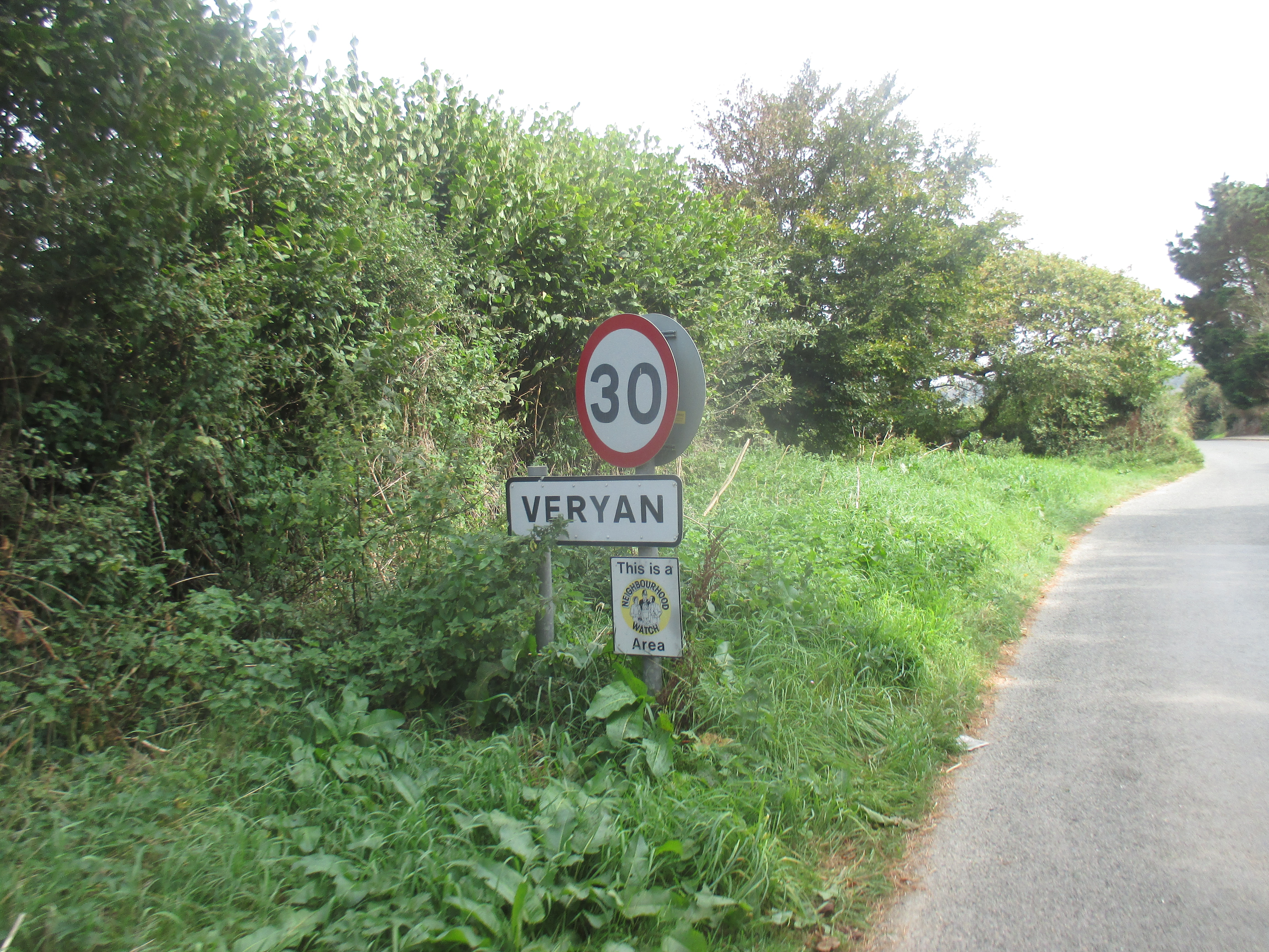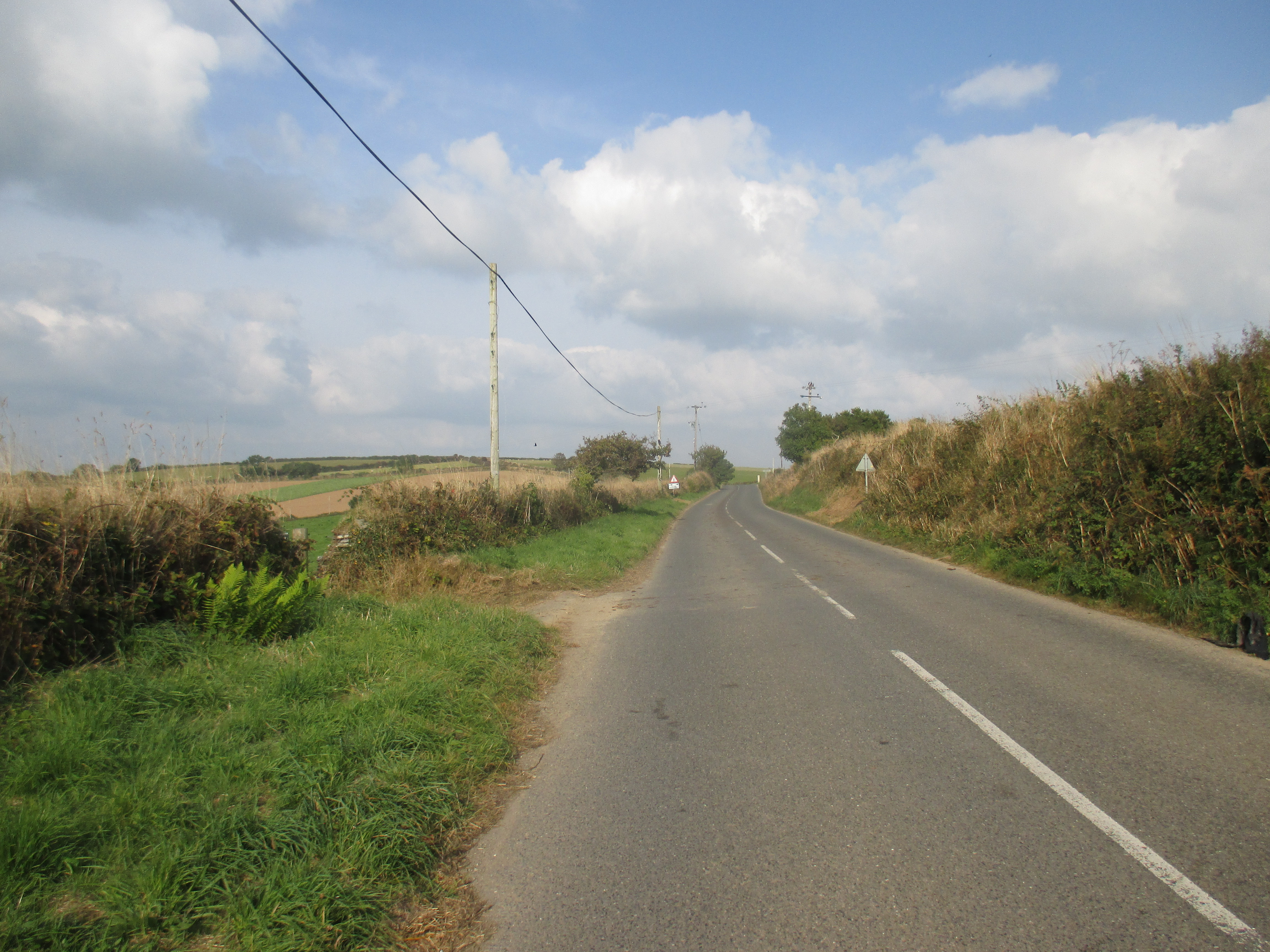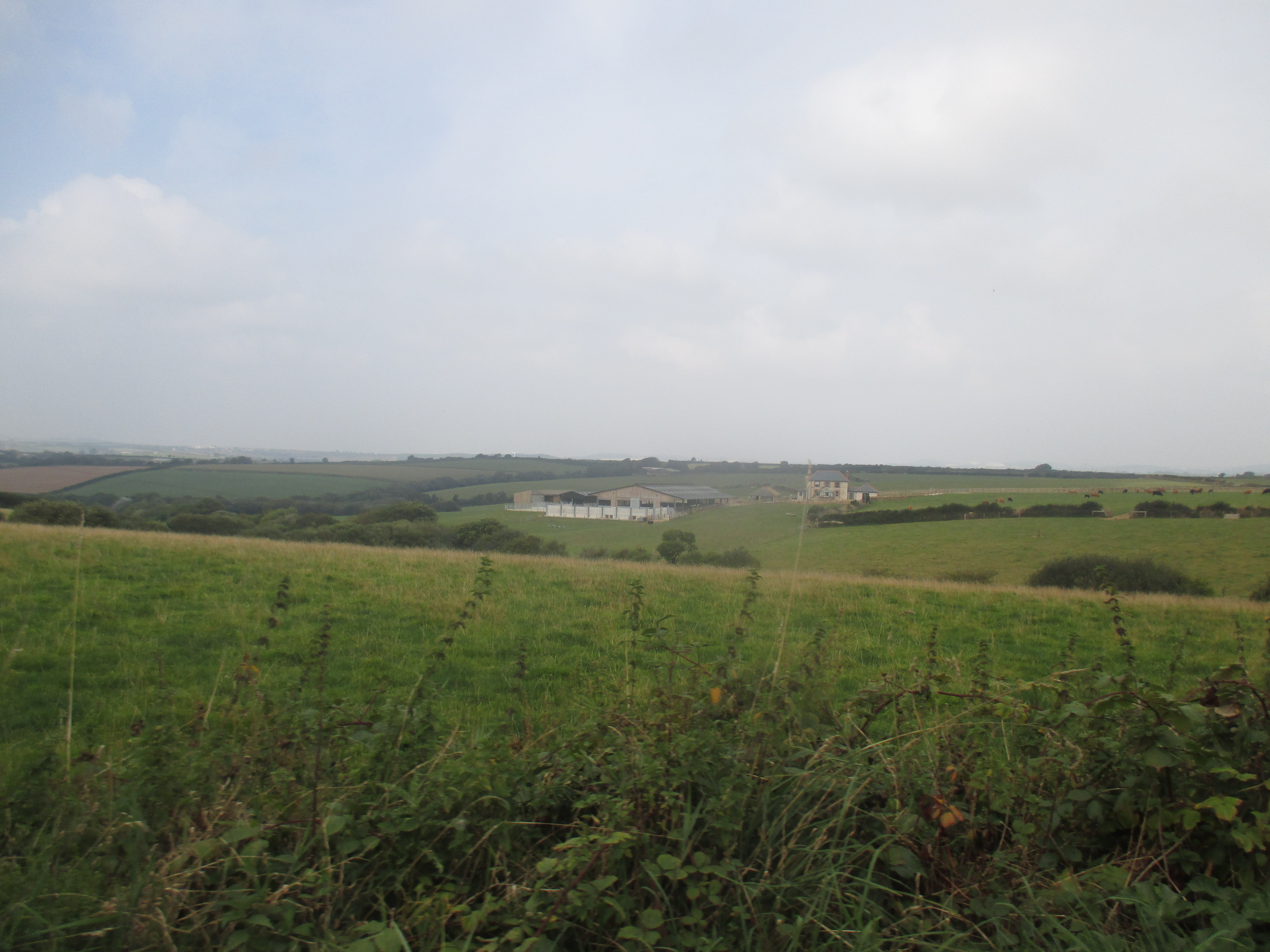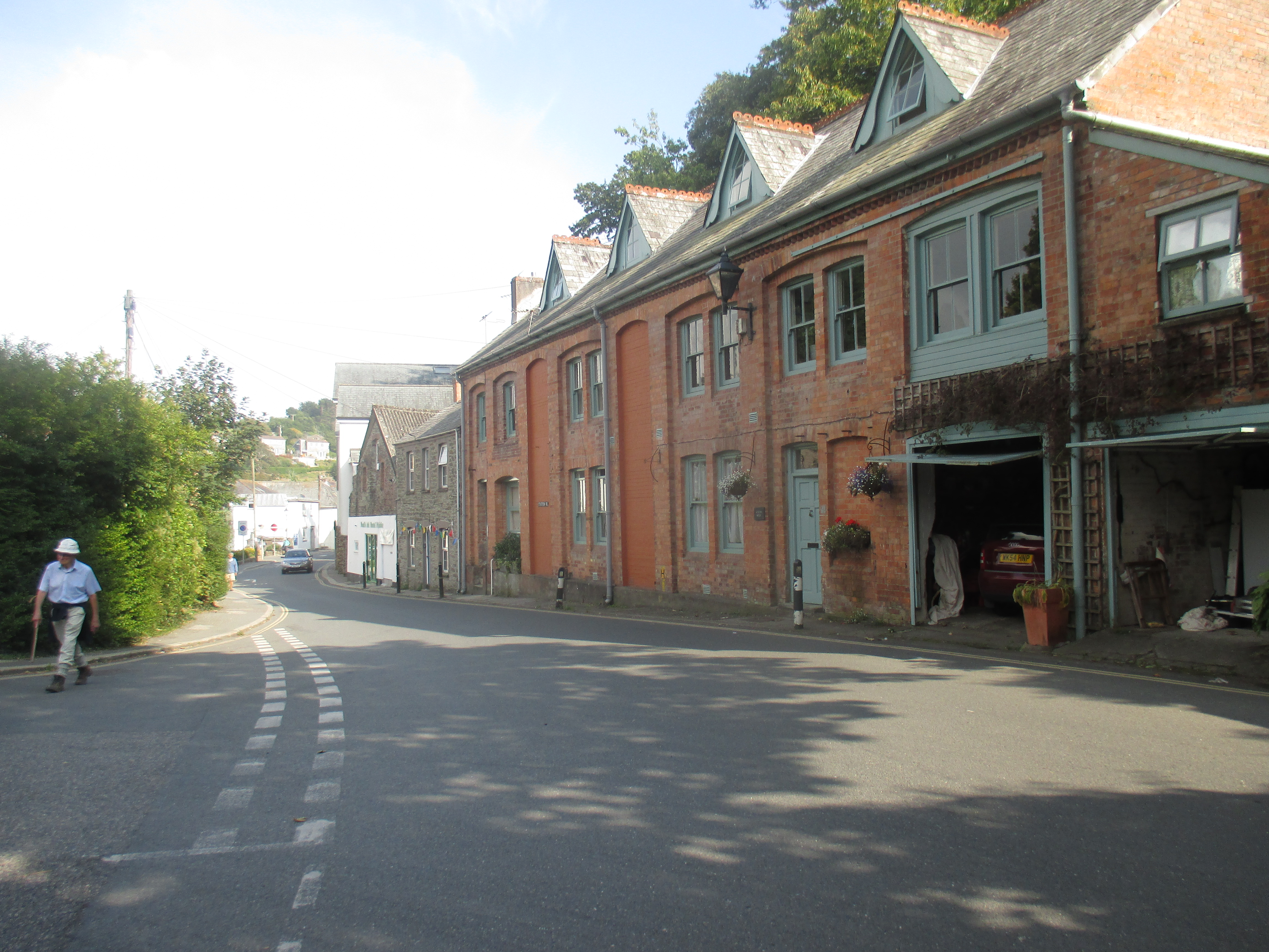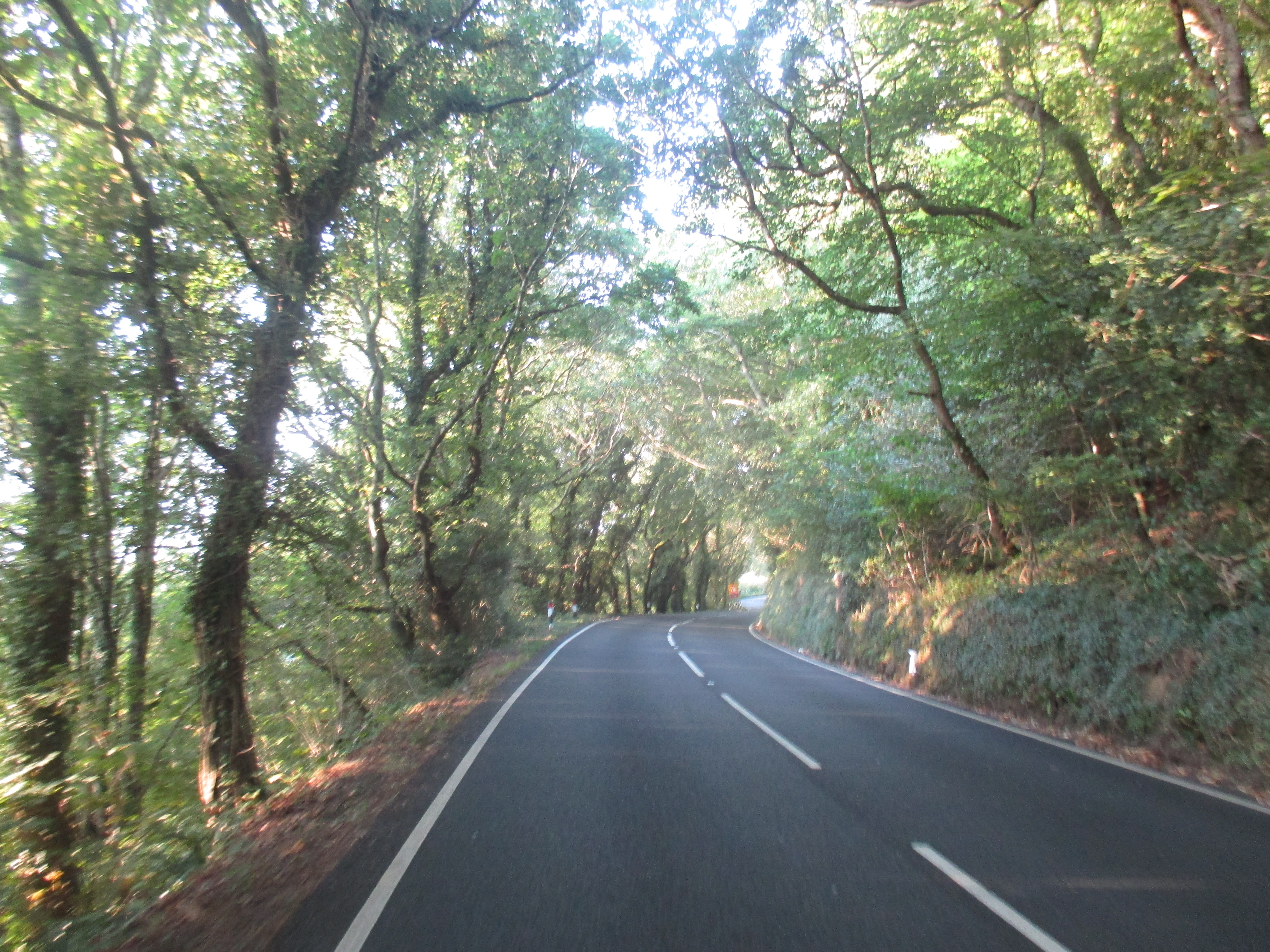 From St. Mawes I ride up and out towards St Austells, along a quiet and uninteresting country lane. There are undulating fields all around, but no drama to this scene, no wilderness, just hedgerows and tame fields, over and again. I’m riding through the Roseland, a remote and depopulated peninsula. Unlike the Lizard, Roseland’s rich in rural scenery. Villages with thatched roofs, a prissy community noticeboard, trestle-tables and jumble sales, then outside, small fields that suggest generational ownership, and bushes with blackberries that burst in one’s fingers. I ride out of St. Just and later, Veryan, then lose track of the eastward trail, veering up to the larger village of Tregony before following a road towards St. Austell. The scenery’s pleasant but little stays in mind. Mind drifting into itself, I decide to skip the old fishing village of Mevagissey on the eastern coastline and push on.
