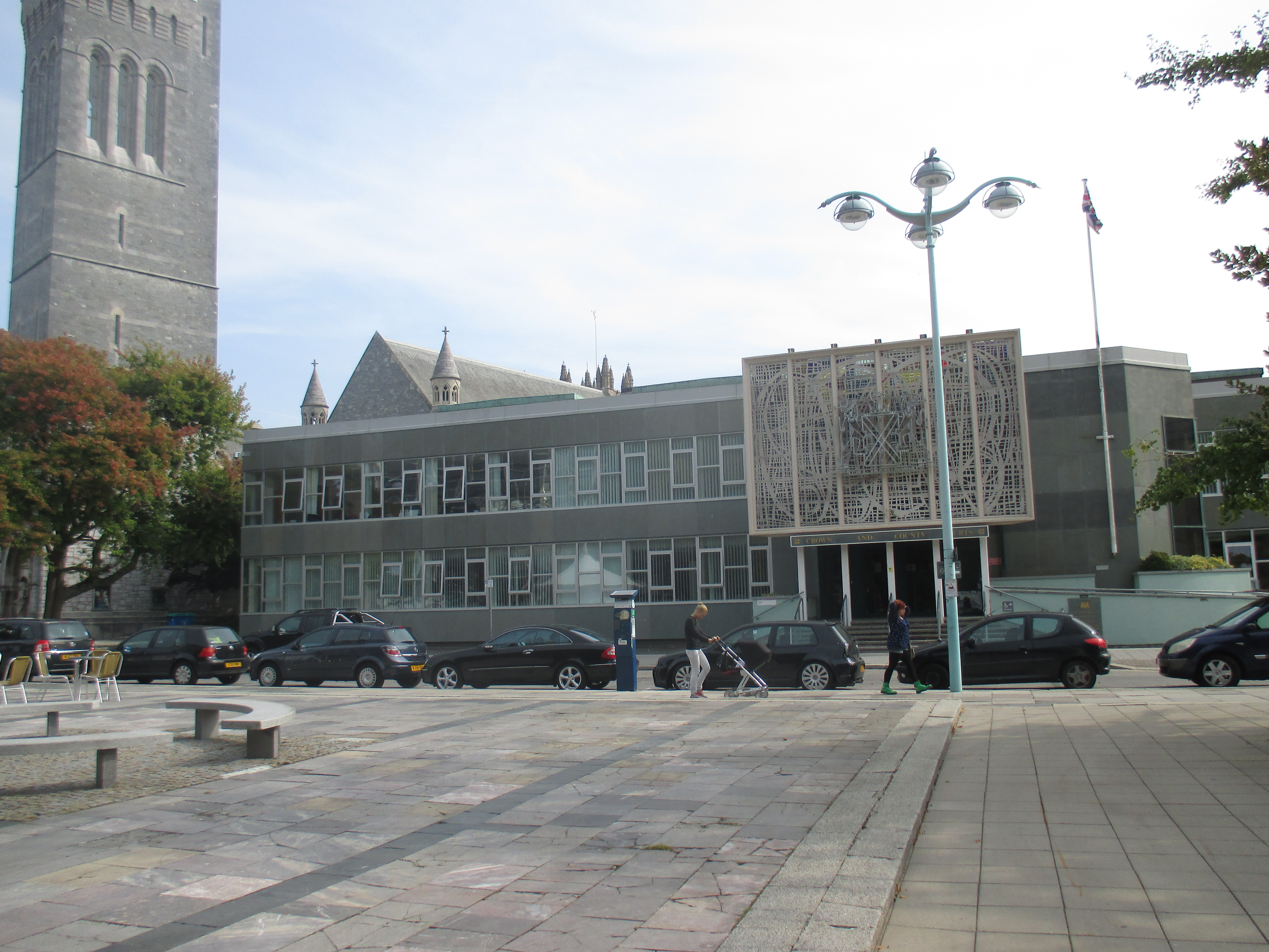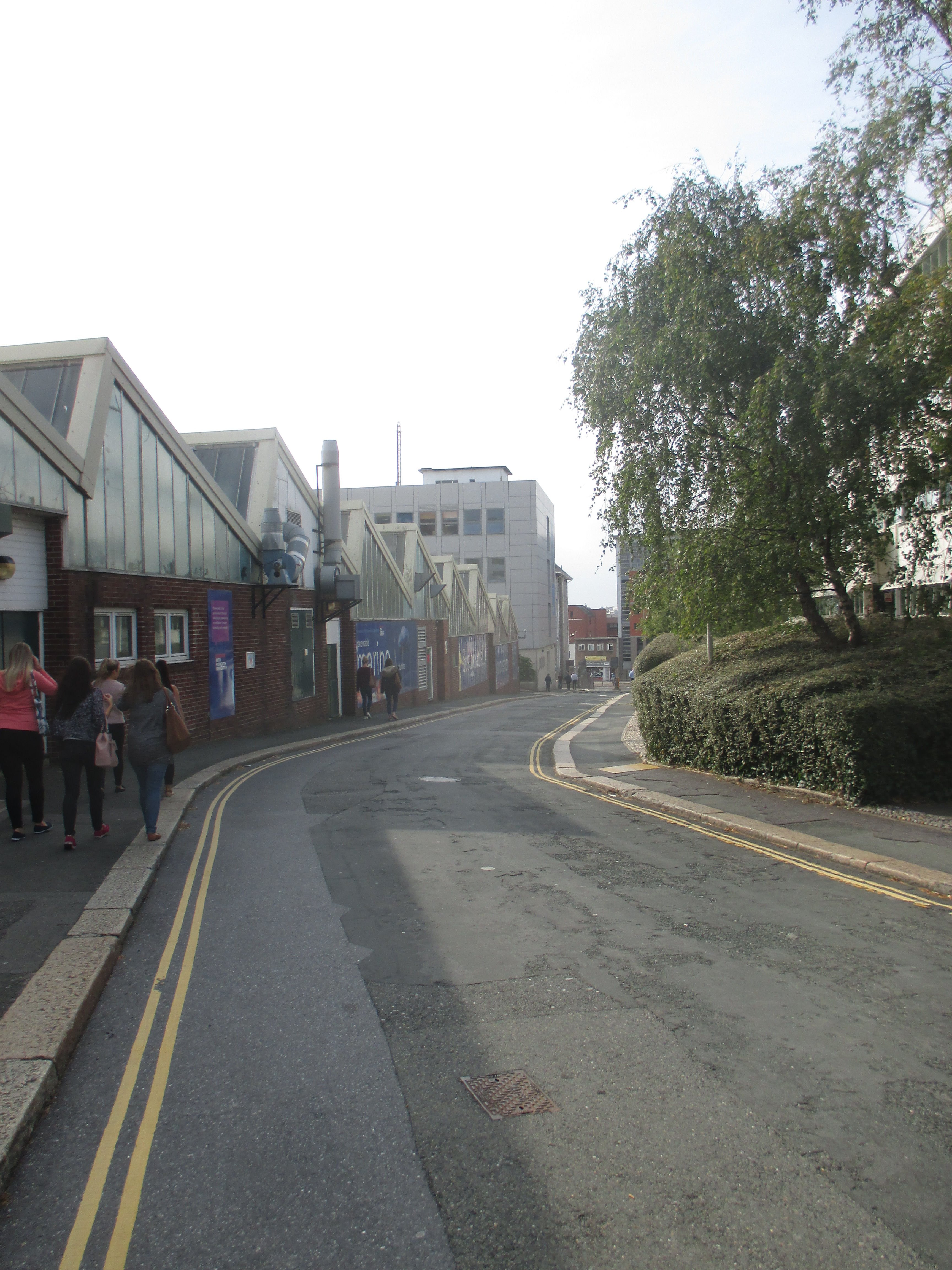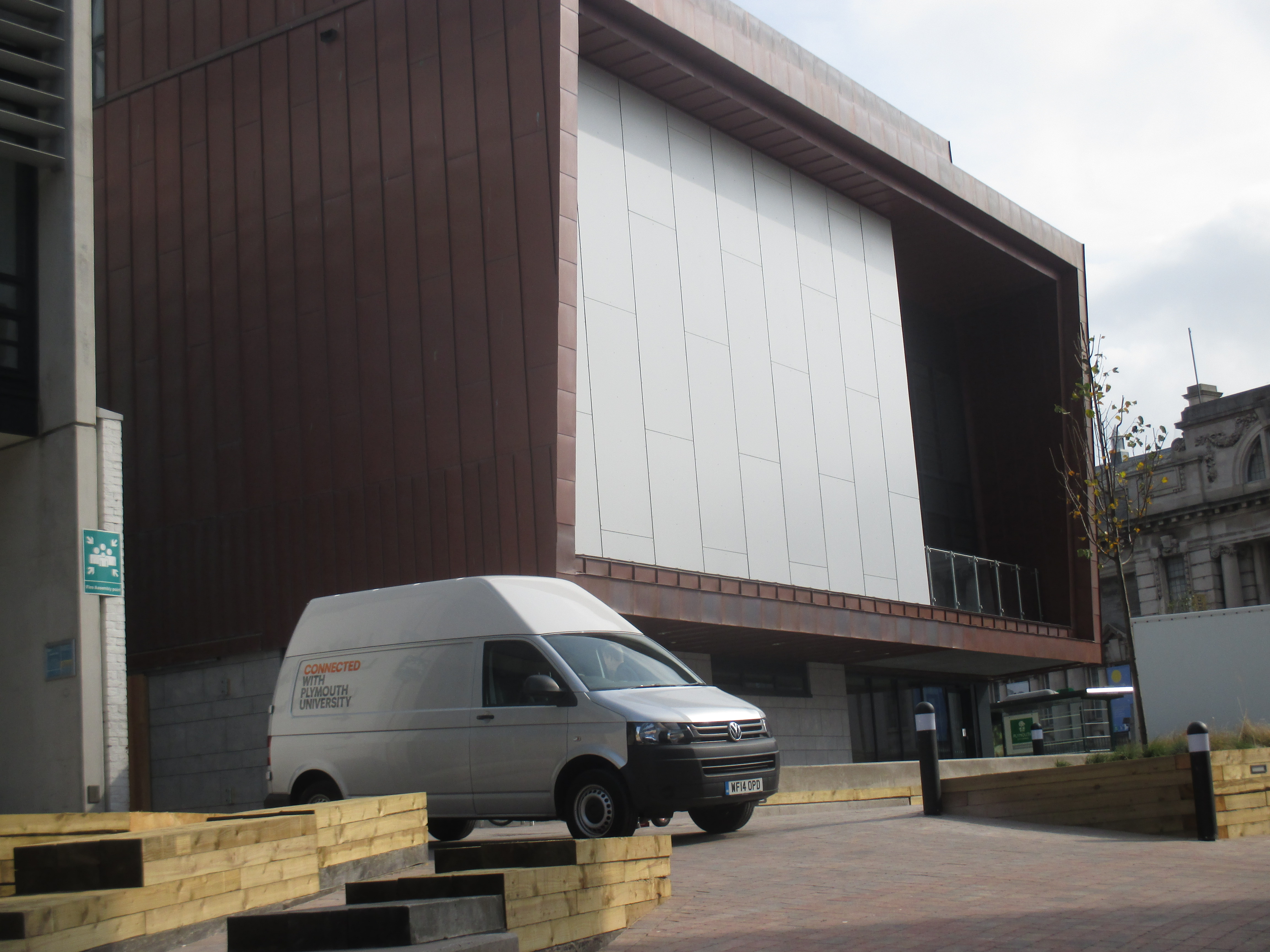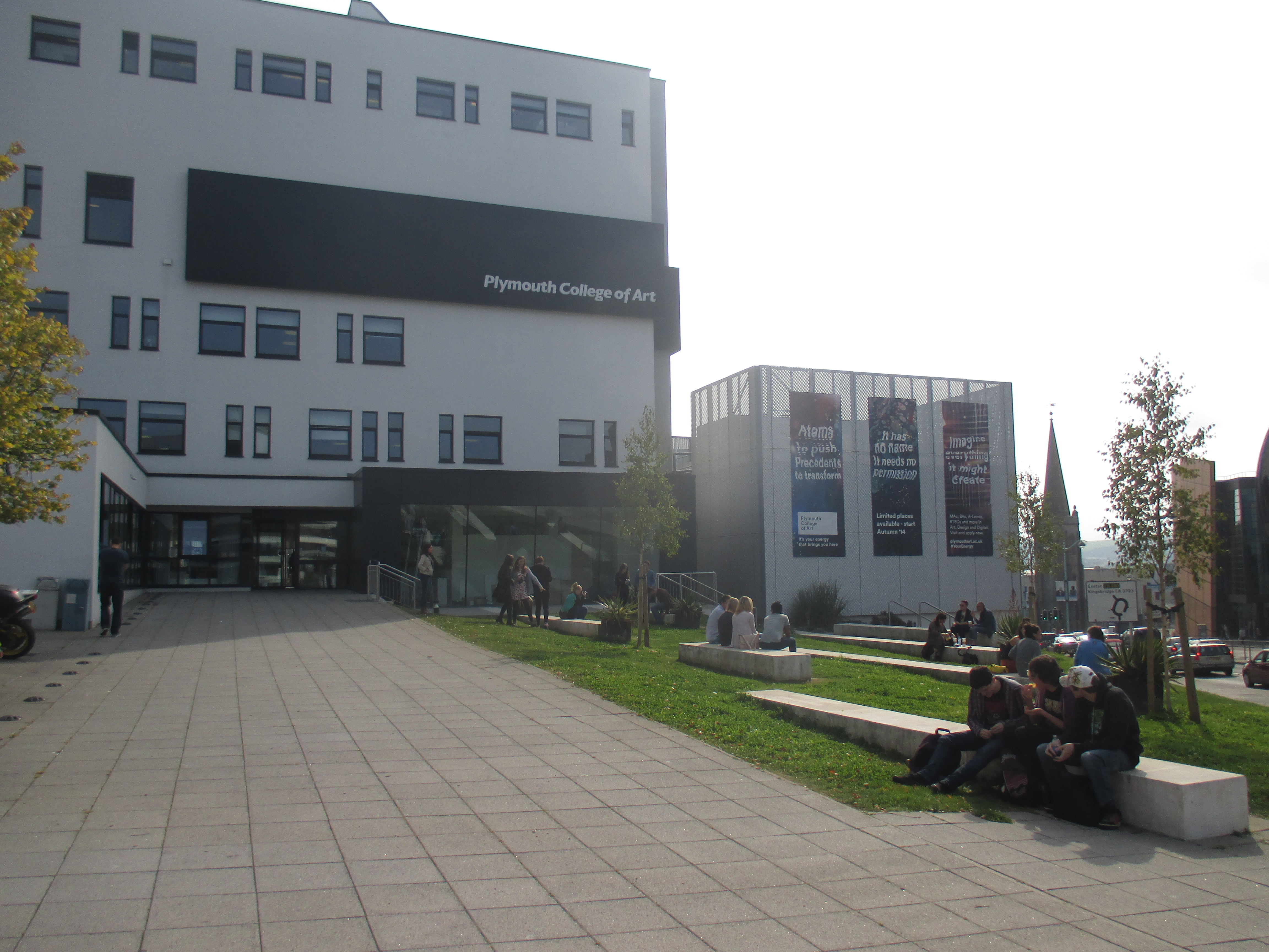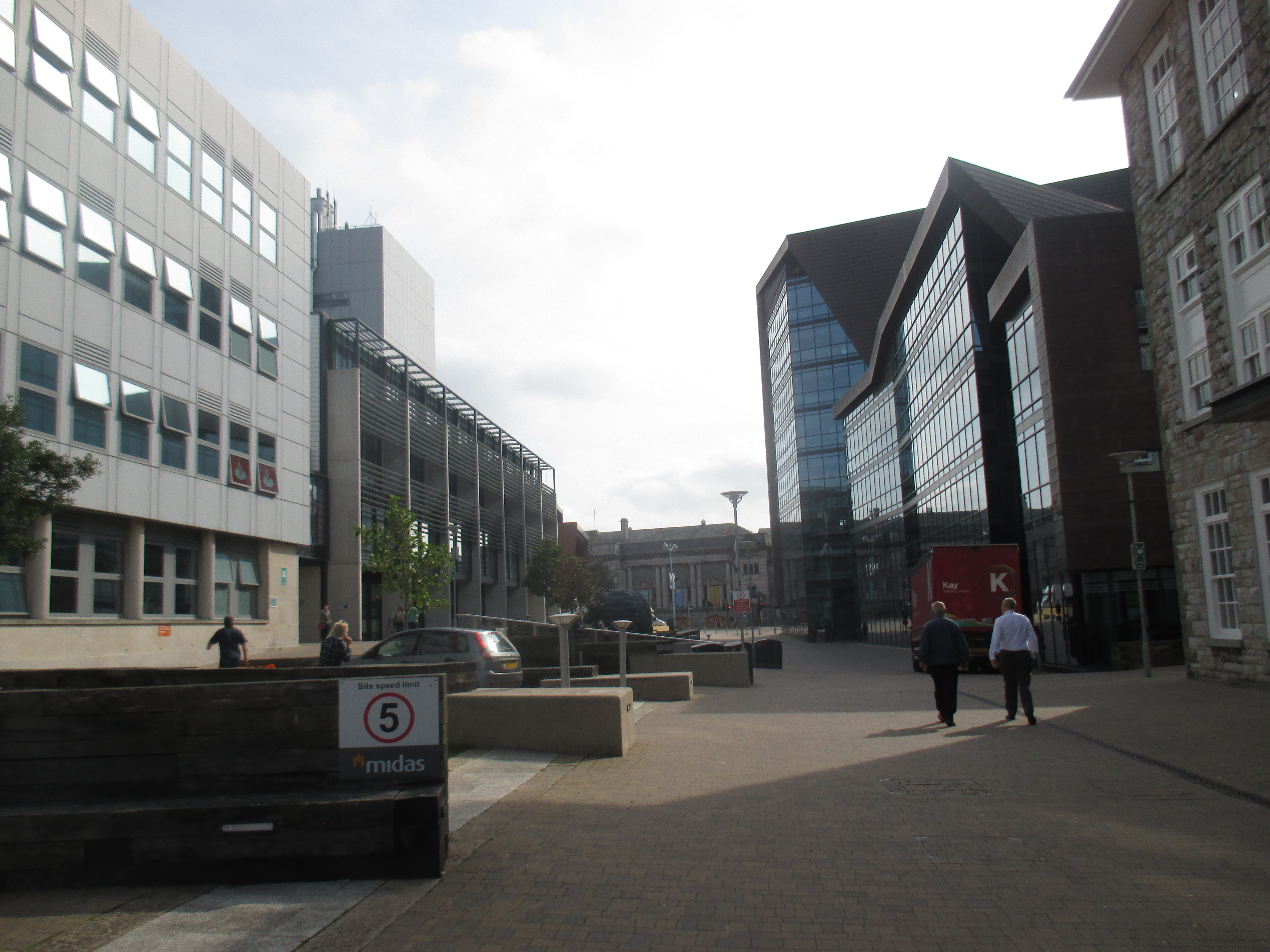 Time to explore Plymouth. Cycling out, I ride out from a sloping street of Victorian terraced townhouses and towards the university area, sandwiched roughly between myself and the town centre. Past the student lets, I’m immediately assailed by a jamboree of architectural styles and moods, from Blair-era glass boxes with ‘wacky’ curves or the jagged roofs and wire mesh glass of clunky mock-factory university workshops to the baroque Wrenaissance of the Edwardian city gallery and library. James Street makes no sense at all. The city cannot blame being bombed to blazing ashes by the Luftwaffe for everything. There’s no design or planning coordination whatsoever, just competing expressions of commercial opportunism, passing fashion and vaguely functional intent. I like it. It’s a refreshing feature of British urbanism that one misses overseas, along with the illogical road-routes, broken pavements, memorial benches, and excessive street signs.