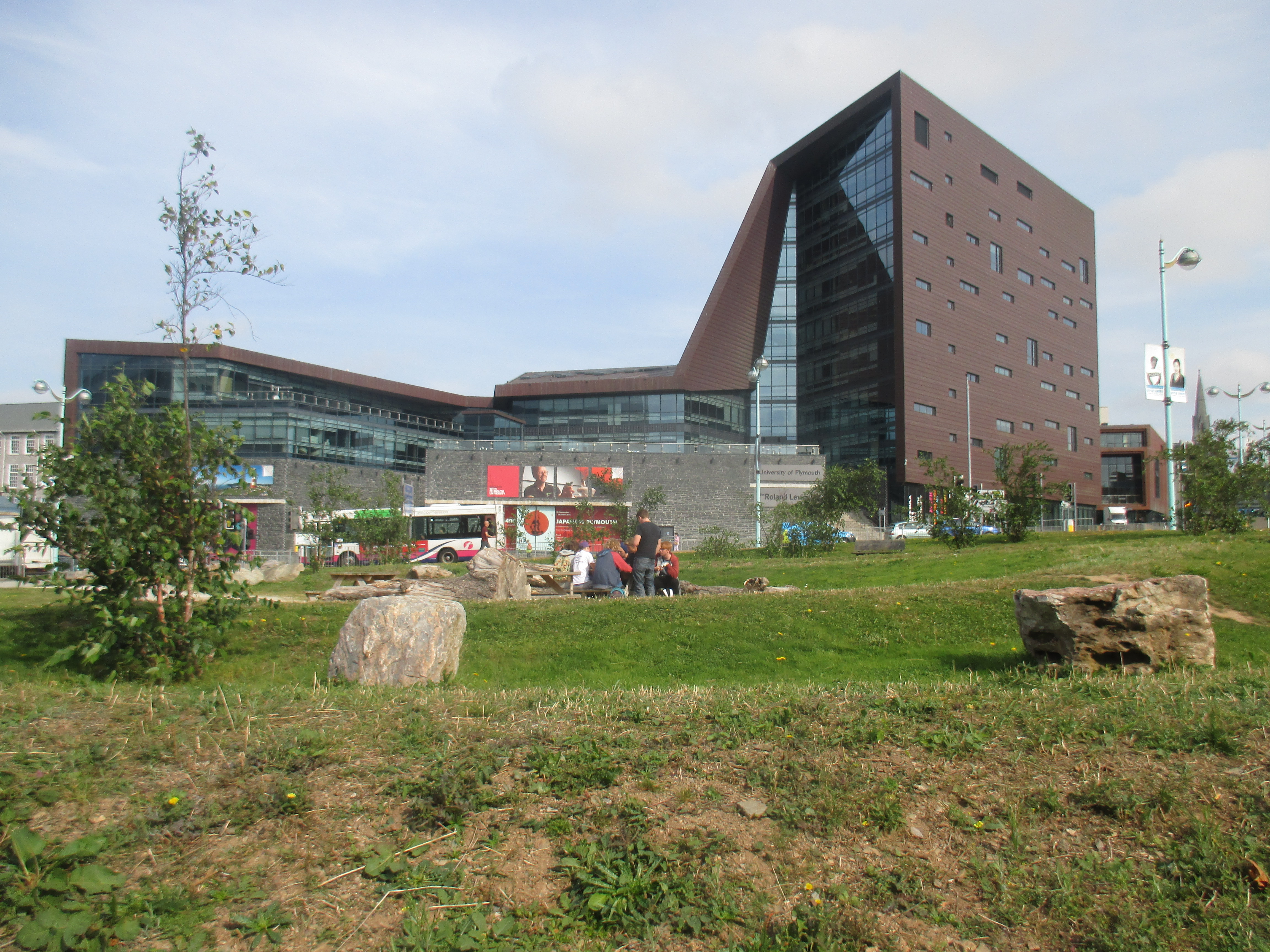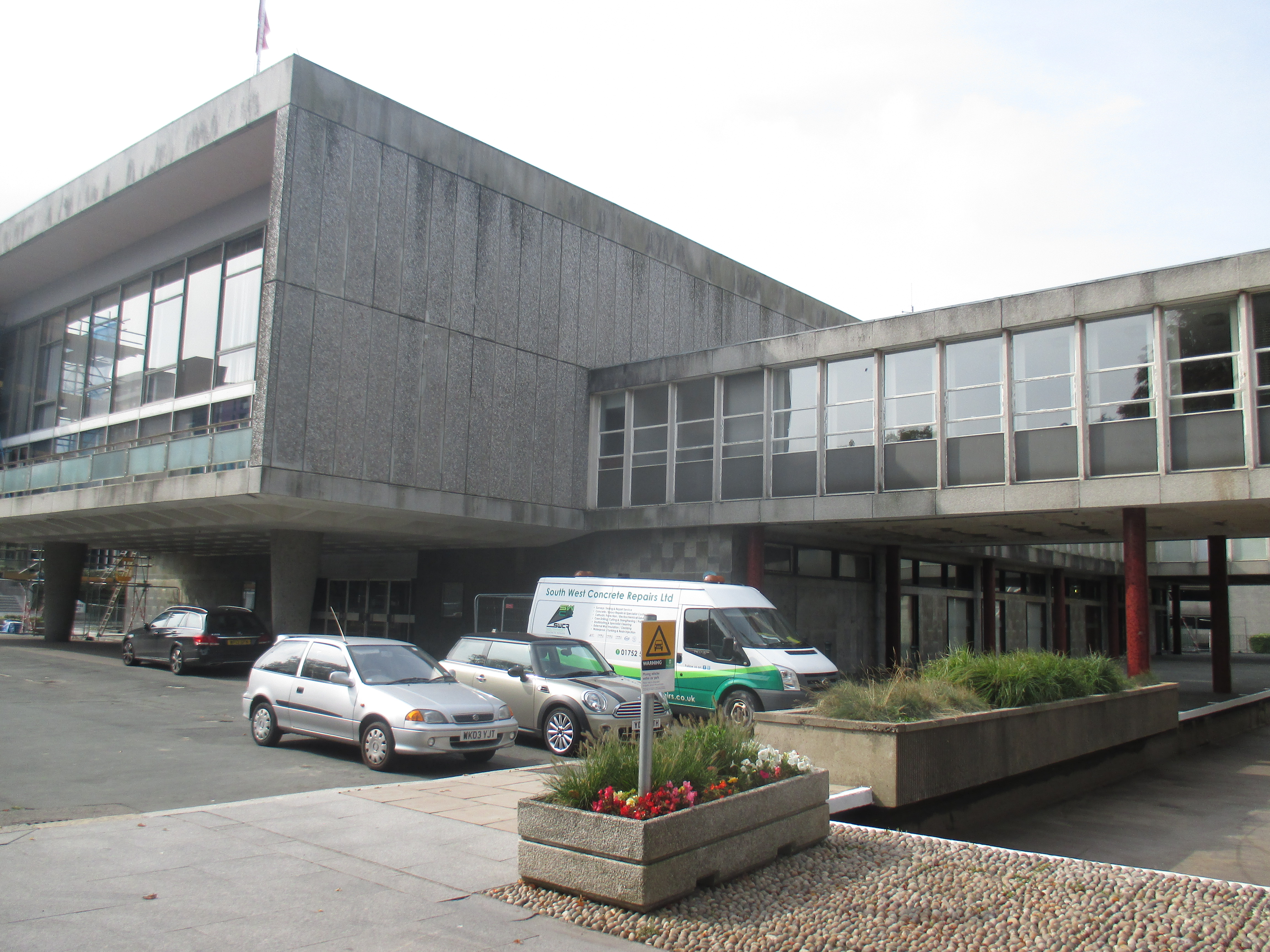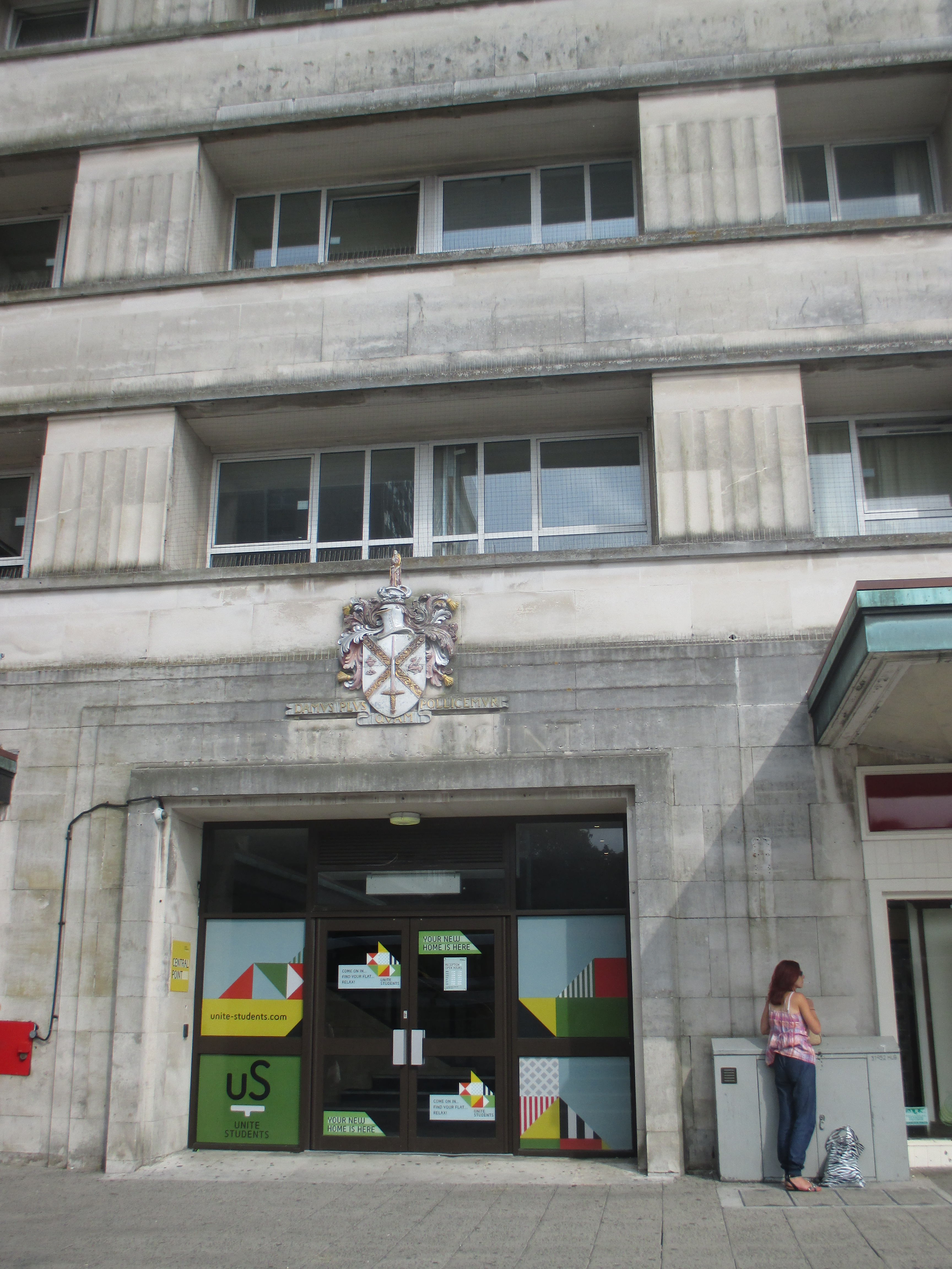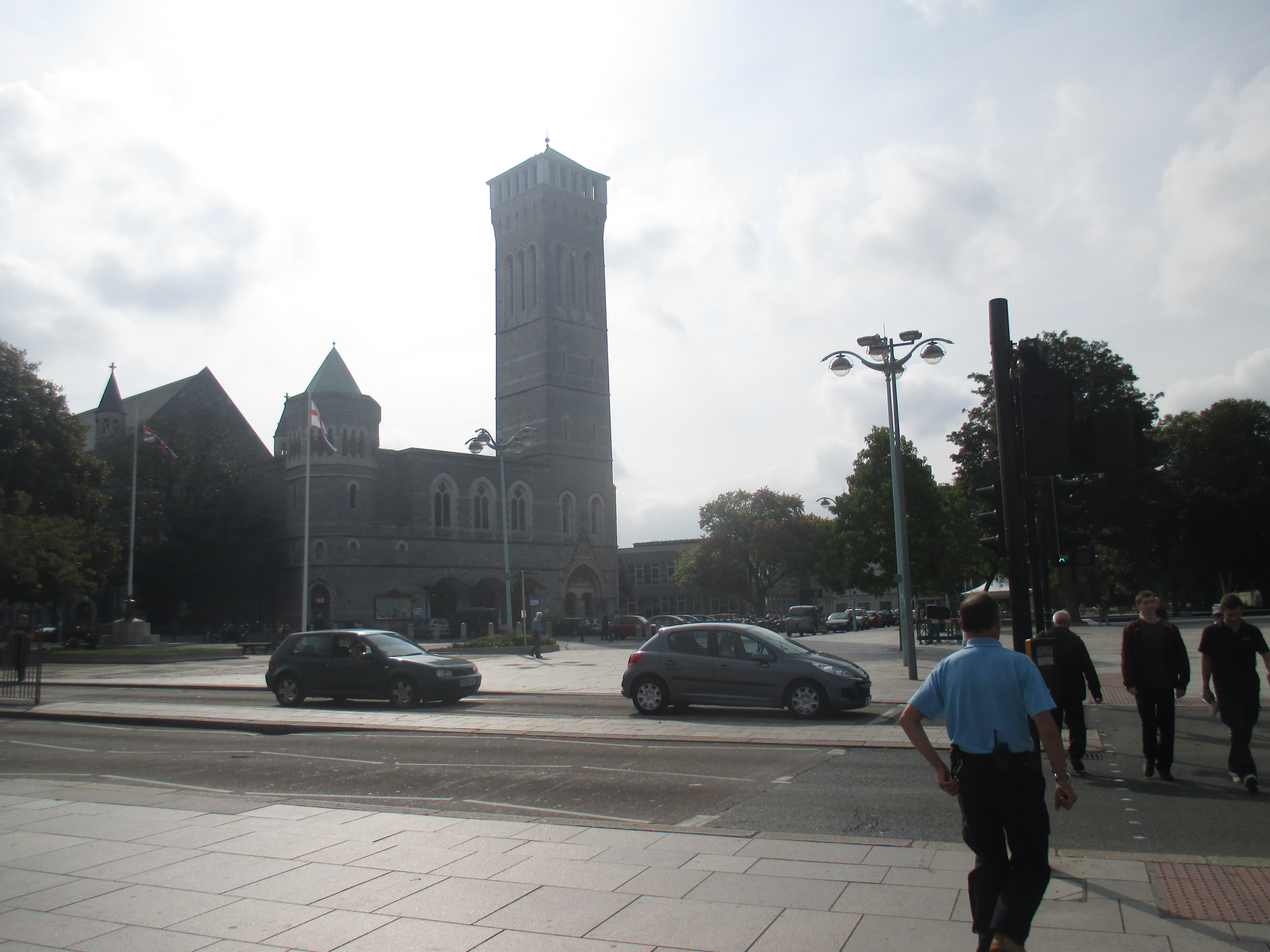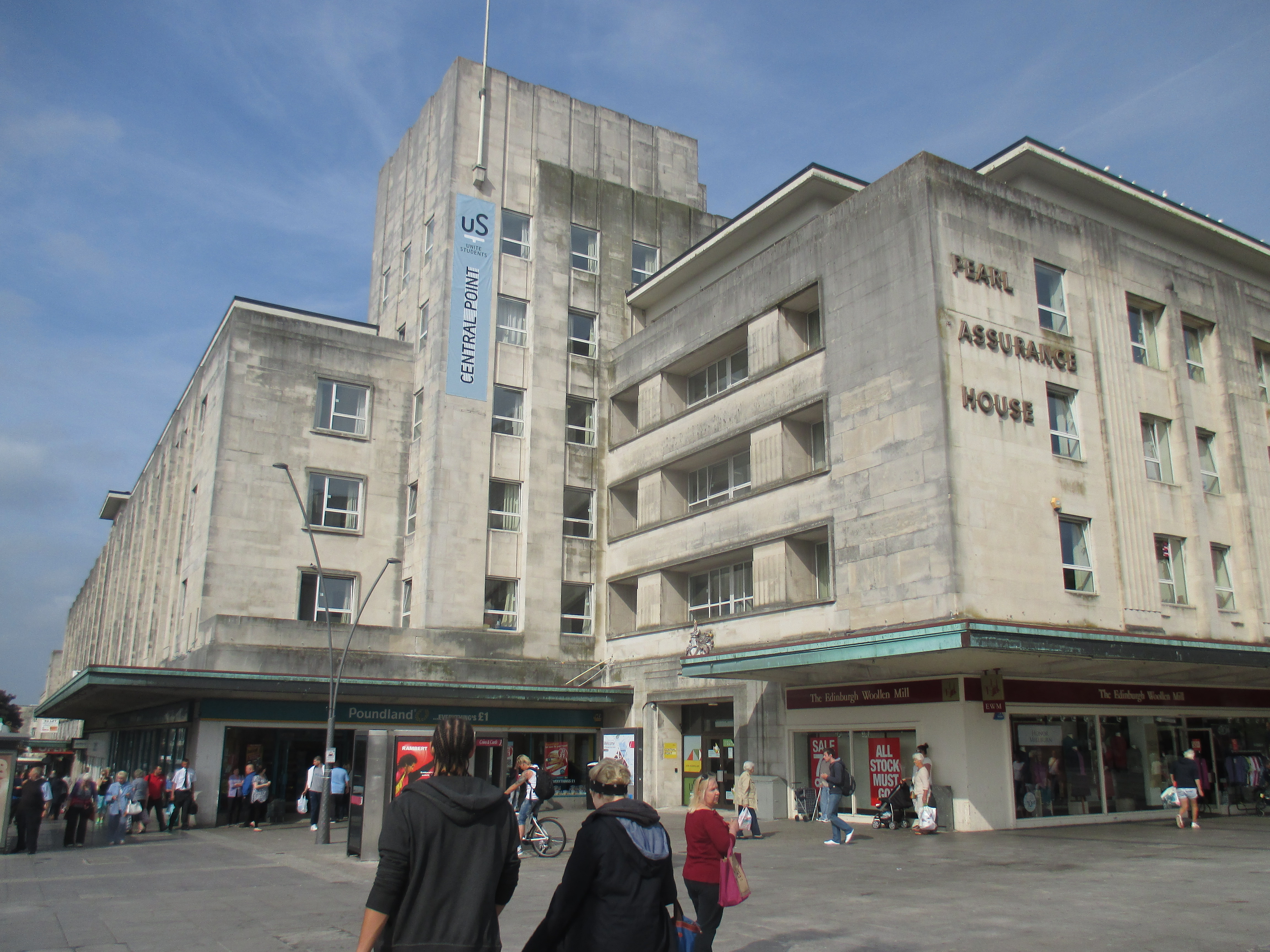 Time to explore Plymouth. Cycling out, I ride out from a sloping street of Victorian terraced townhouses and towards the university area, sandwiched roughly between myself and the town centre. Past the student lets, I’m immediately assailed by a jamboree of architectural styles and moods, from Blair-era glass boxes with ‘wacky’ curves or the jagged roofs and wire mesh glass of clunky mock-factory university workshops to the baroque Wrenaissance of the Edwardian city gallery and library. James Street makes no sense at all. The city cannot blame being bombed to blazing ashes by the Luftwaffe for everything. There’s no design or planning coordination whatsoever, just competing expressions of commercial opportunism, passing fashion and vaguely functional intent. I like it. It’s a refreshing feature of British urbanism that one misses overseas, along with the illogical road-routes, broken pavements, memorial benches, and excessive street signs.