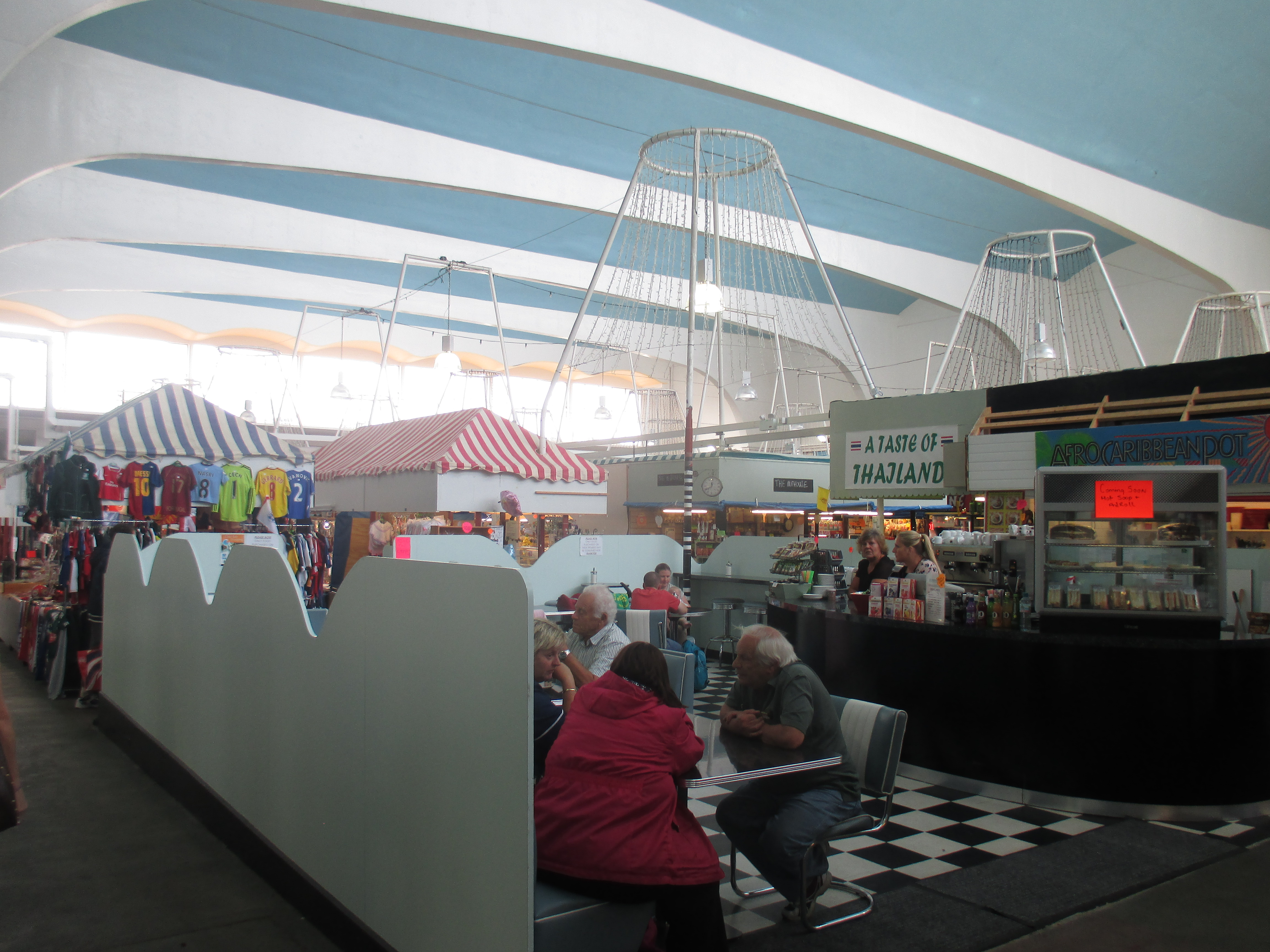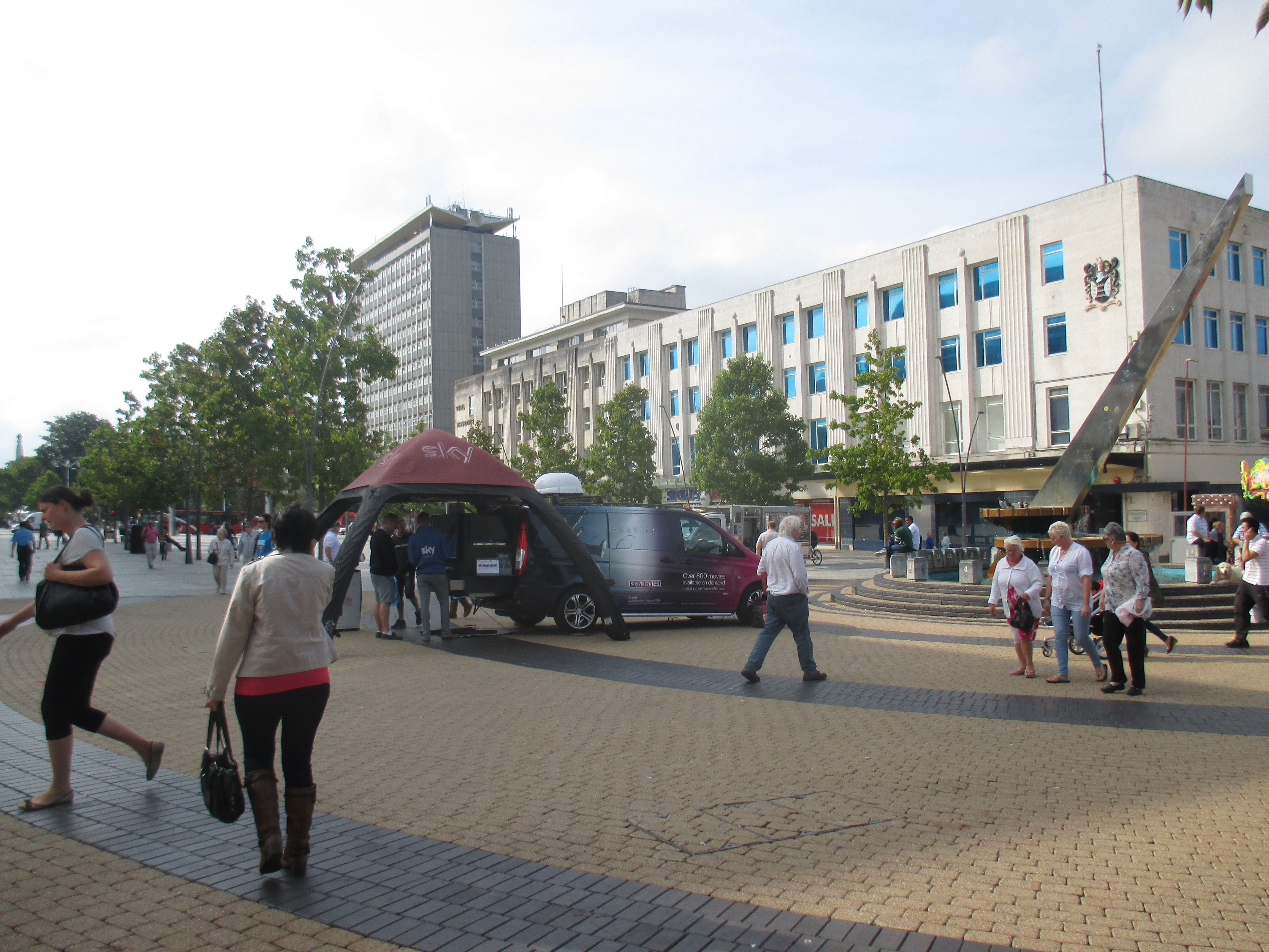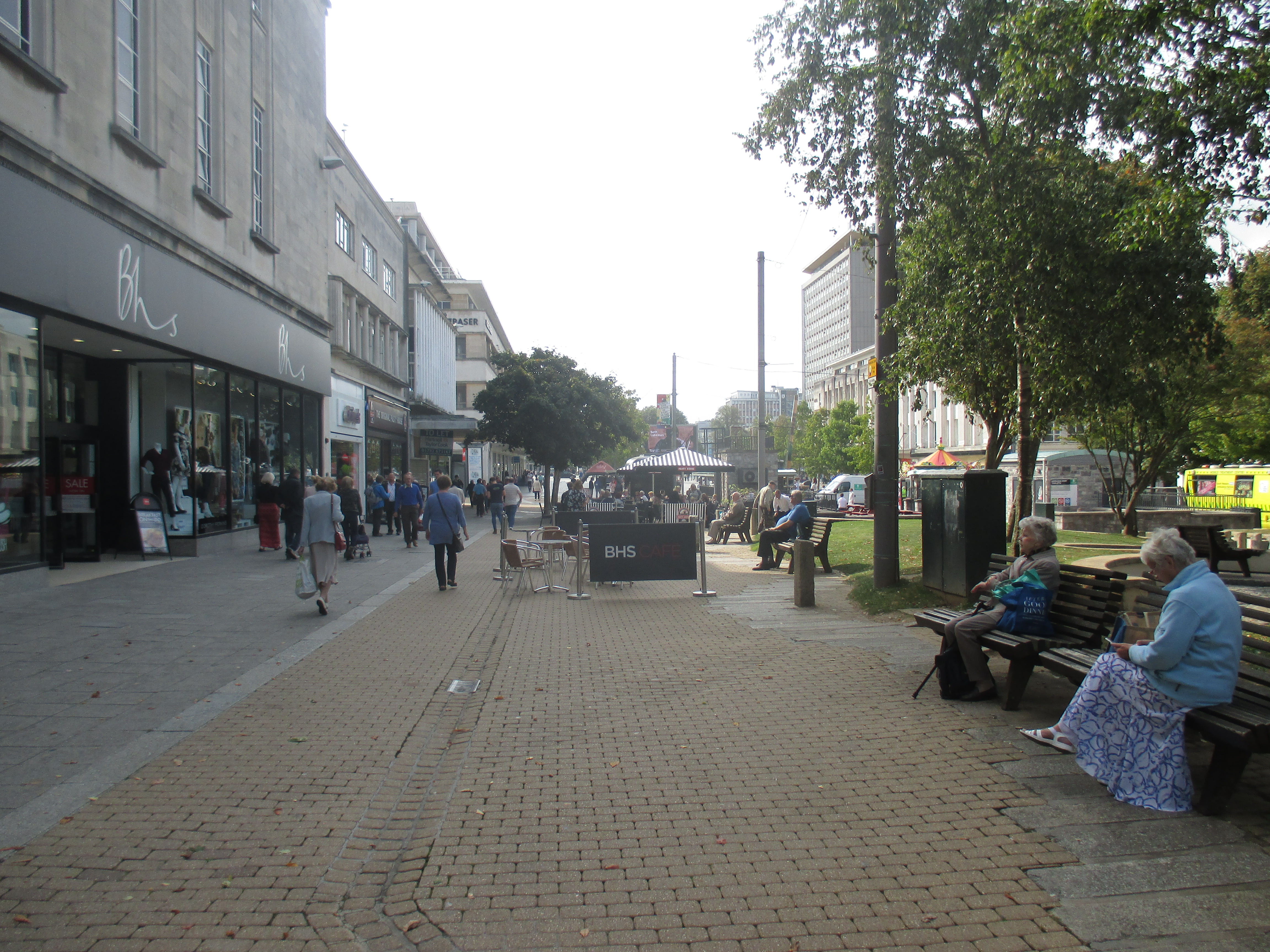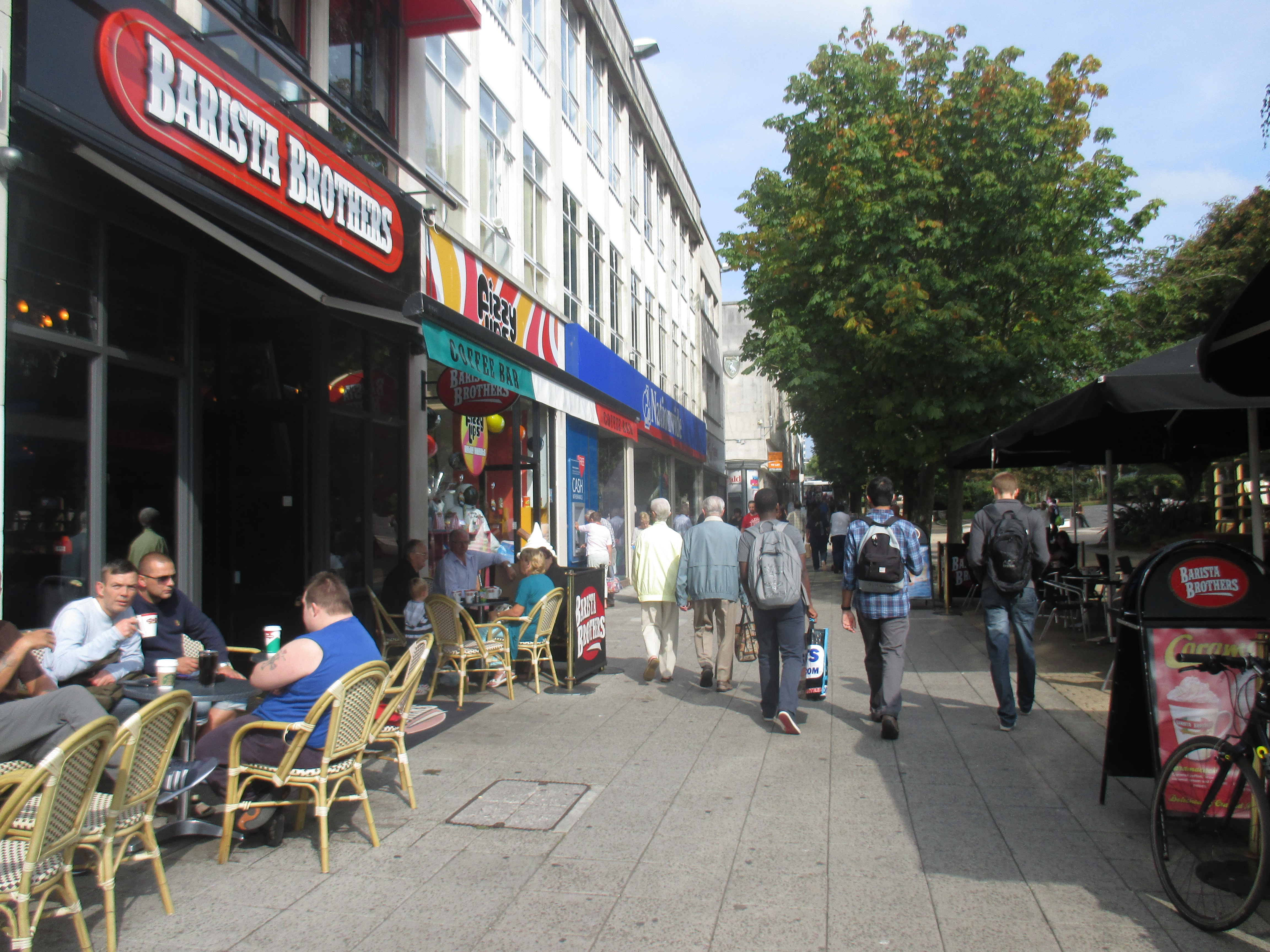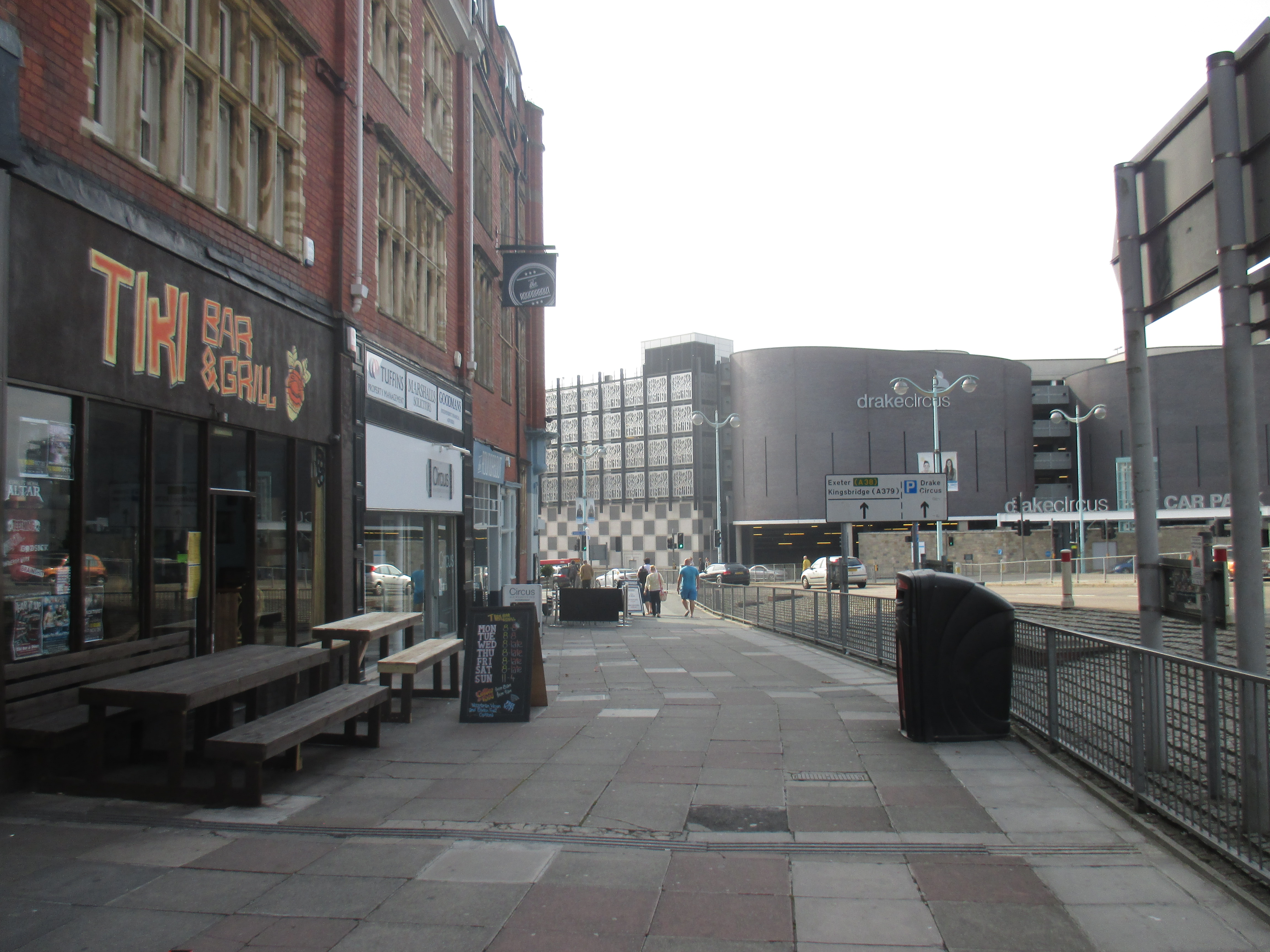 Well, leaving aside the snobbery implicit in a term like ‘lumpen’, I don’t find anything that reinforces this view, quite the opposite. The town centre’s planning is a little incoherent, and Abercrombie’s stamp is certainly on the godawful major road that snakes around the centre, but the town itself is pleasant and enjoyable, its people friendly, the streets relatively clean and safe, and overall easy to navigate. But its style is unusually populist: there are no statues or monuments to great men (here that is– there certainly are some just up the way…), few worthy plaques or vantage-points to scrutinise the lowly masses from a melancholy height. Cheap and cheery is the feeling, certainly. And why not? Why should these people, or, let me take off the mask, why should we be judged en masse because we might happen to enjoy spaces like these? Why should we feel shame about enjoying a bargain, eating fast food, having a pint, or not taking the world too seriously? Of course, were I to describe Plymouth as how its residents describe it, it would be an ugly, noisy, dangerous, crime-plagued but ultimately yeah…alright! place. The same might be said of Manchester, or Glasgow, or London by its people. There’s a certain pleasure in moaning too!