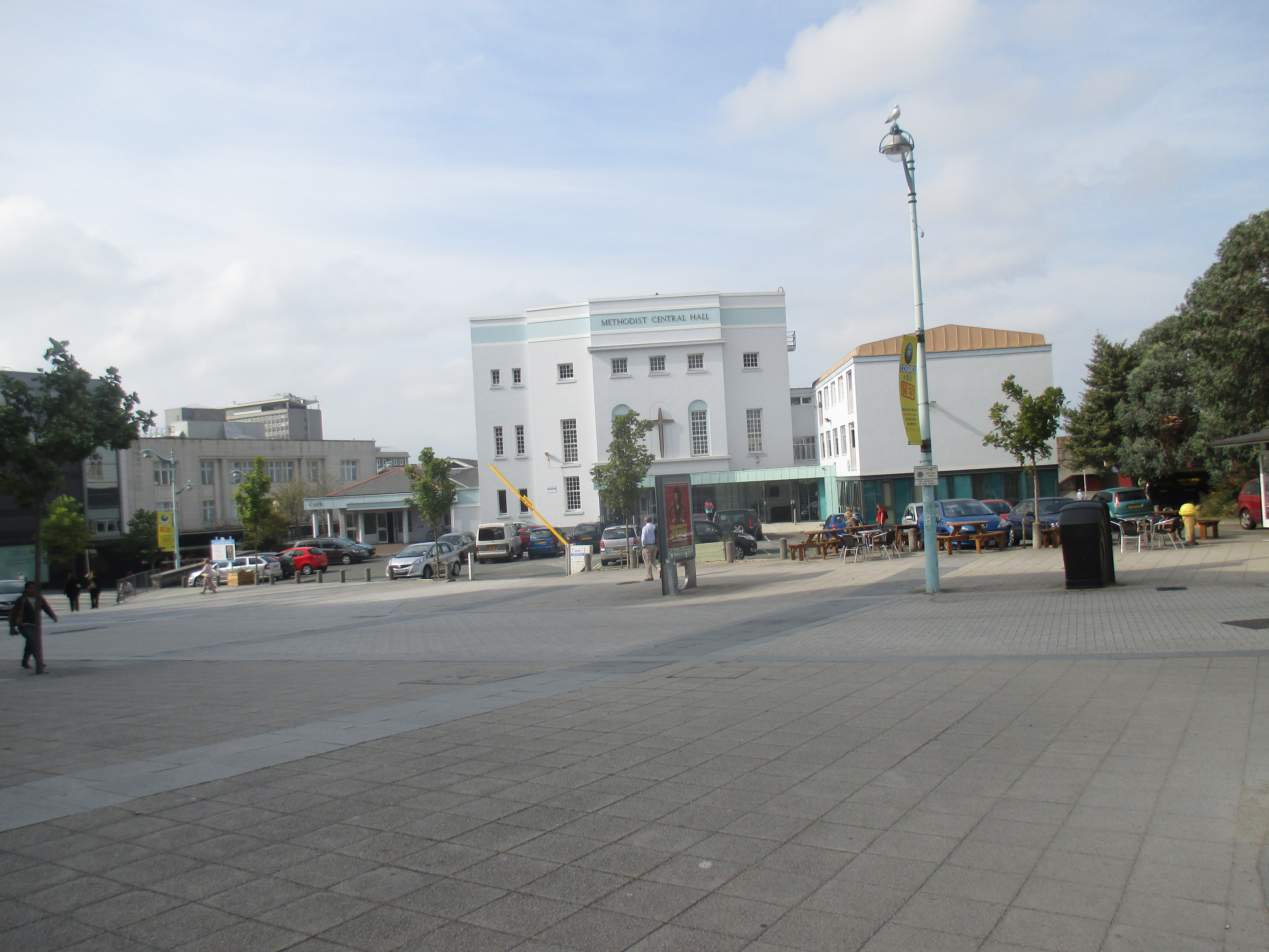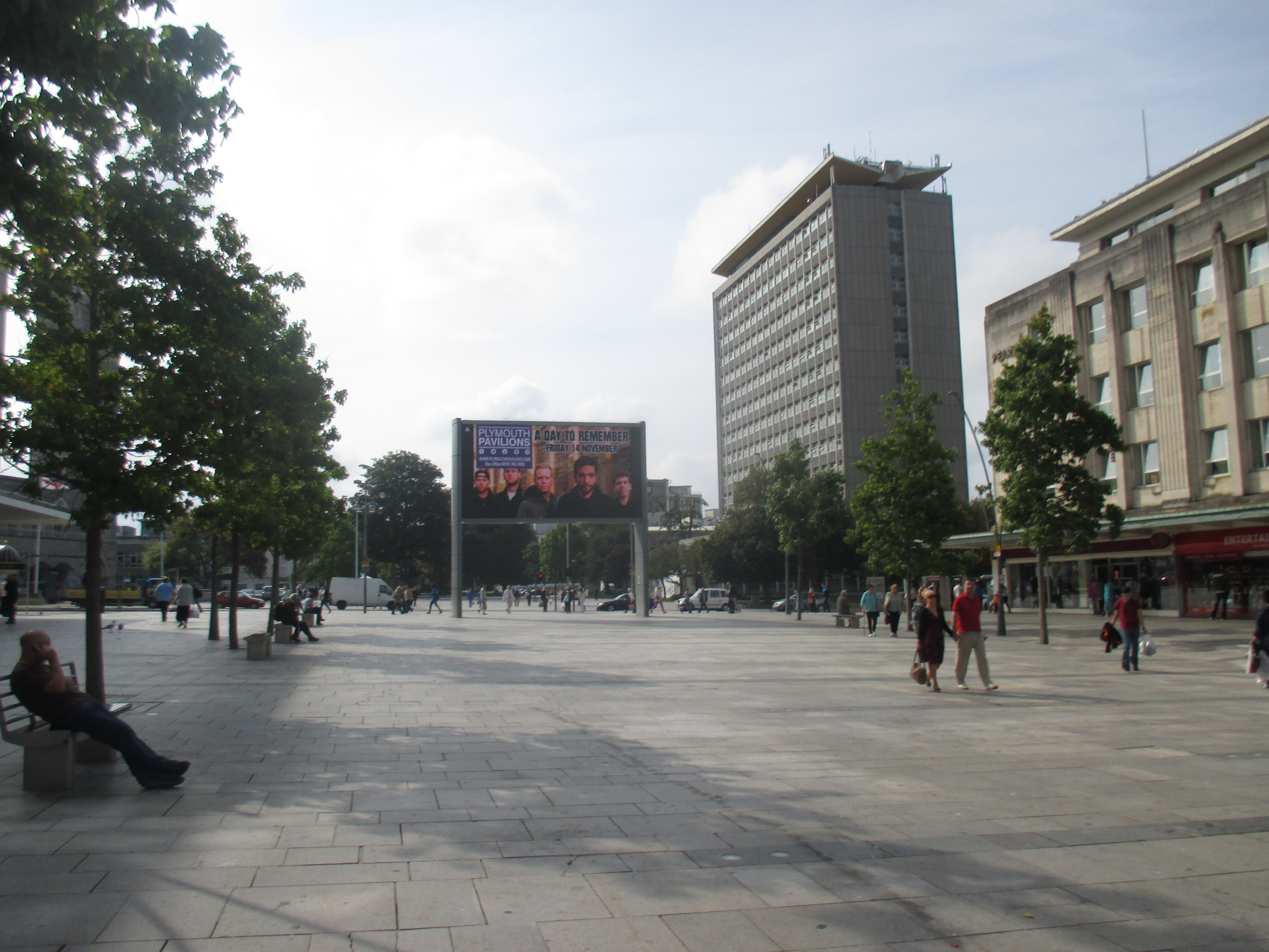 Armada way cuts through the town from the university area and library down through the modern Drake Circus mall, all the down to Hoe Park by the sea. The city is surprisingly Victorian in appearance, particularly on this end. I wander down into the Drake Circus mall, gliding through its light and airy atrium and past an array of somewhat-aspirational chain stores. It’s a good place to sleep-walk, so I shake myself awake and keep progressing south down Armada Way. The place is extraordinary: wide boulevards arranged in a grid communicate a spacious, relaxed yet uncluttered feel. It’s all pedestrianised, but the effect works: I do not pass shoppers but citizens, many sitting outside in cafes or on benches, giving a surprisingly European feel to the place. The precinct was created after the Blitz according to the plans of Patrick Abercrombie, otherwise known for the now much-unloved ‘New Towns’ of Cumbernauld, Harlow, Crawley and elsewhere, and for his either half-implemented or ignored plans for the reconstruction of London and Hull. Plans centred on the motorcar, and wilfully tore down good Victorian buildings, building inner city ring roads over green spaces.