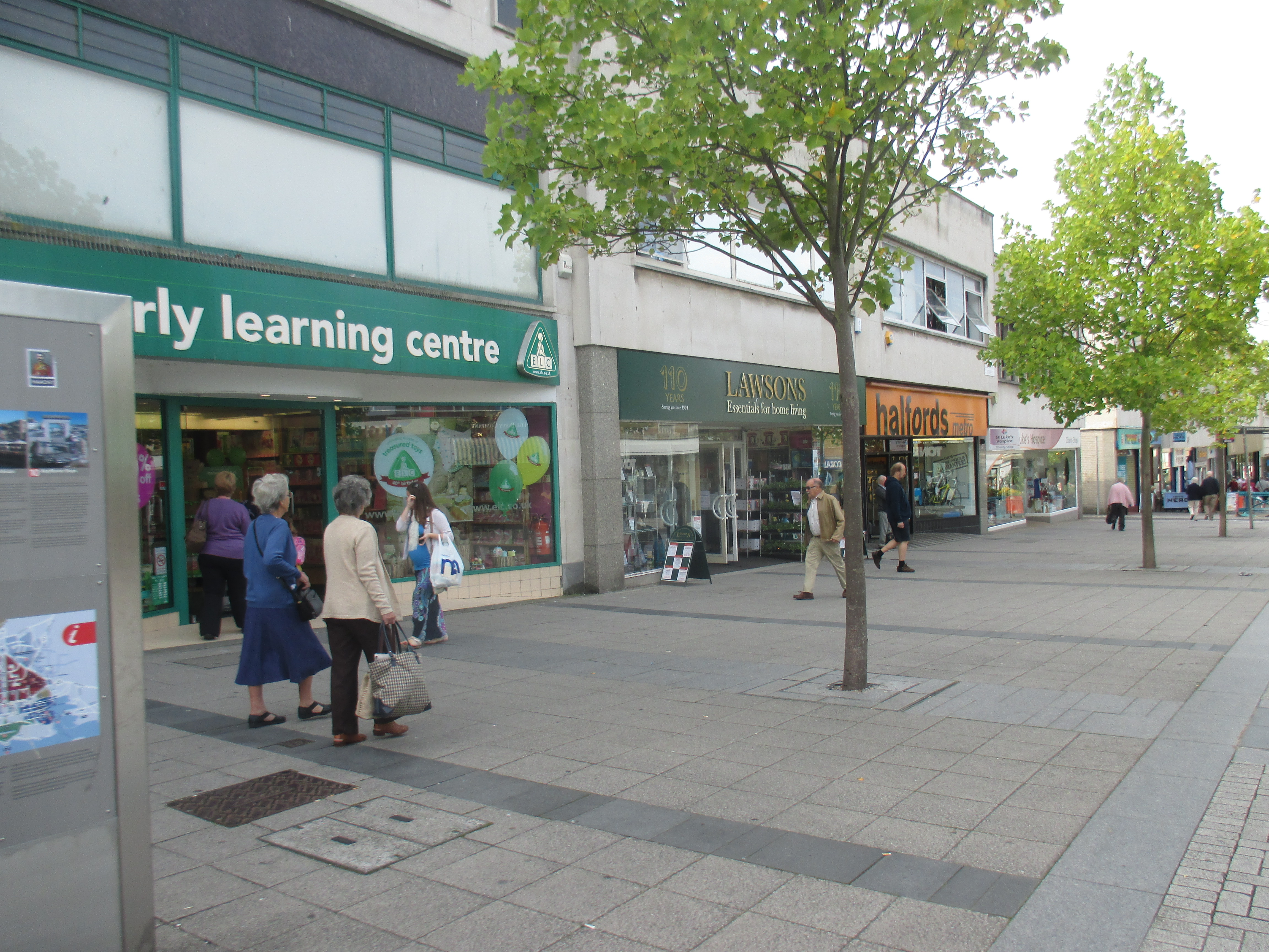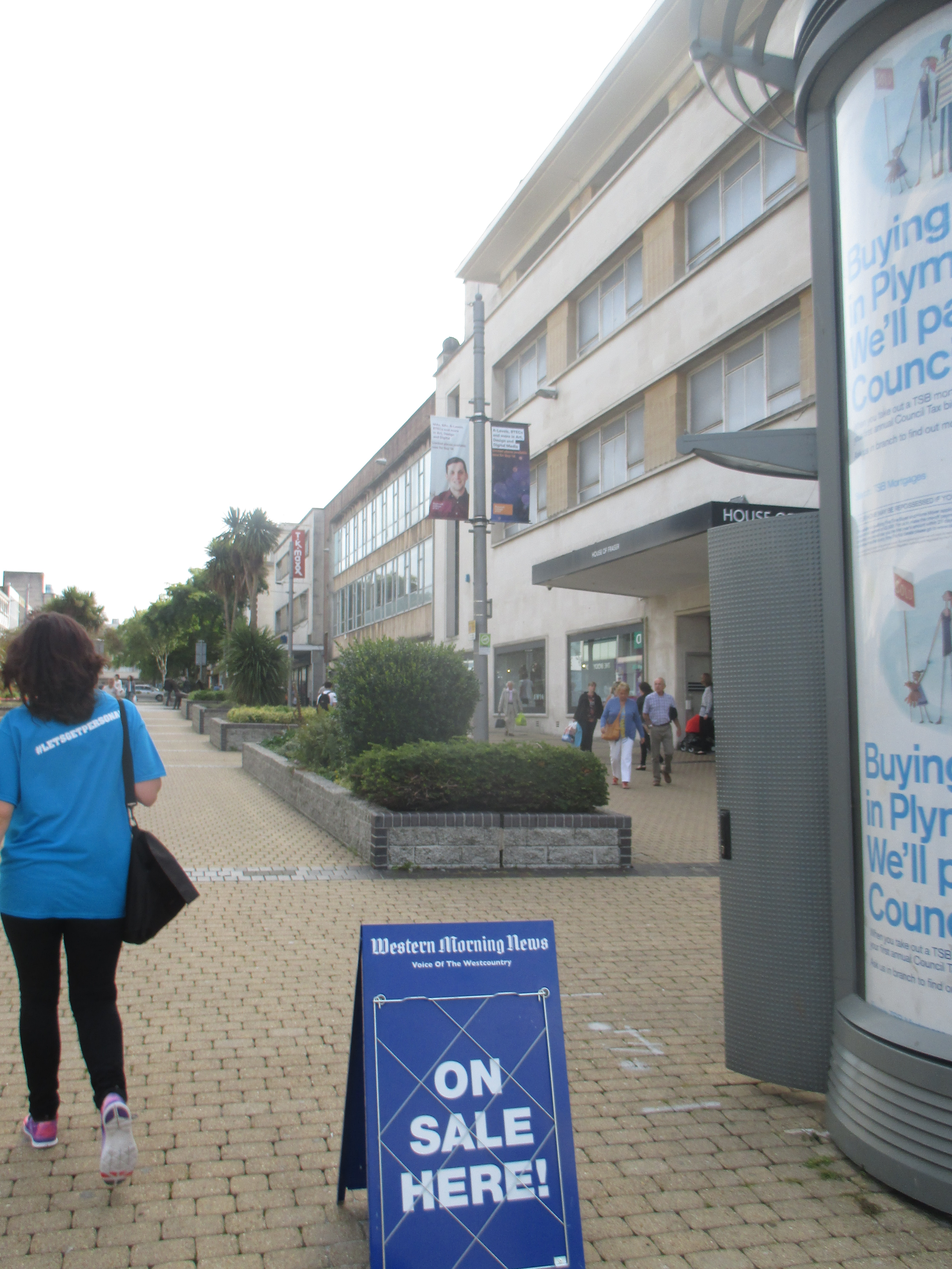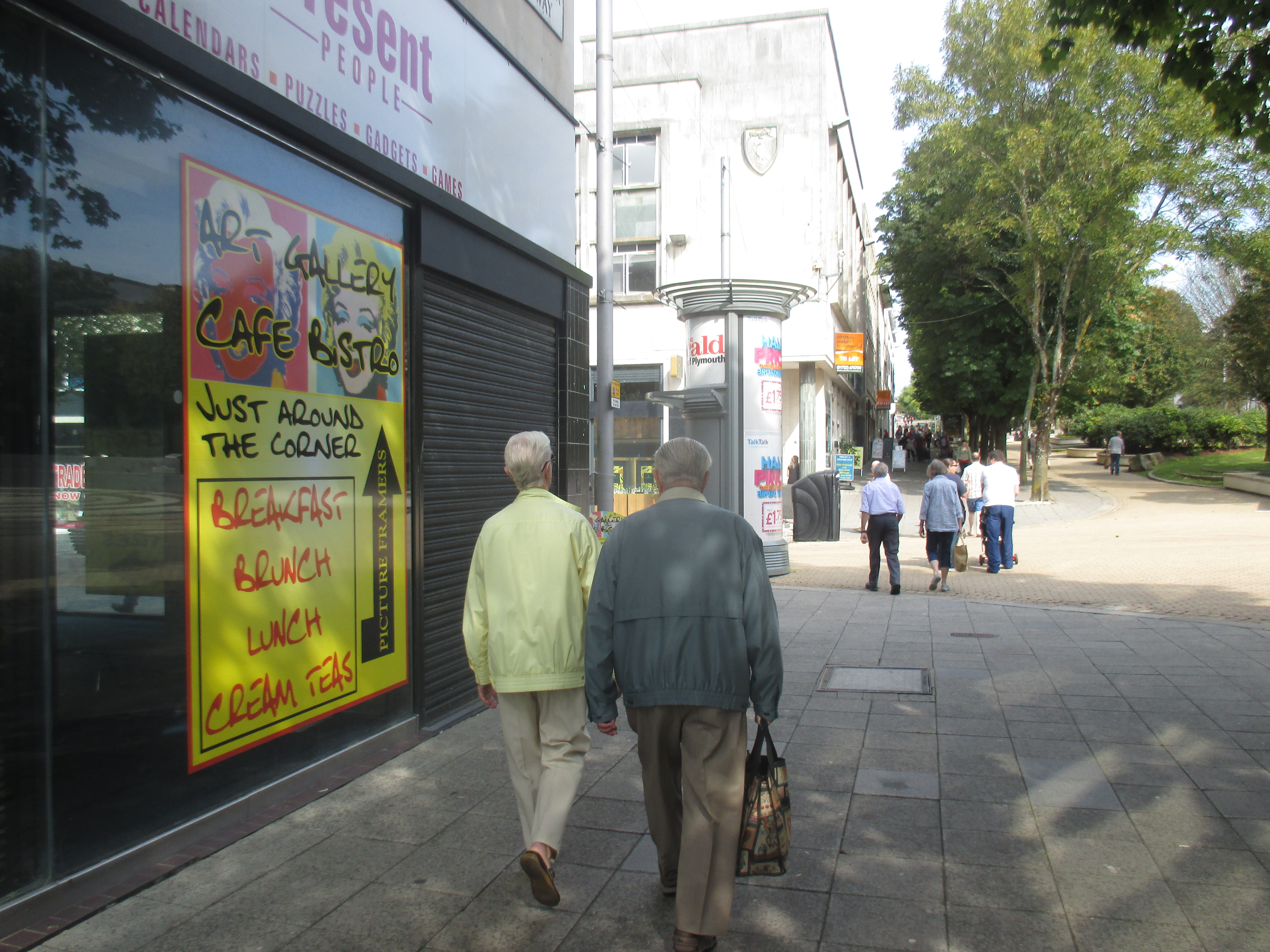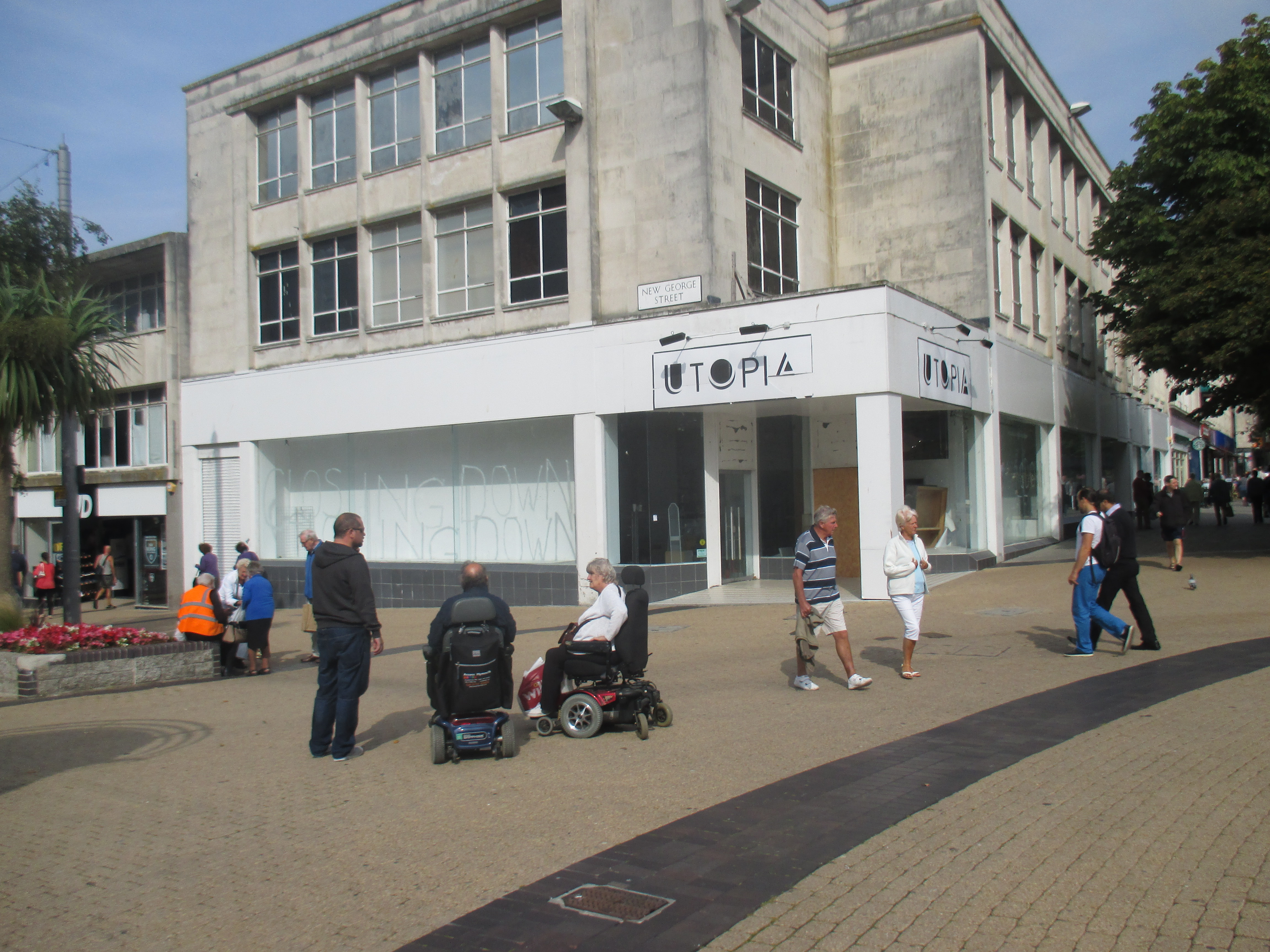 Plymouth would seem to be his success. Of course, the centre is full of chain stores, but neither they (nor their unpopularity) dominate the ambience. People instead are gathered to sit, talk to one another, observe the world. I can’t help feeling happy here among the bustle, wandering up and down the boulevards, losing track of where I am as I take a left here, a right there, as mood intuits. I stock up on supplies in Poundland, no doubt the liveliest store in town, before drifting back towards New George Street, where a place called utopia has just closed down.