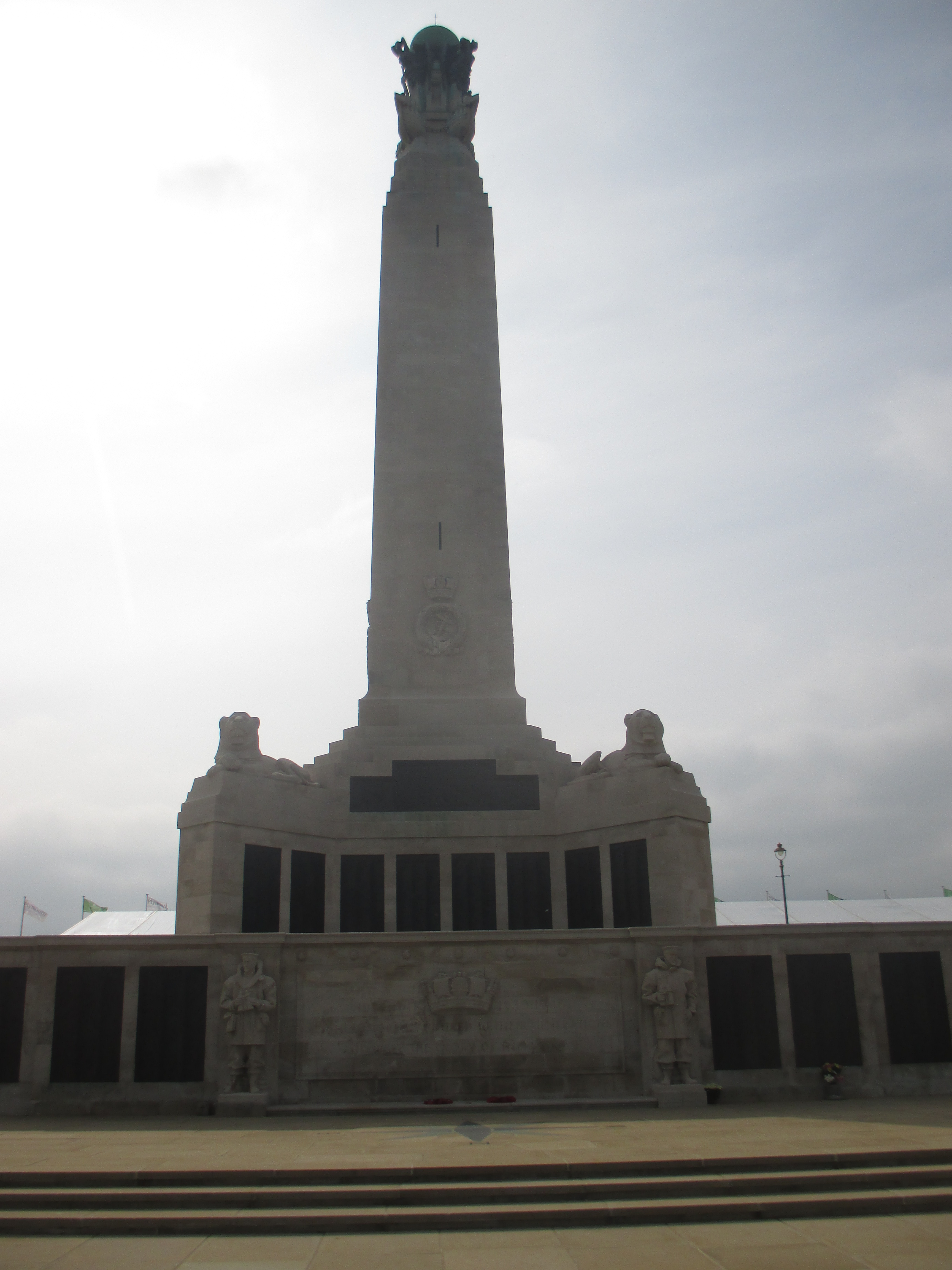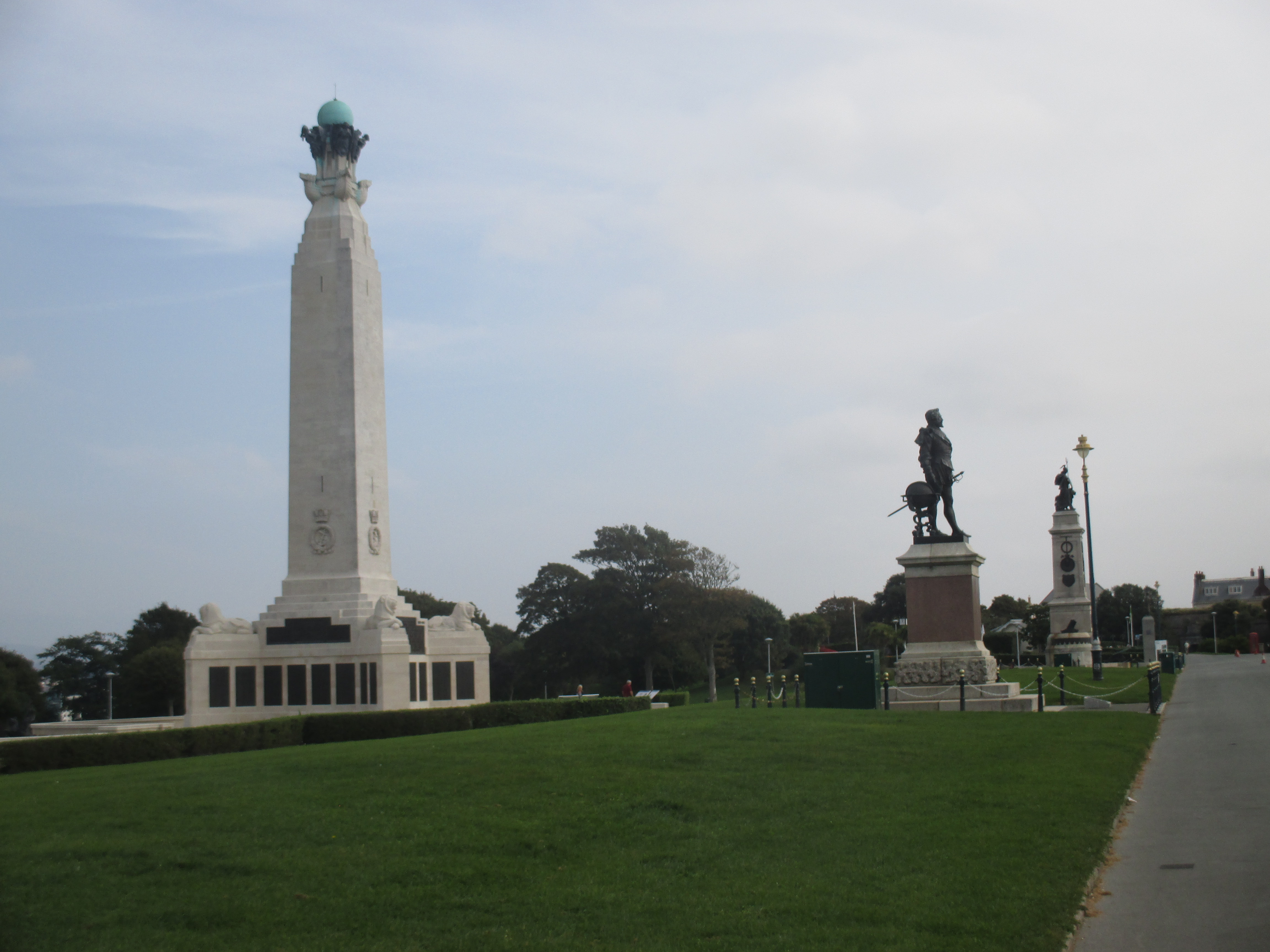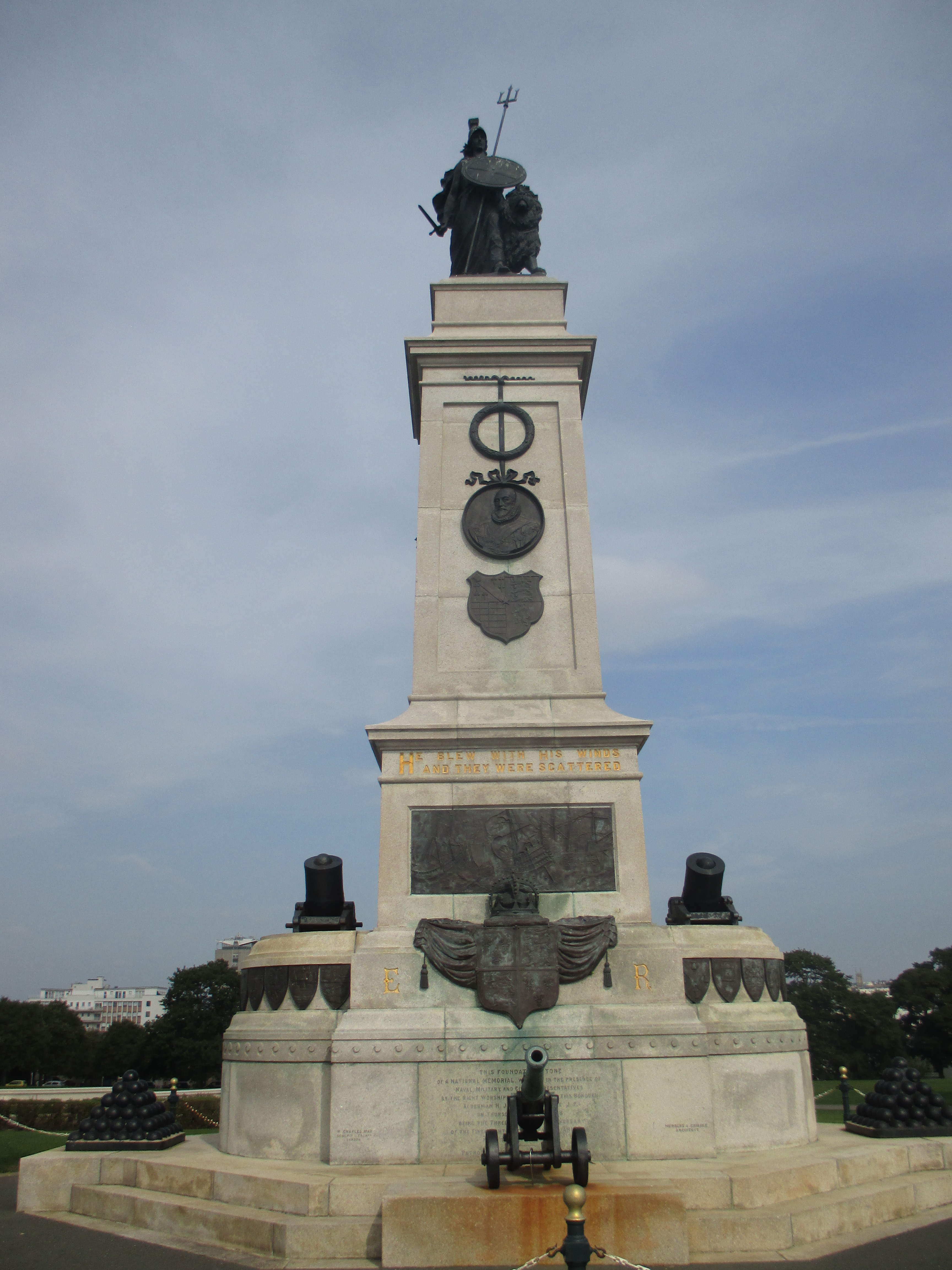 I head down to the Hoe park, a wide green space by the sea with a number of large memorials across it. The naval memorial is most prominent, a tall white obelisk with a small green sphere at the top, reminding me of the burdens of Atlas as he struggled to bear the weight of the world. Below, panels struggle nobly to communicate what the deaths of over 23,000 sailors look like. Another memorial to a German prince depicts an angel carrying the dead man’s soul up, ‘towards another world’. Close by is a triumphalist memorial commemorating the defeat of the Spanish Armada in 1588. ‘He blew with his wind, and they were scattered’, the panel states.