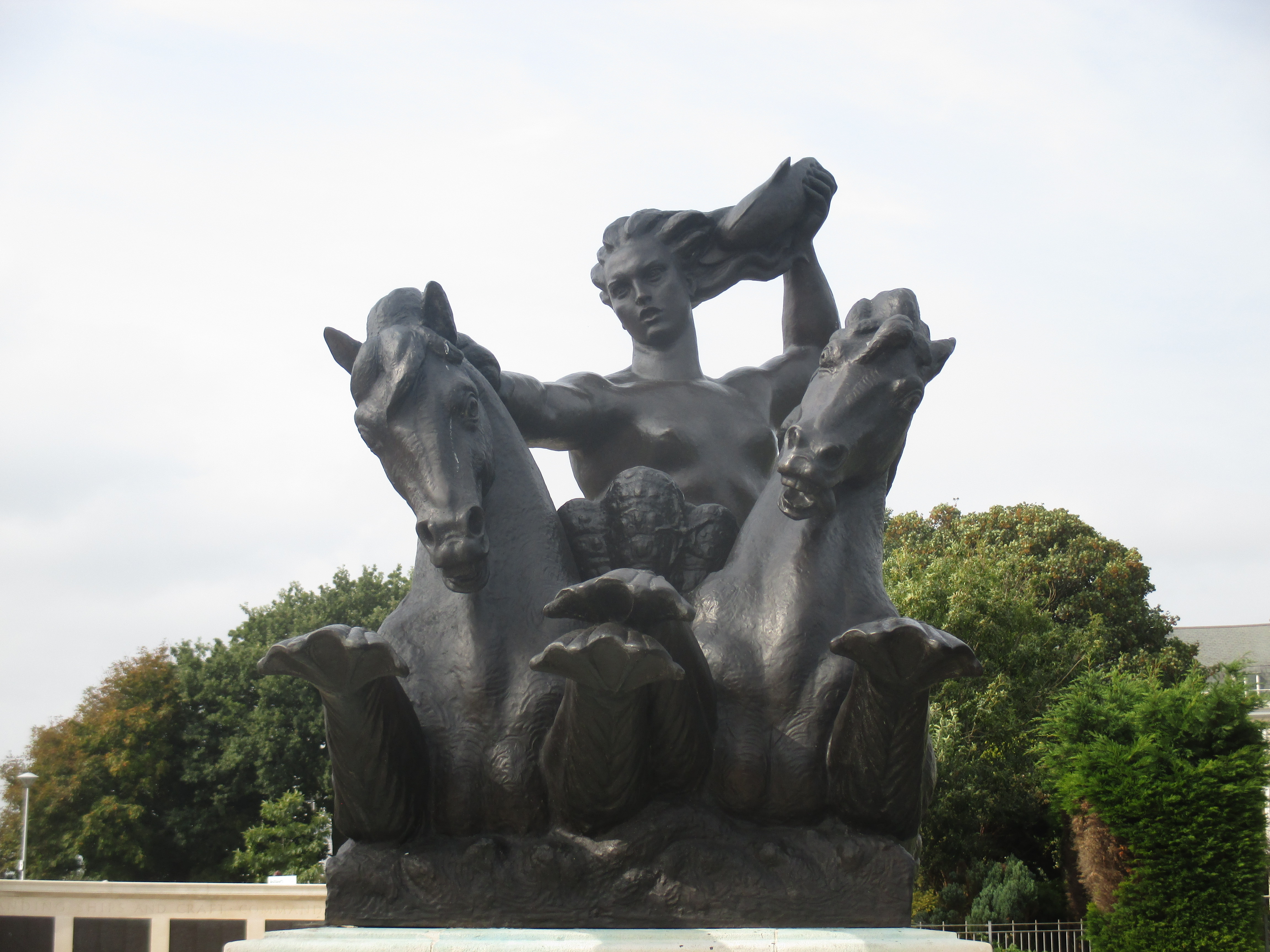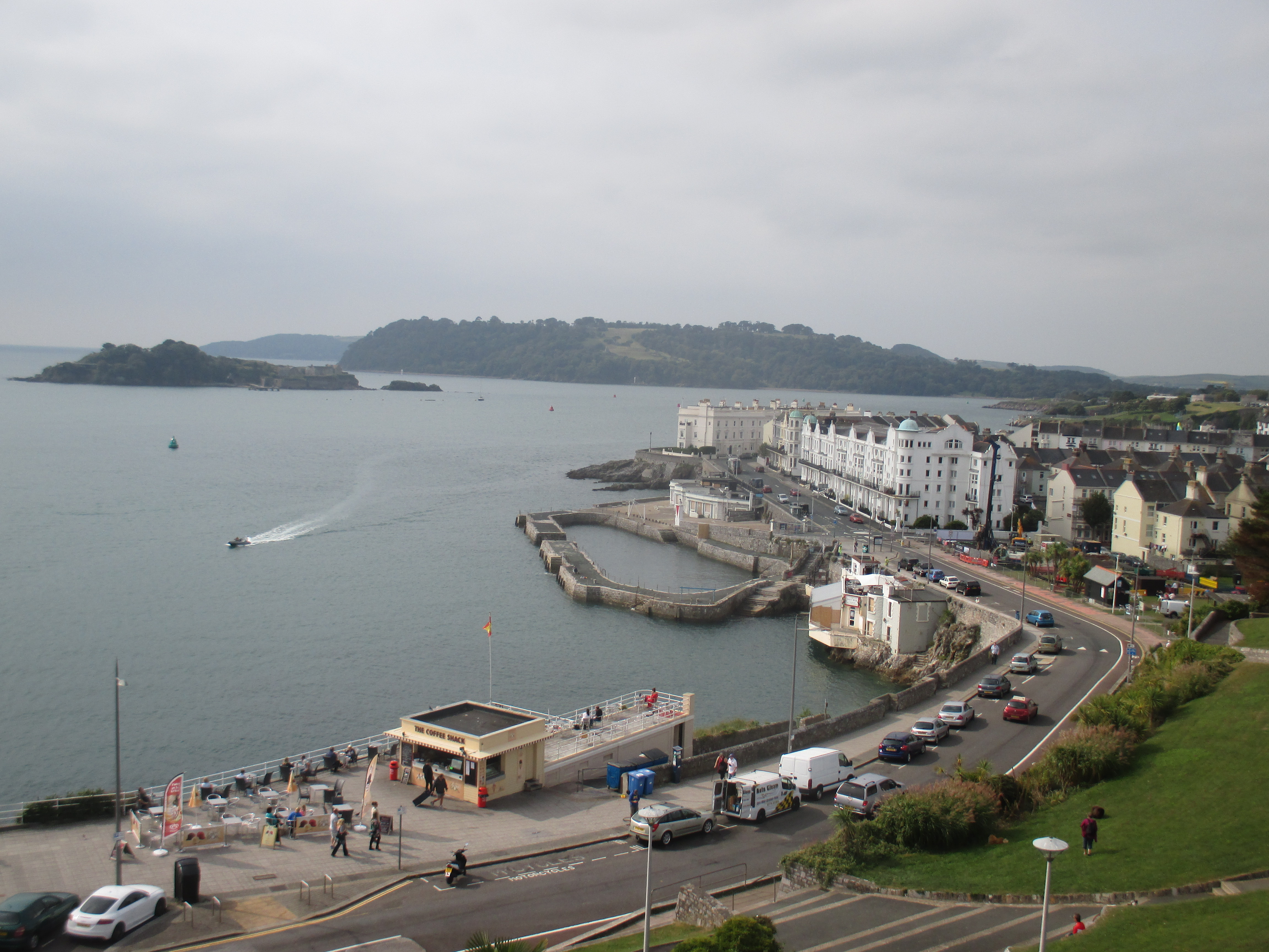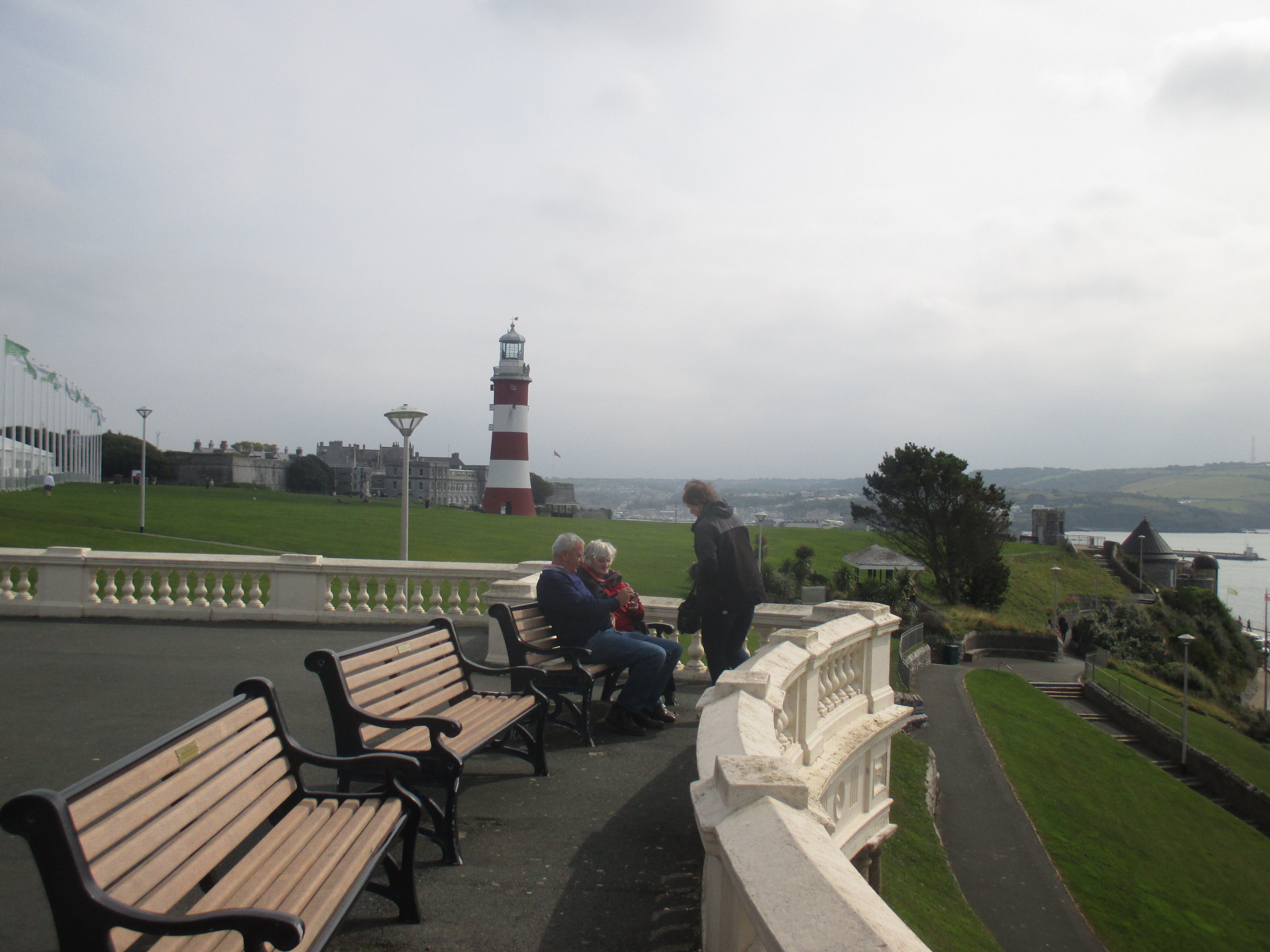 I head down to the Hoe park, a wide green space by the sea with a number of large memorials across it. The naval memorial is most prominent, a tall white obelisk with a small green sphere at the top, reminding me of the burdens of Atlas as he struggled to bear the weight of the world. Below, panels struggle nobly to communicate what the deaths of over 23,000 sailors look like. Another memorial to a German prince depicts an angel carrying the dead man’s soul up, ‘towards another world’. Close by is a triumphalist memorial commemorating the defeat of the Spanish Armada in 1588. ‘He blew with his wind, and they were scattered’, the panel states.