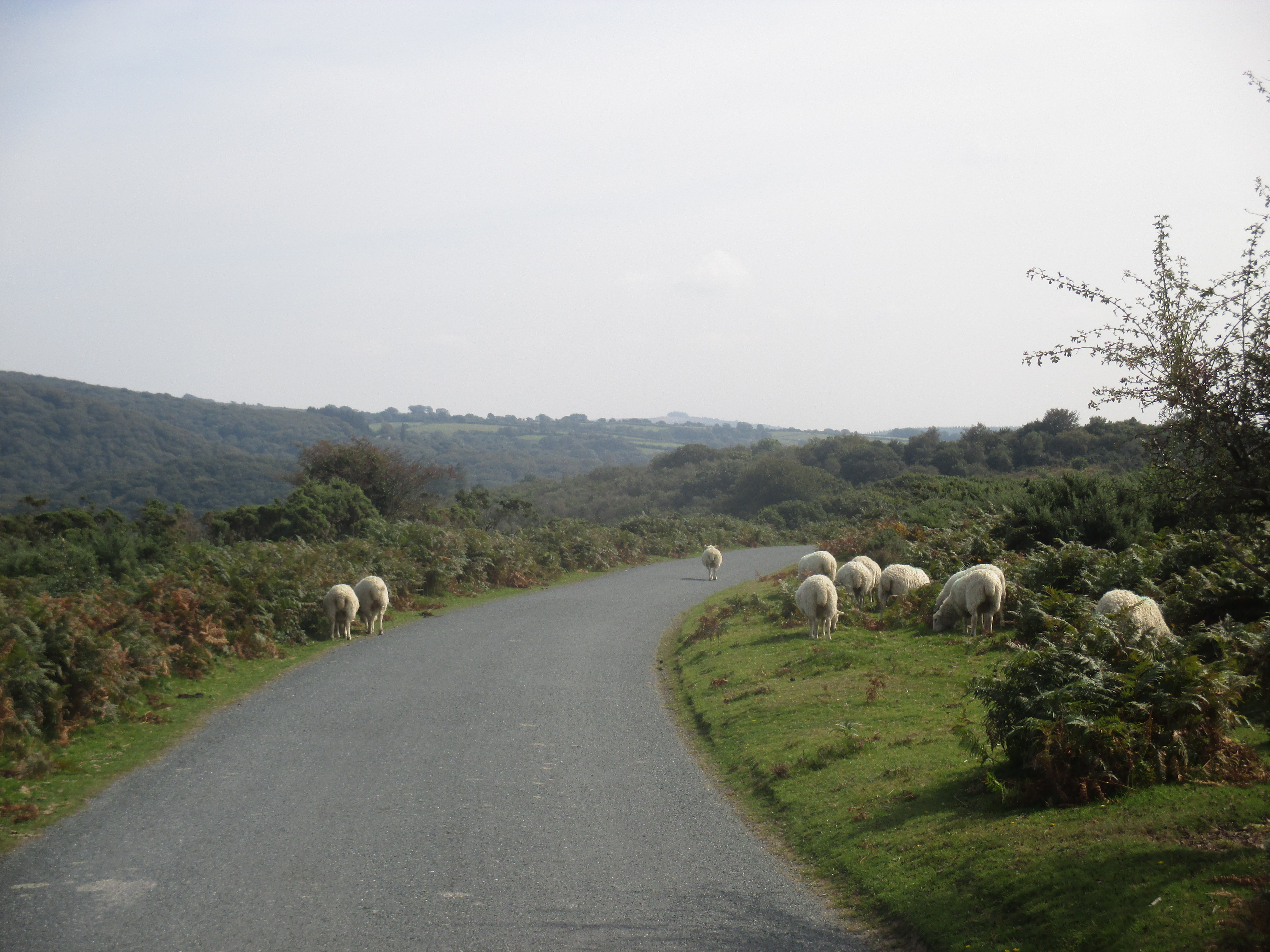 Exiting Plymouth and its histories, I pedal up and out across the Plym valley railway. It’s a wonderful cycle trail along an old railway route through the forests, one of the most pleasurable and smooth I’ve been on, a real delight, with sweeping views of wooded valleys over its many viaducts. I’m cycling towards Dartmoor with the goal of crossing it from west to east, with my final destination of Christow at its eastern edge. The scenery begins to change at Yelverton, a small village on the edge of the large national park. The road’s already begun to tug up and I pass roaming sheep among thick bracken and gorse which suggest the onset of the park, alongside the looming peaks to my right.