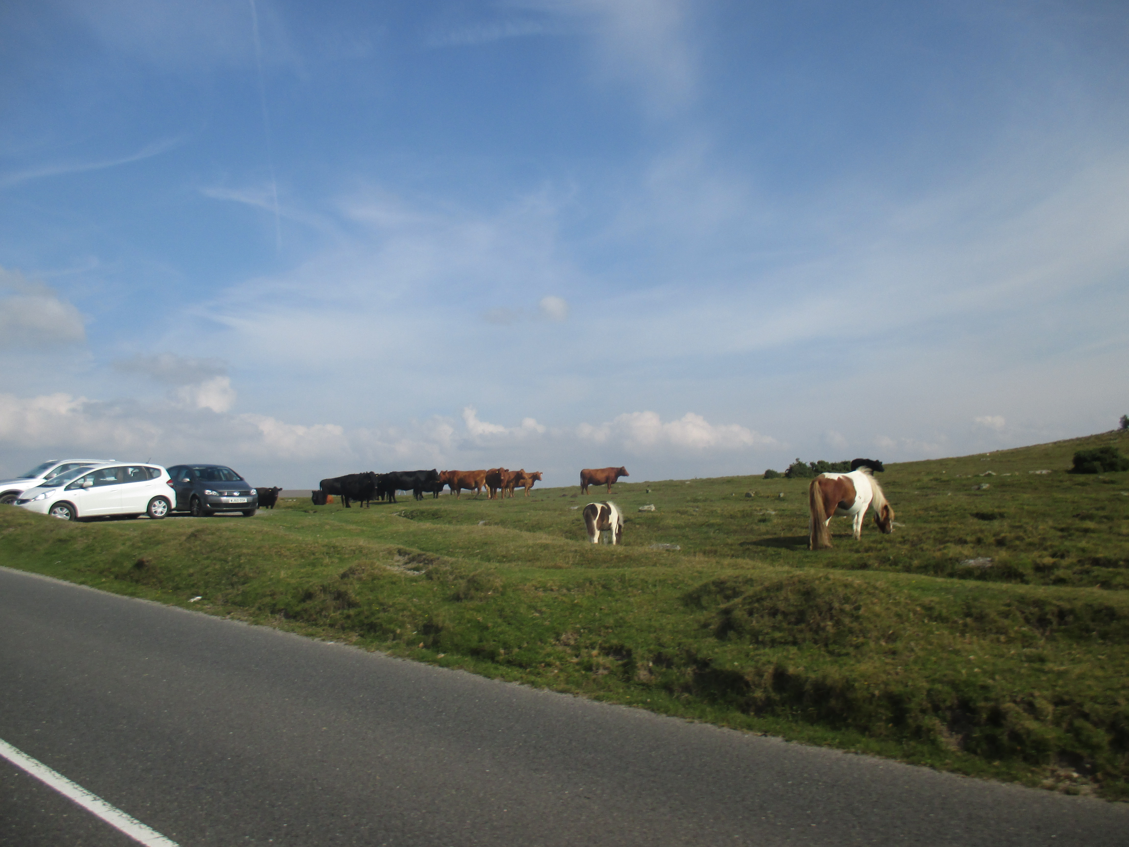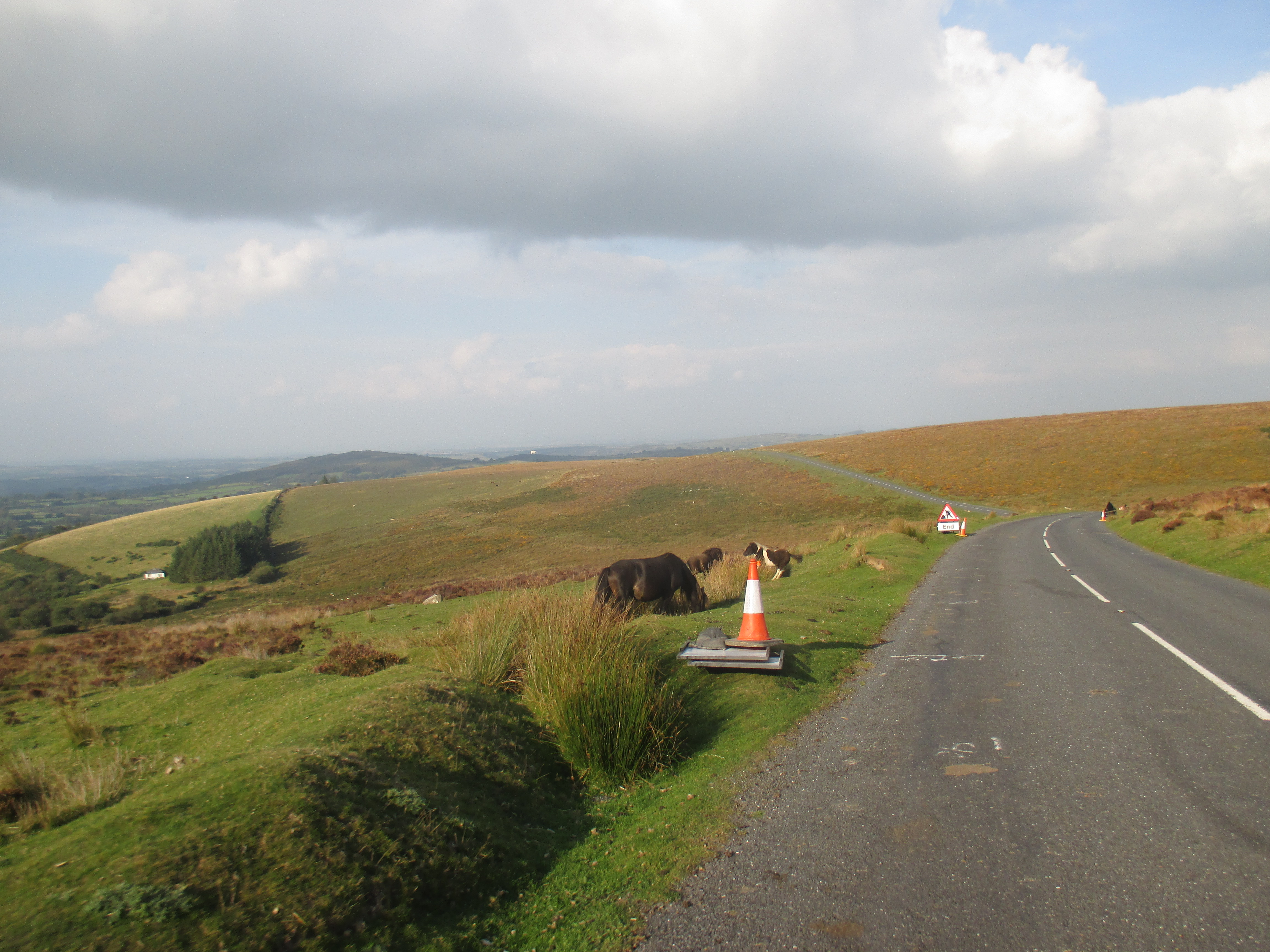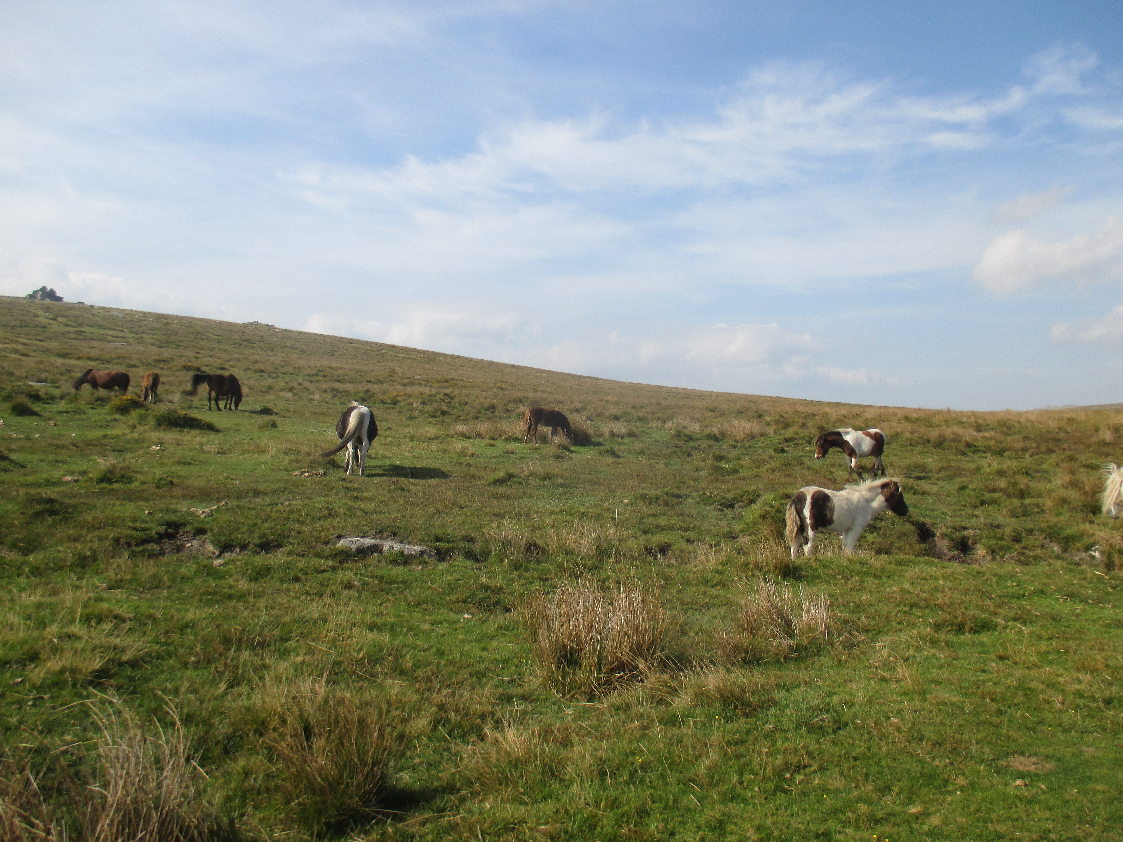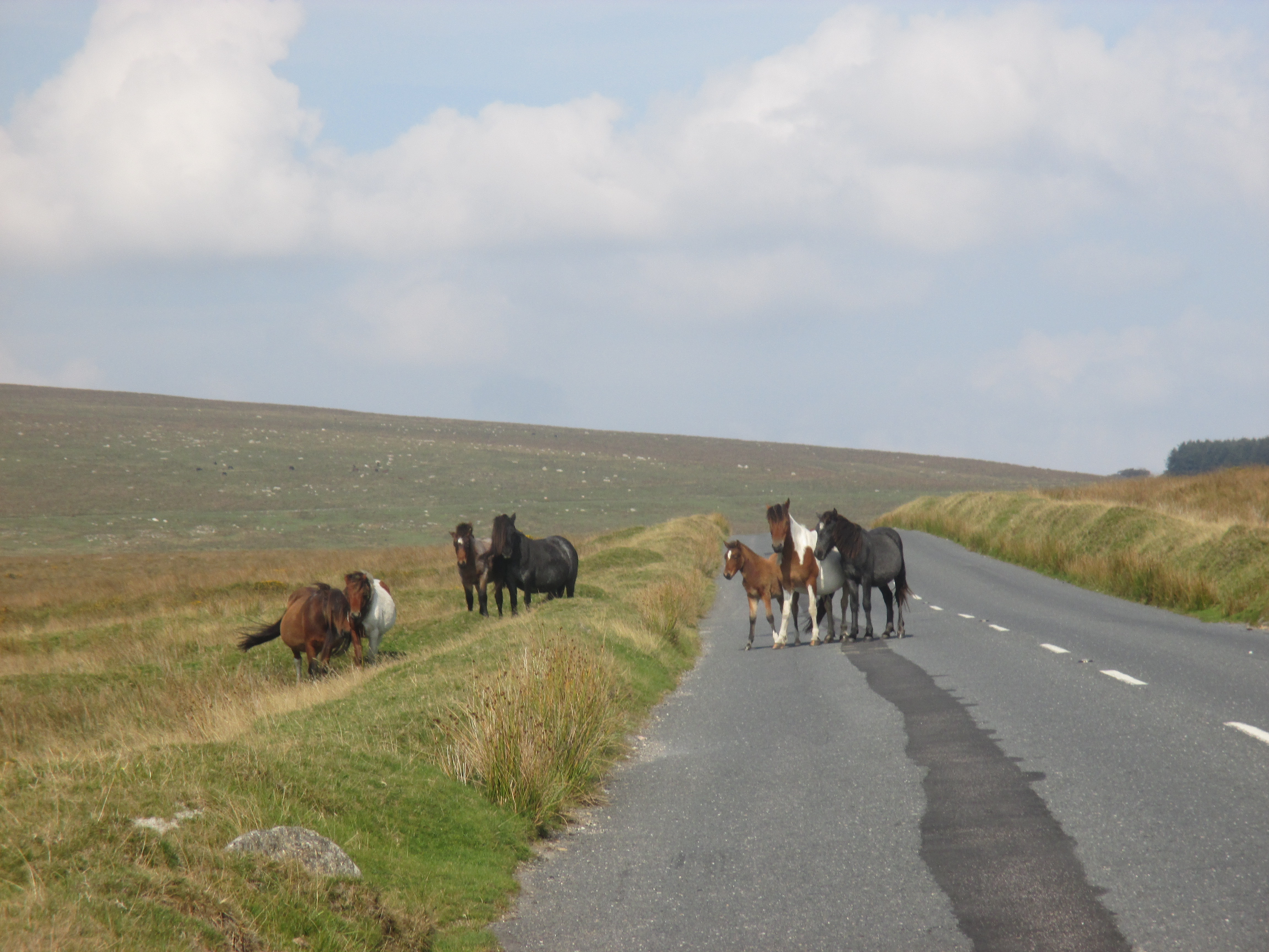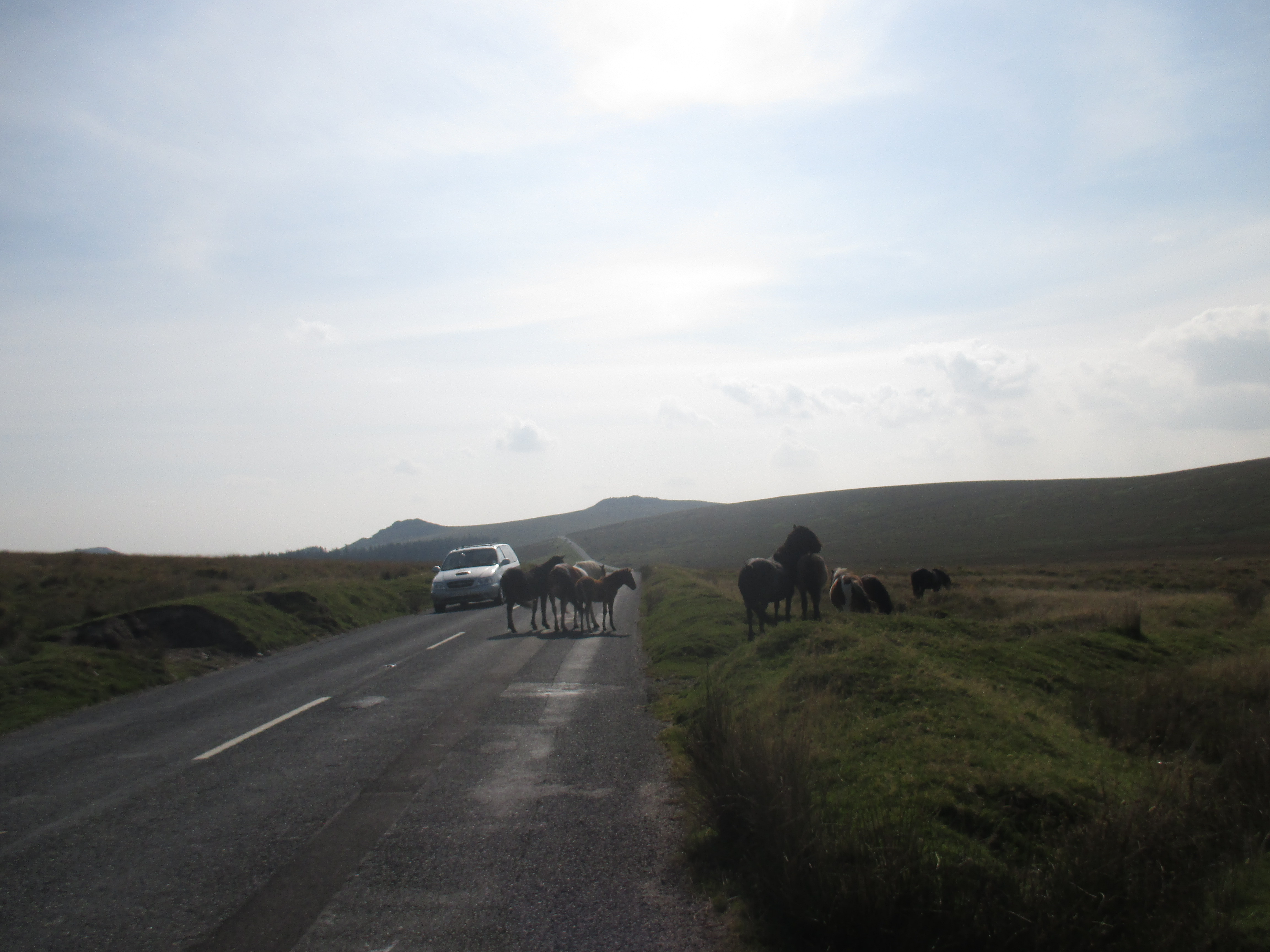 I leave Yelverton and climb up the steep but quiet road up into Dartmoor. I’m just taken aback by the wilderness and rugged majesty of the scenery, of which there’s little hint until one takes the high road to Princetown. The hills steep up but there’s little on them, very few trees except the odd cluster that form a woods, giving out splendid wide views of the moors, a mixture of golden-russet browns and faded dark greens of the wilting bracken, the yellow buds of the gorse, small trenches and grooves in the grass which cause it to continually ripple, and all about these rocky tors, crops of rock embedded within the terrain with the same mystery and oblique sophistication as the menhirs of Orkney or West Penwith. There are animals roaming the land: plenty of sheep of different breeds, black-faced and white-faced, then small horses and ponies that at times dash across the road as traffic approaches.