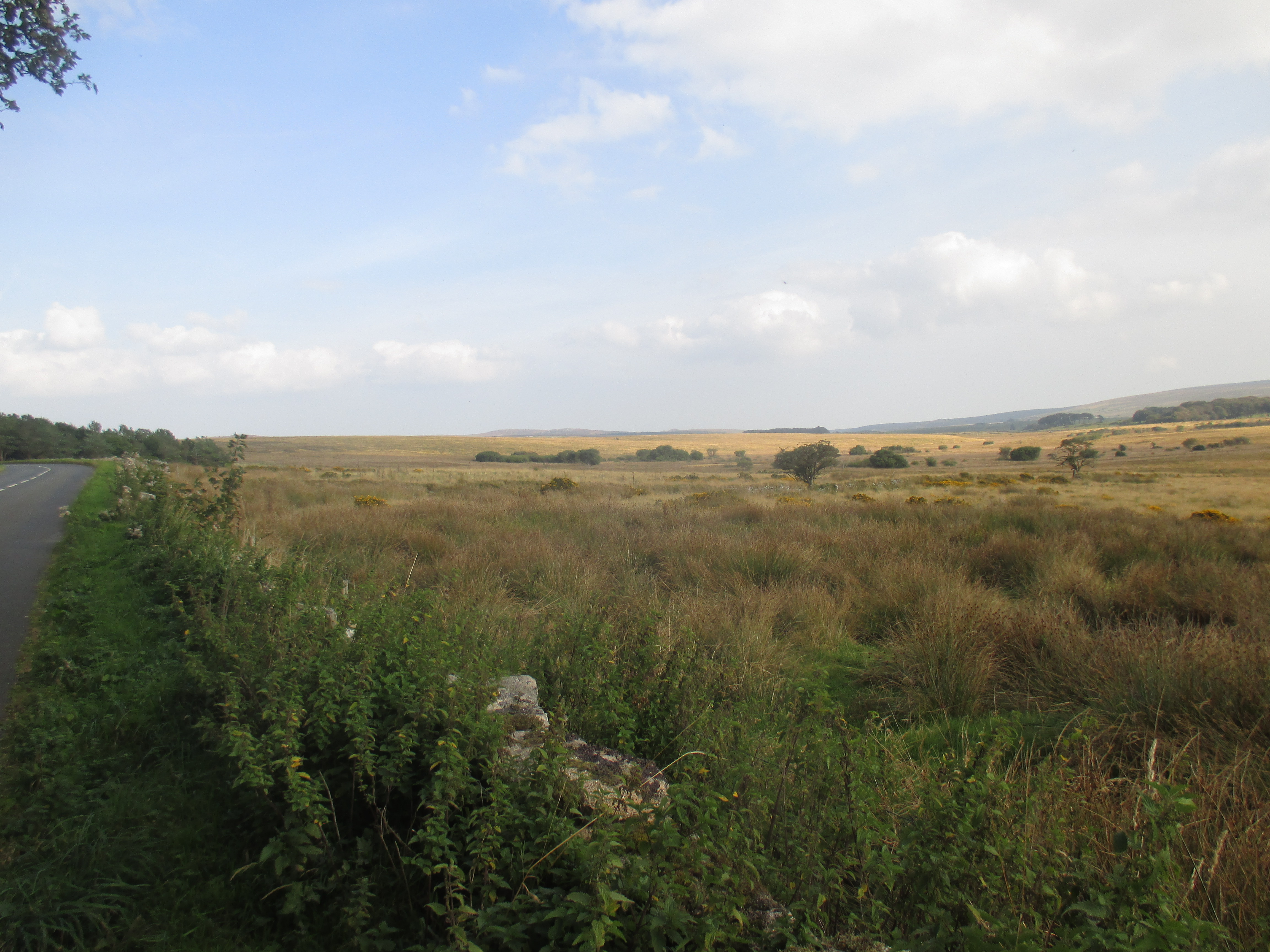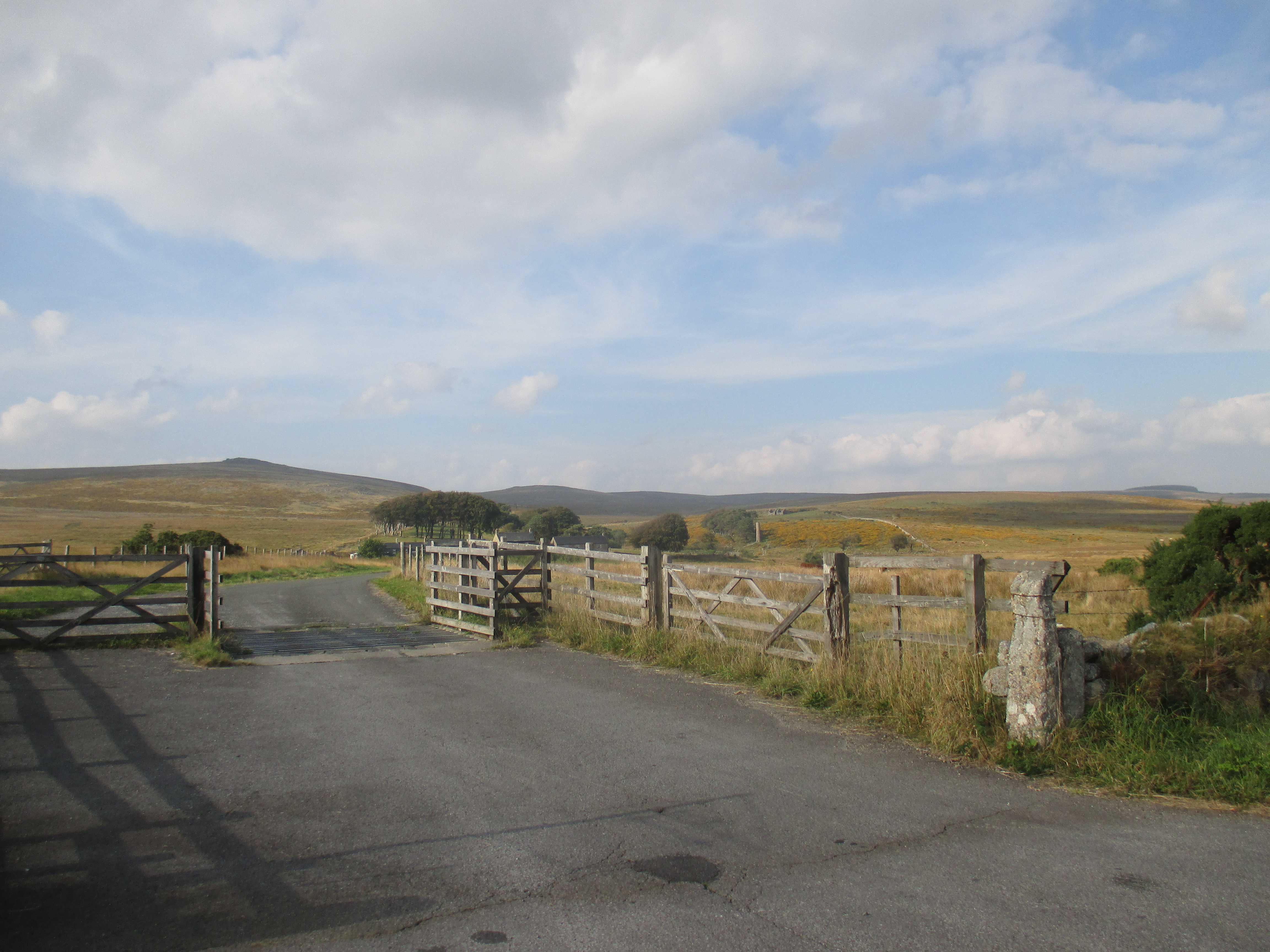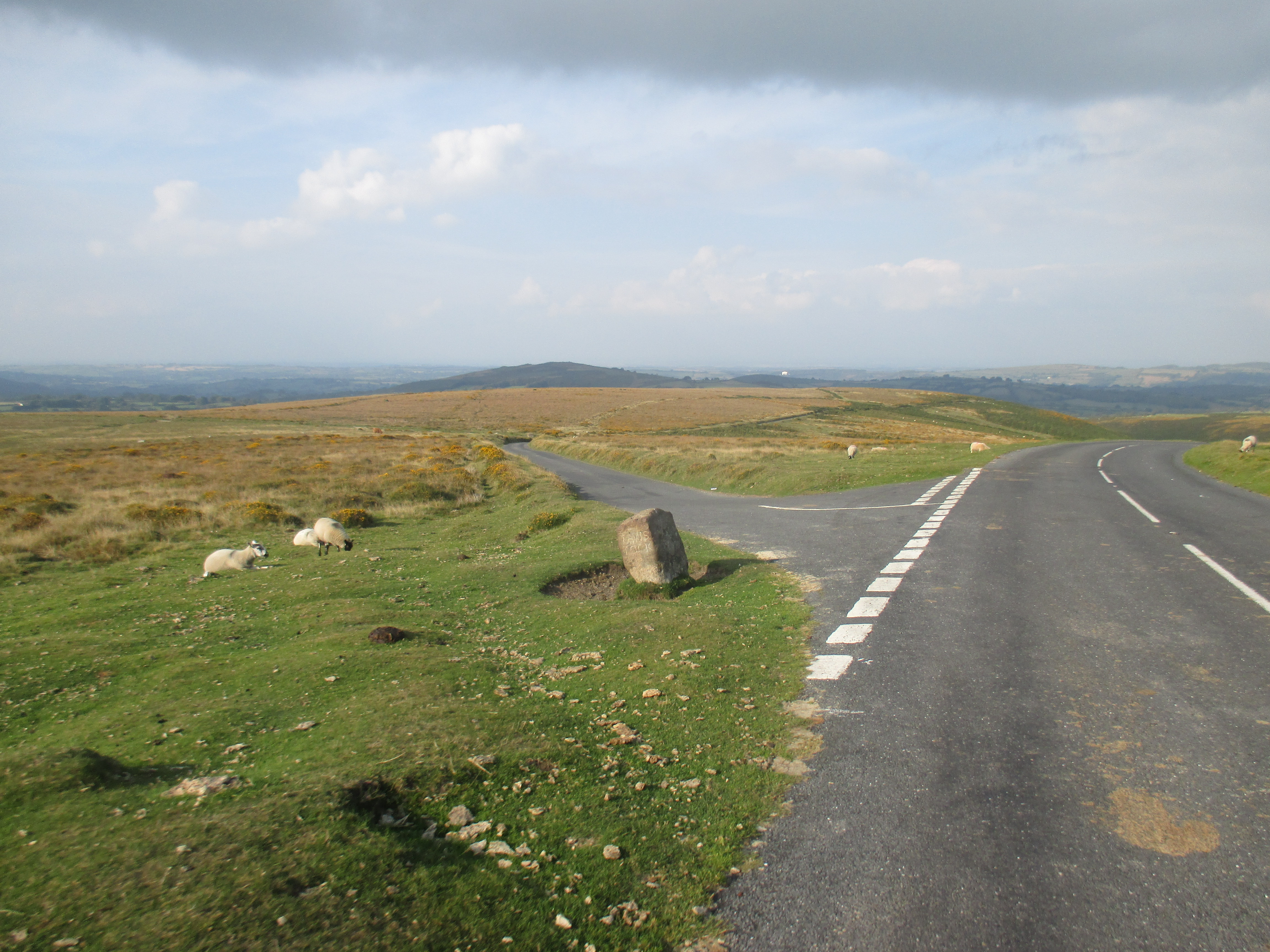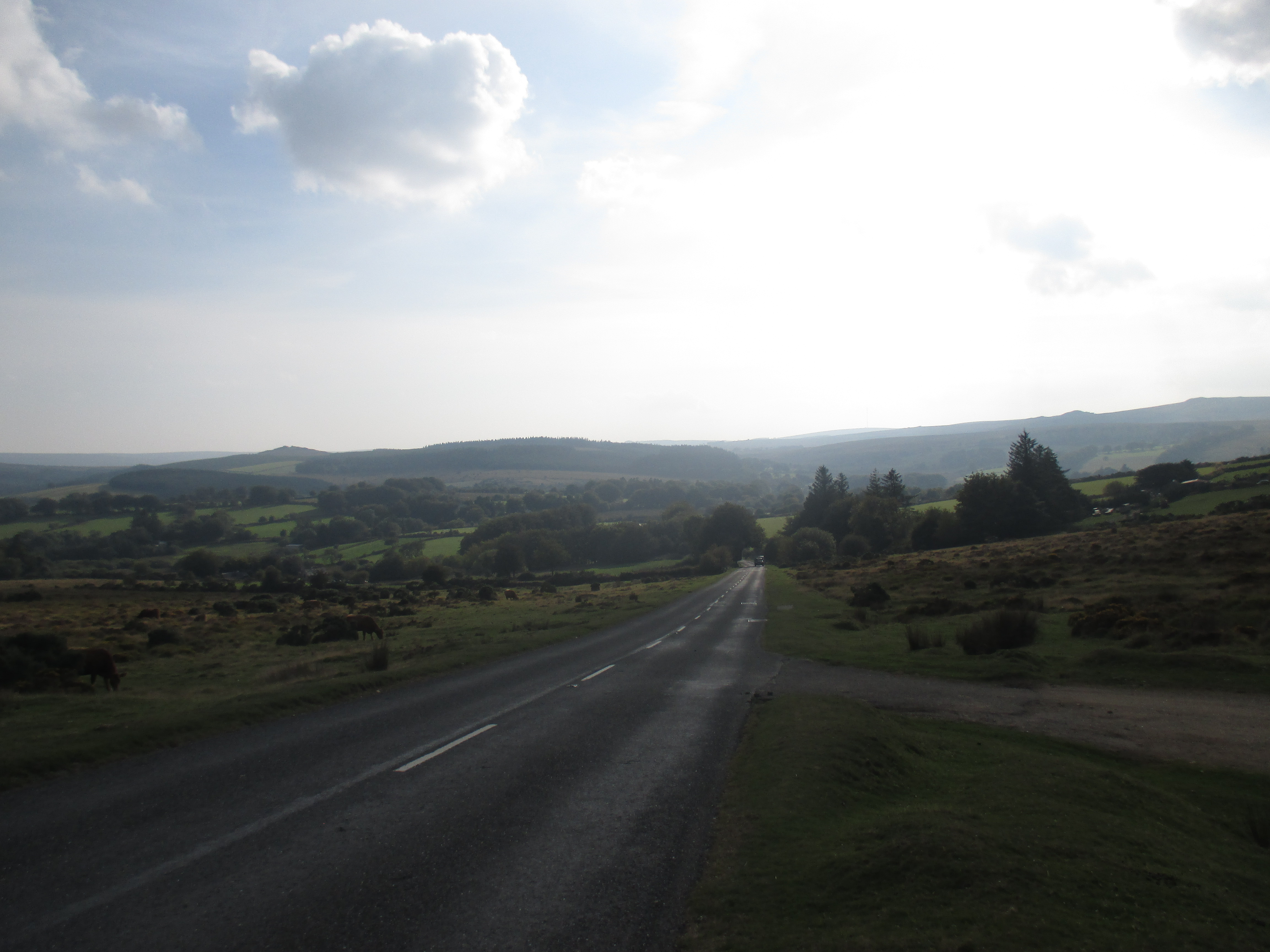 I leave Yelverton and climb up the steep but quiet road up into Dartmoor. I’m just taken aback by the wilderness and rugged majesty of the scenery, of which there’s little hint until one takes the high road to Princetown. The hills steep up but there’s little on them, very few trees except the odd cluster that form a woods, giving out splendid wide views of the moors, a mixture of golden-russet browns and faded dark greens of the wilting bracken, the yellow buds of the gorse, small trenches and grooves in the grass which cause it to continually ripple, and all about these rocky tors, crops of rock embedded within the terrain with the same mystery and oblique sophistication as the menhirs of Orkney or West Penwith. There are animals roaming the land: plenty of sheep of different breeds, black-faced and white-faced, then small horses and ponies that at times dash across the road as traffic approaches.