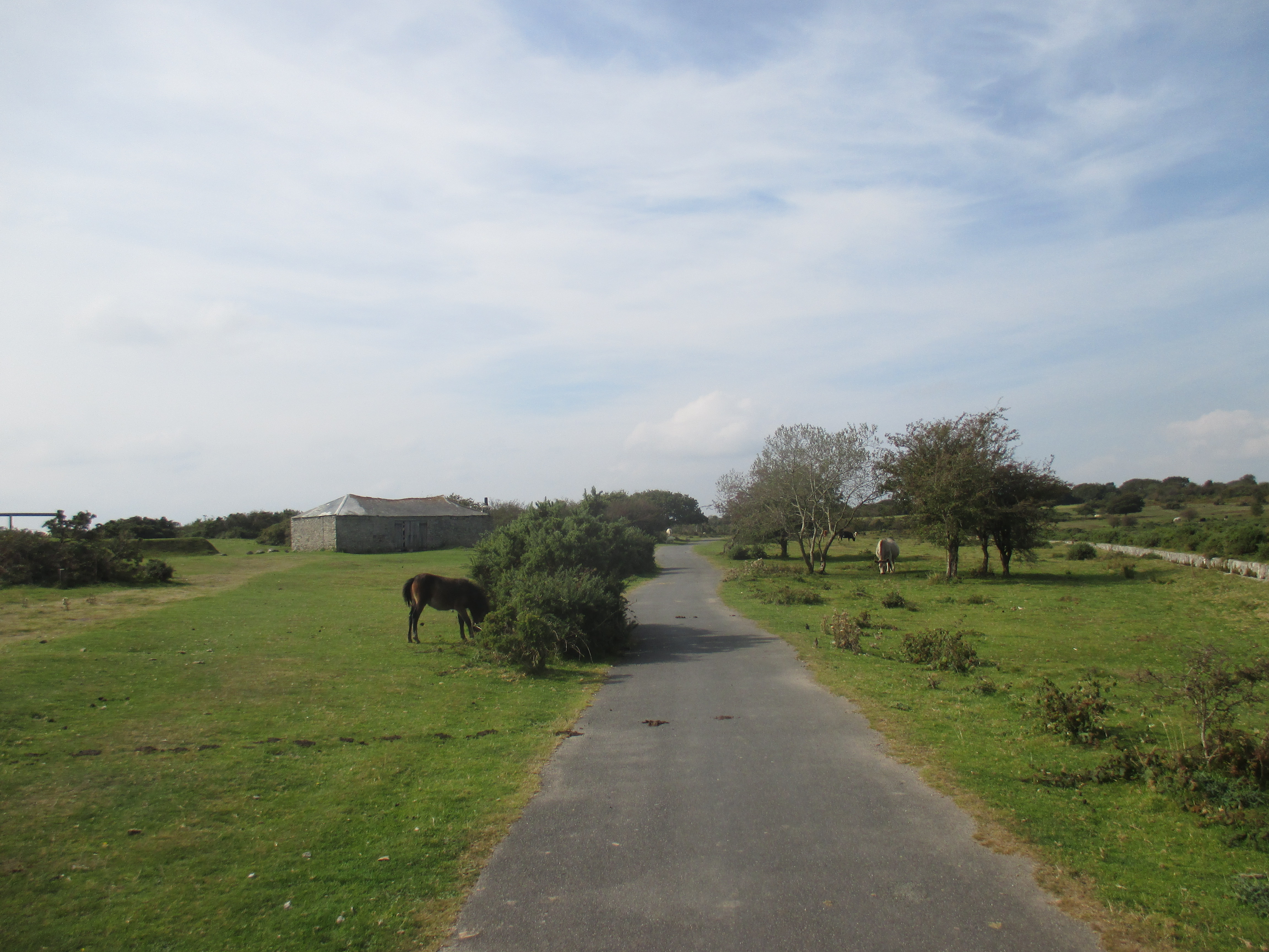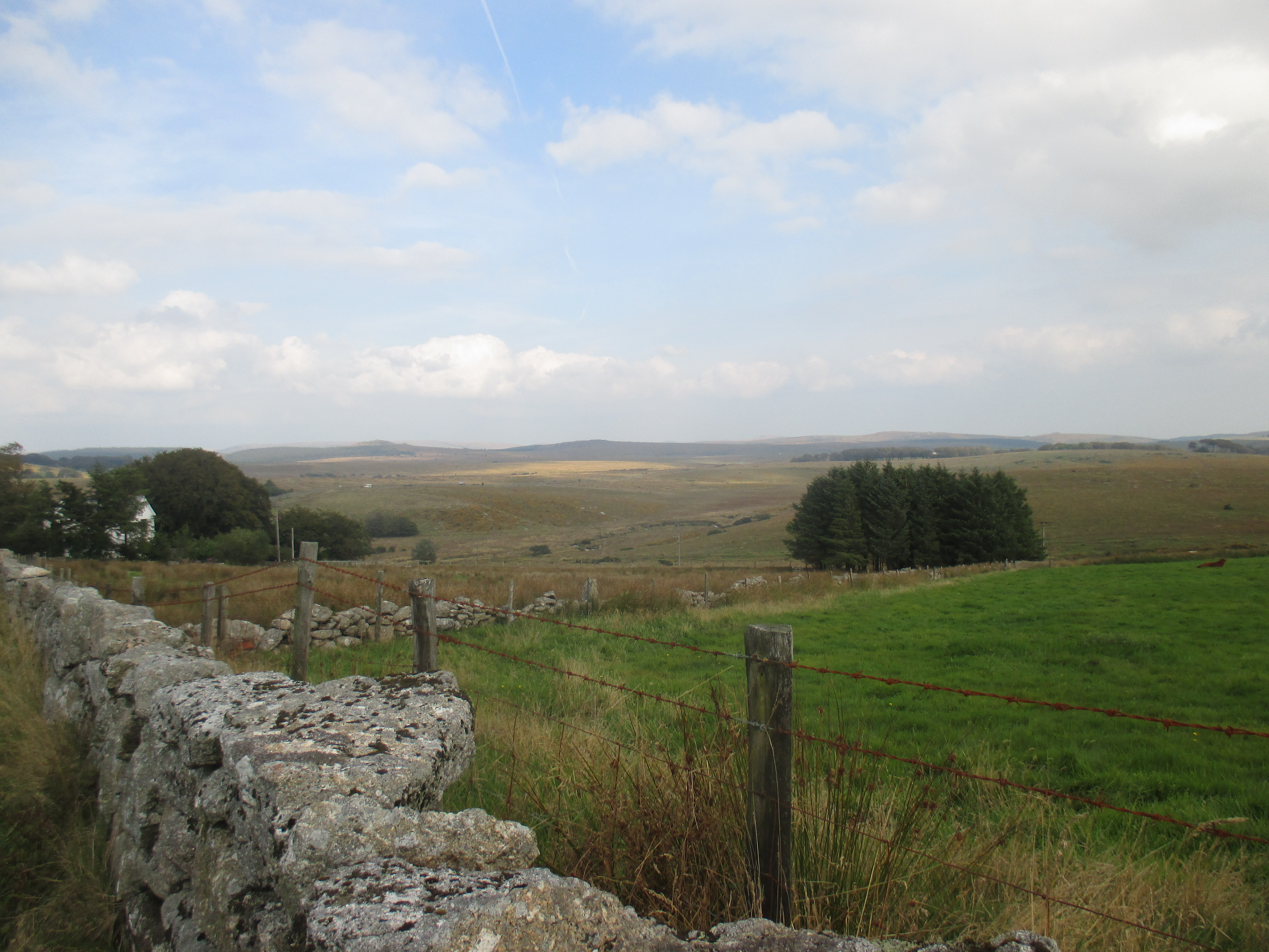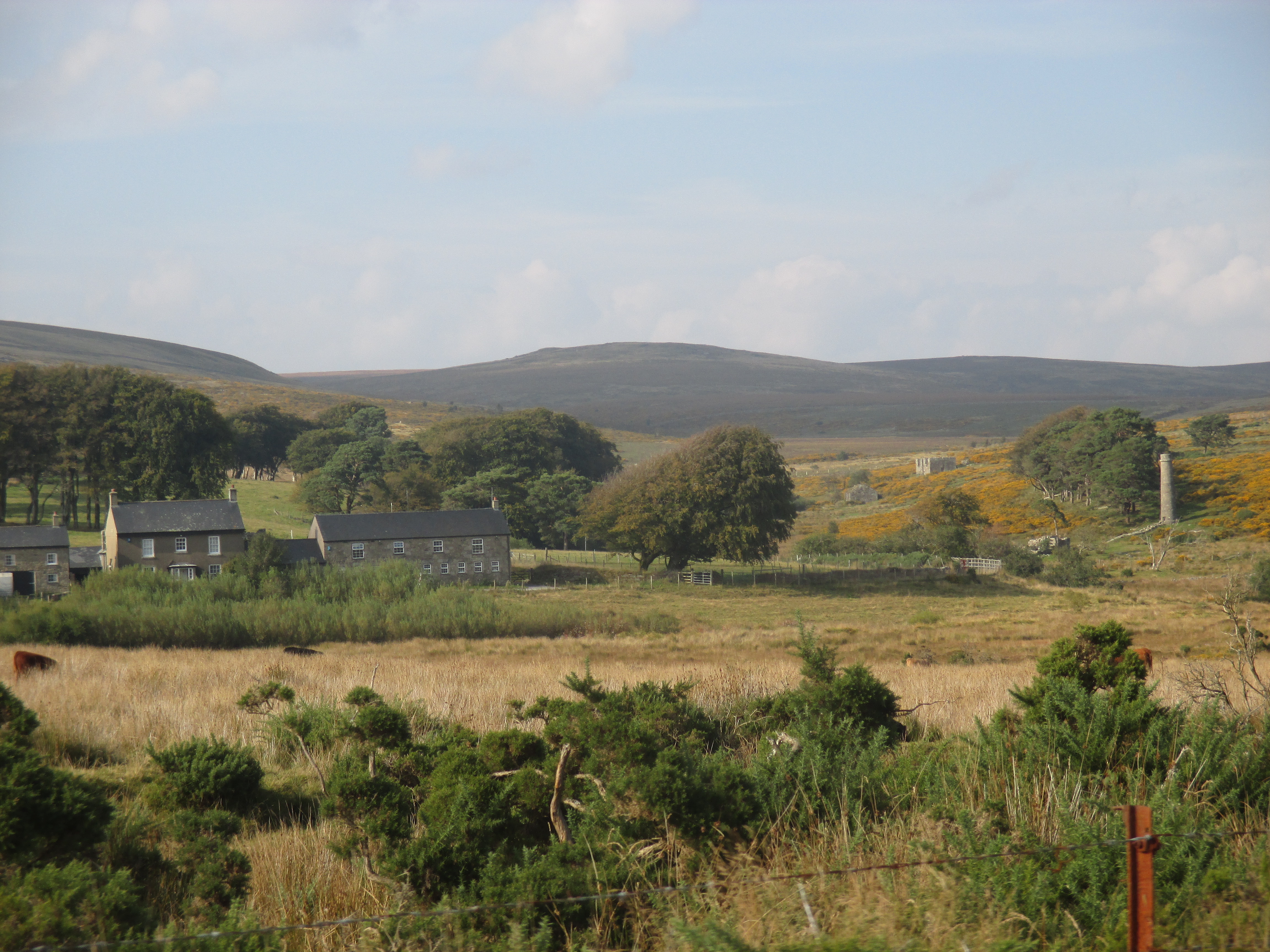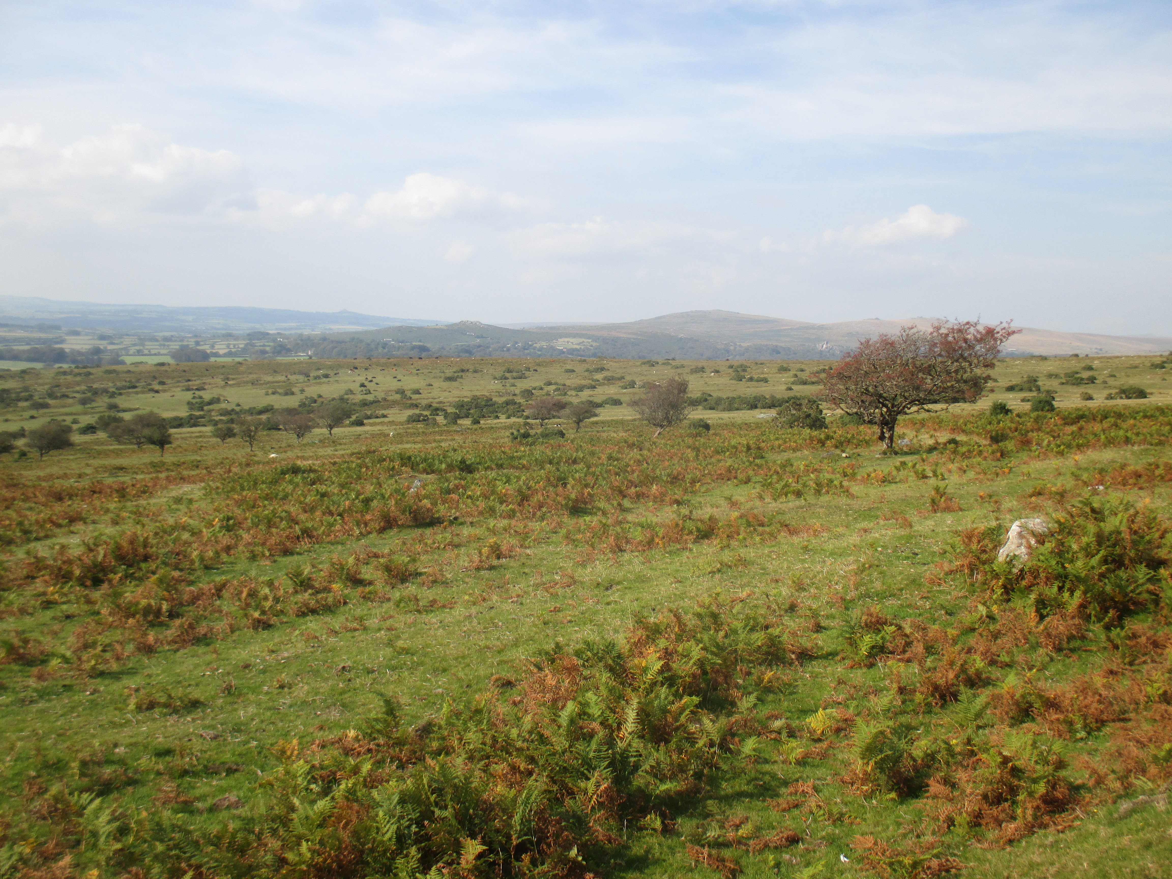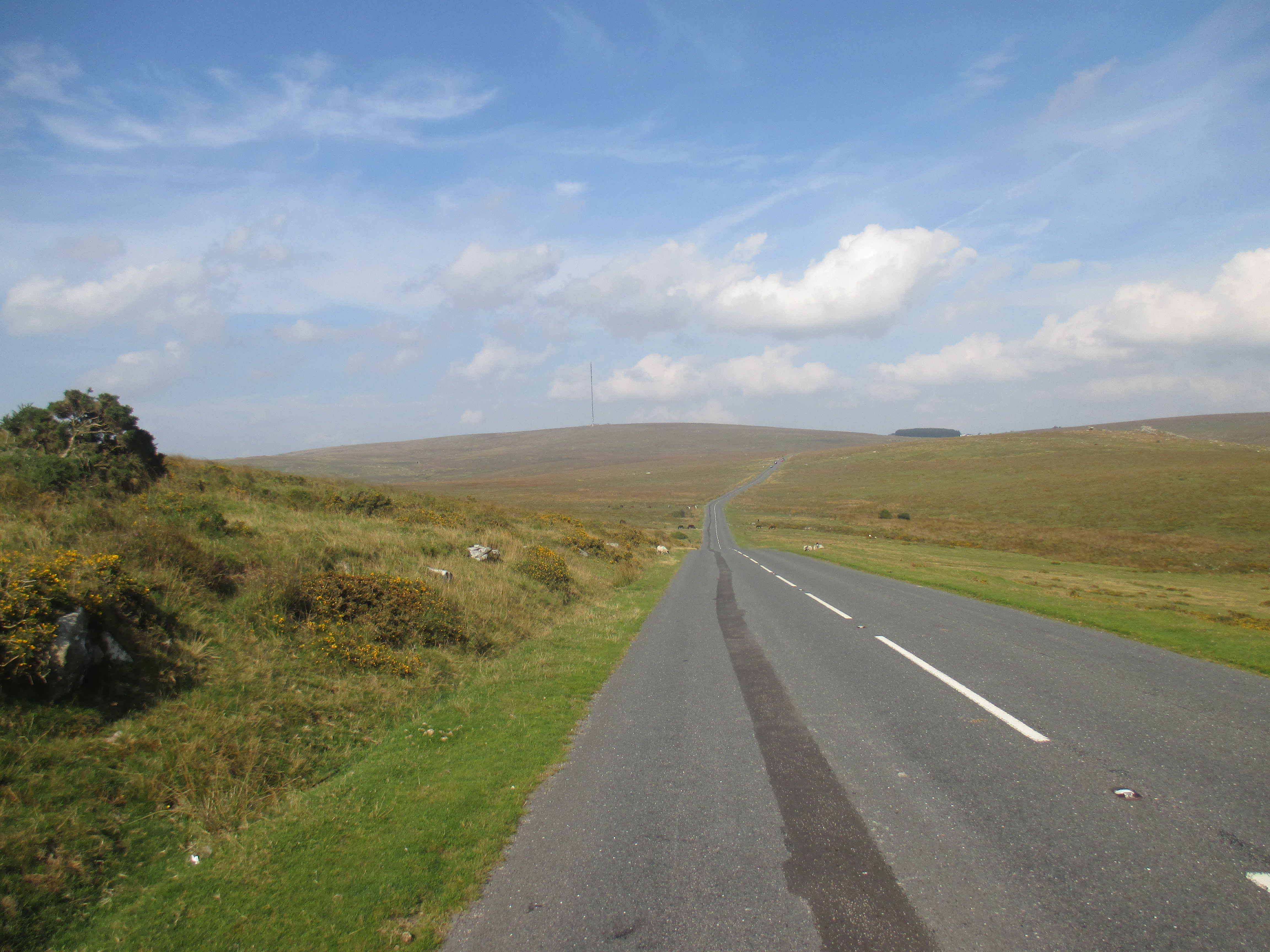 I leave Yelverton and climb up the steep but quiet road up into Dartmoor. I’m just taken aback by the wilderness and rugged majesty of the scenery, of which there’s little hint until one takes the high road to Princetown. The hills steep up but there’s little on them, very few trees except the odd cluster that form a woods, giving out splendid wide views of the moors, a mixture of golden-russet browns and faded dark greens of the wilting bracken, the yellow buds of the gorse, small trenches and grooves in the grass which cause it to continually ripple, and all about these rocky tors, crops of rock embedded within the terrain with the same mystery and oblique sophistication as the menhirs of Orkney or West Penwith. There are animals roaming the land: plenty of sheep of different breeds, black-faced and white-faced, then small horses and ponies that at times dash across the road as traffic approaches.