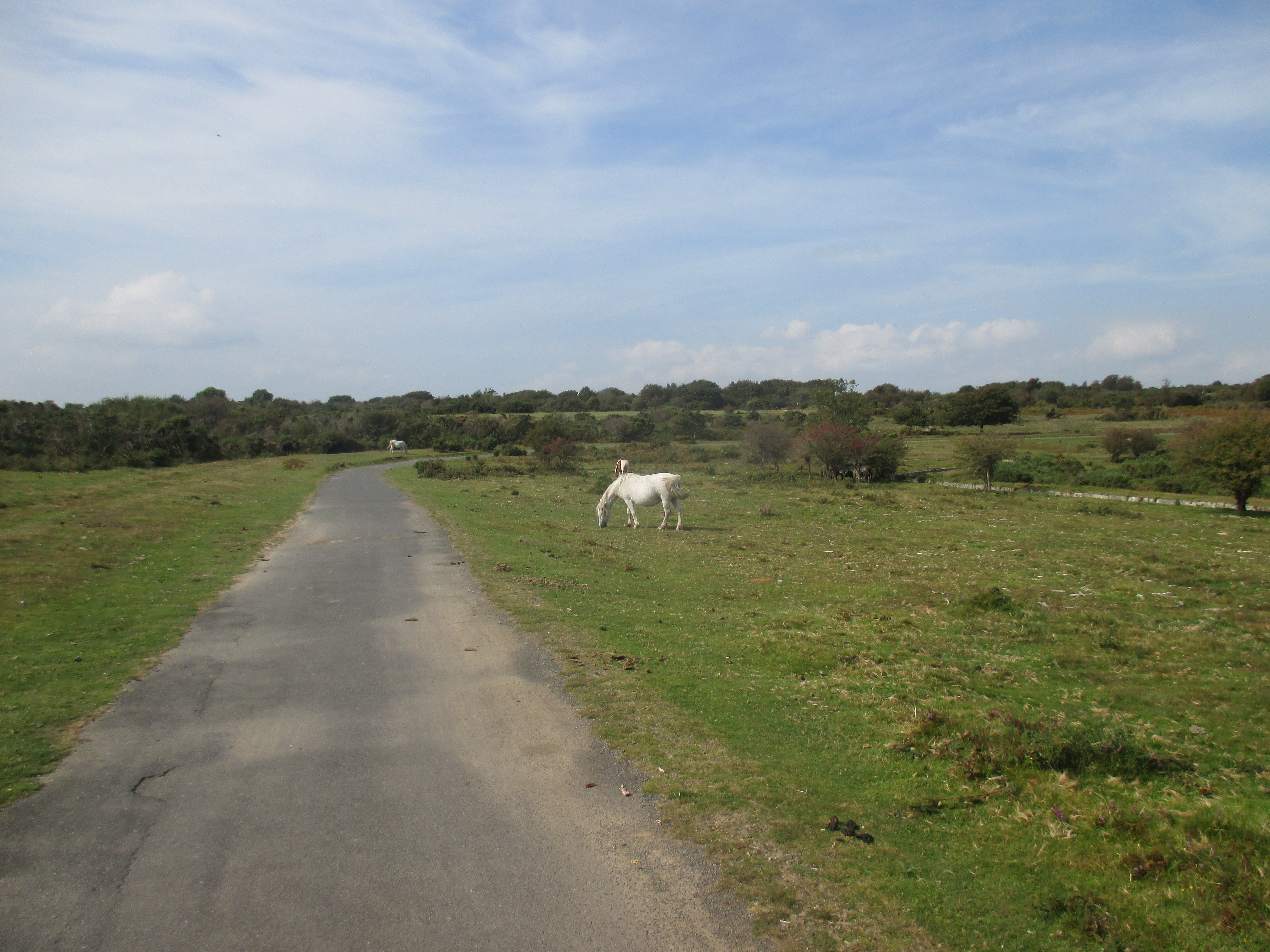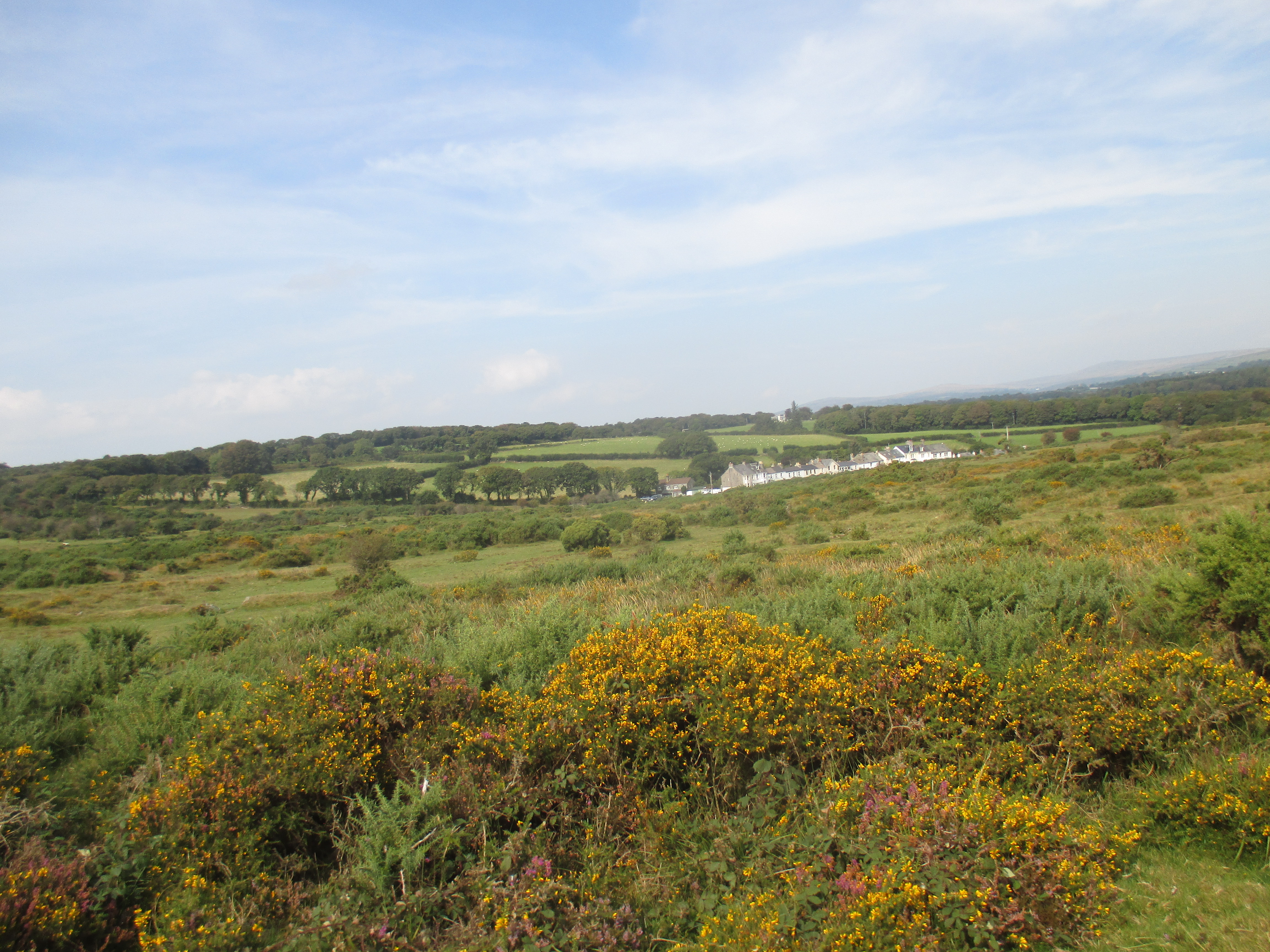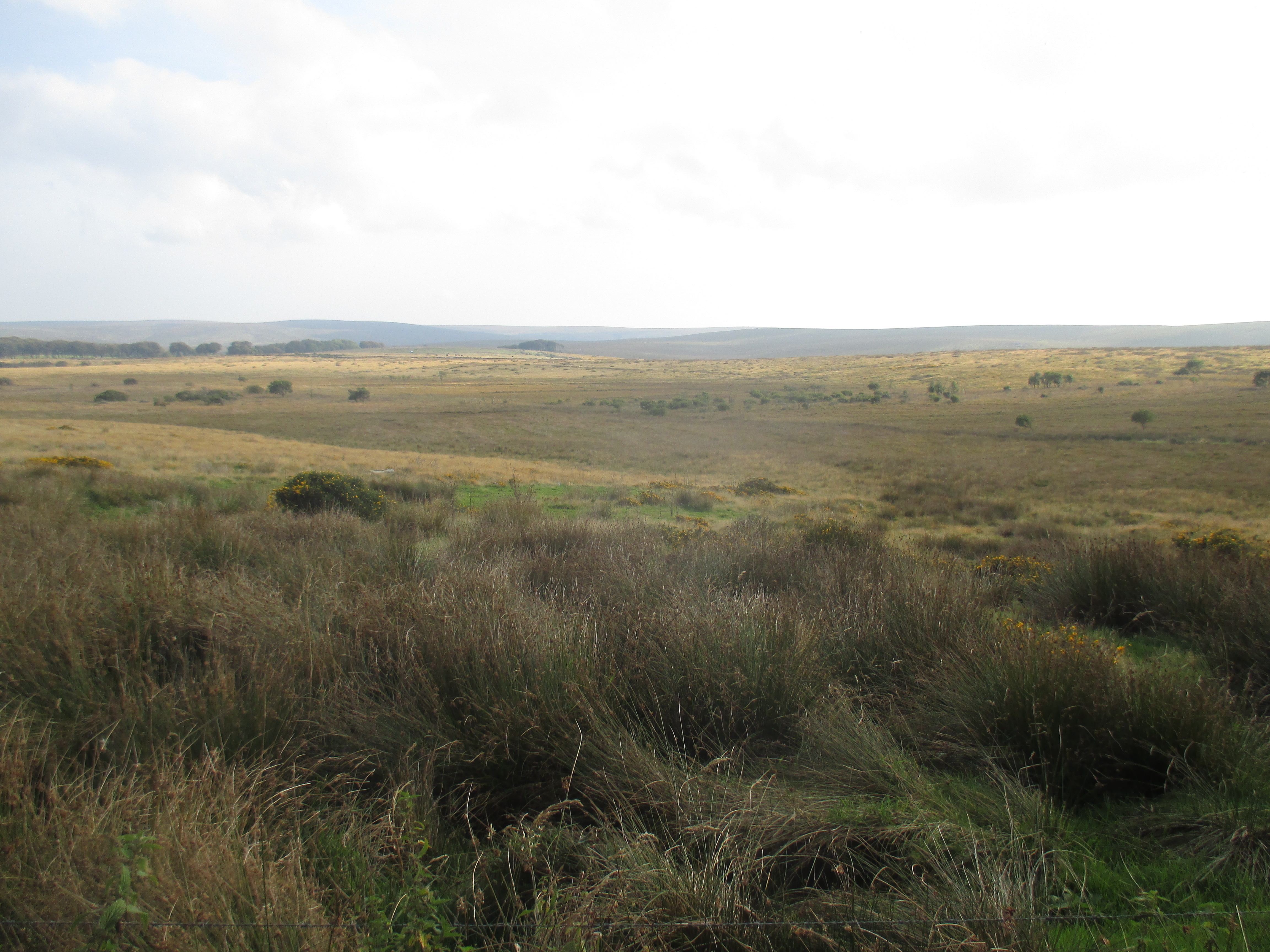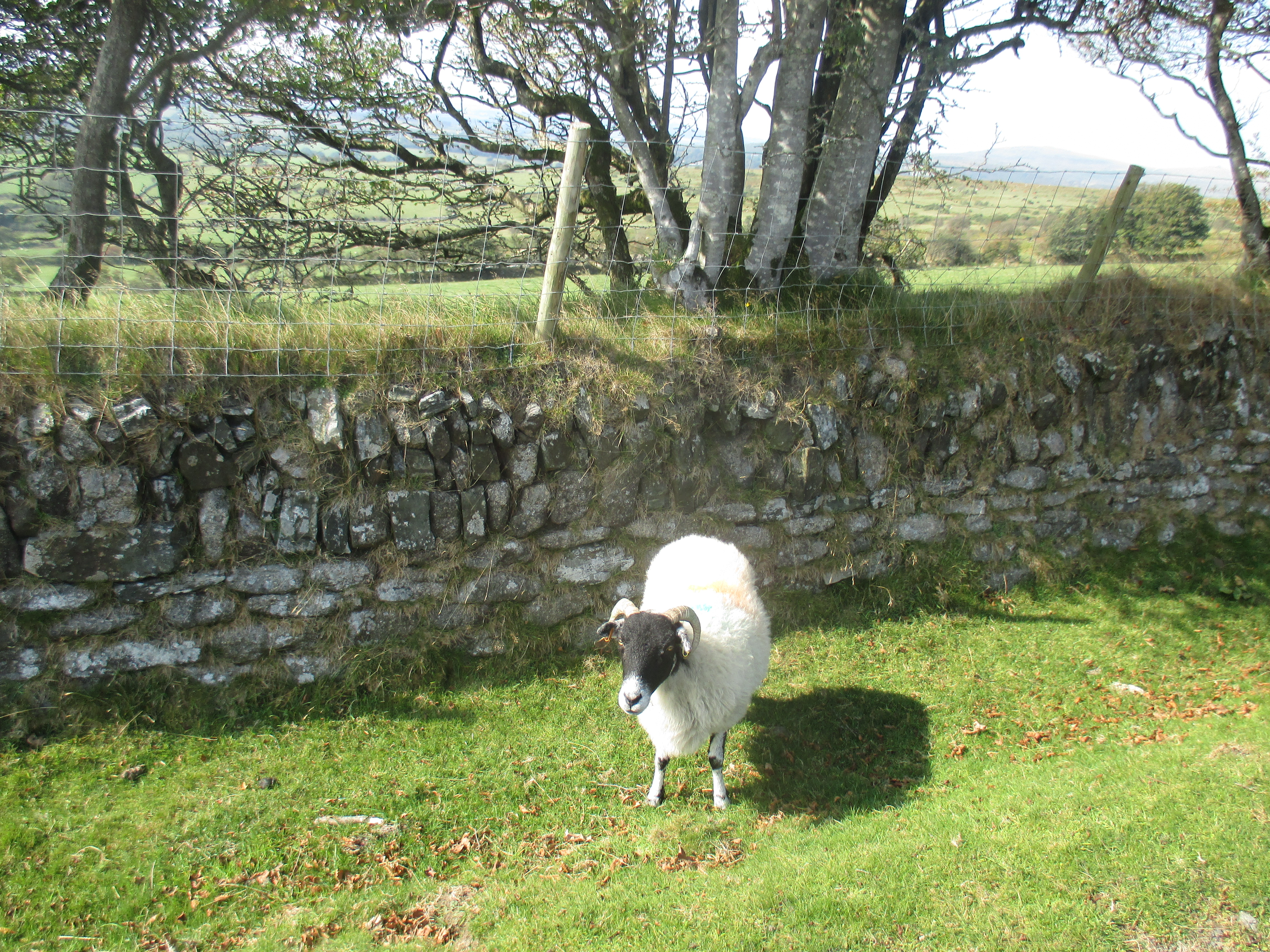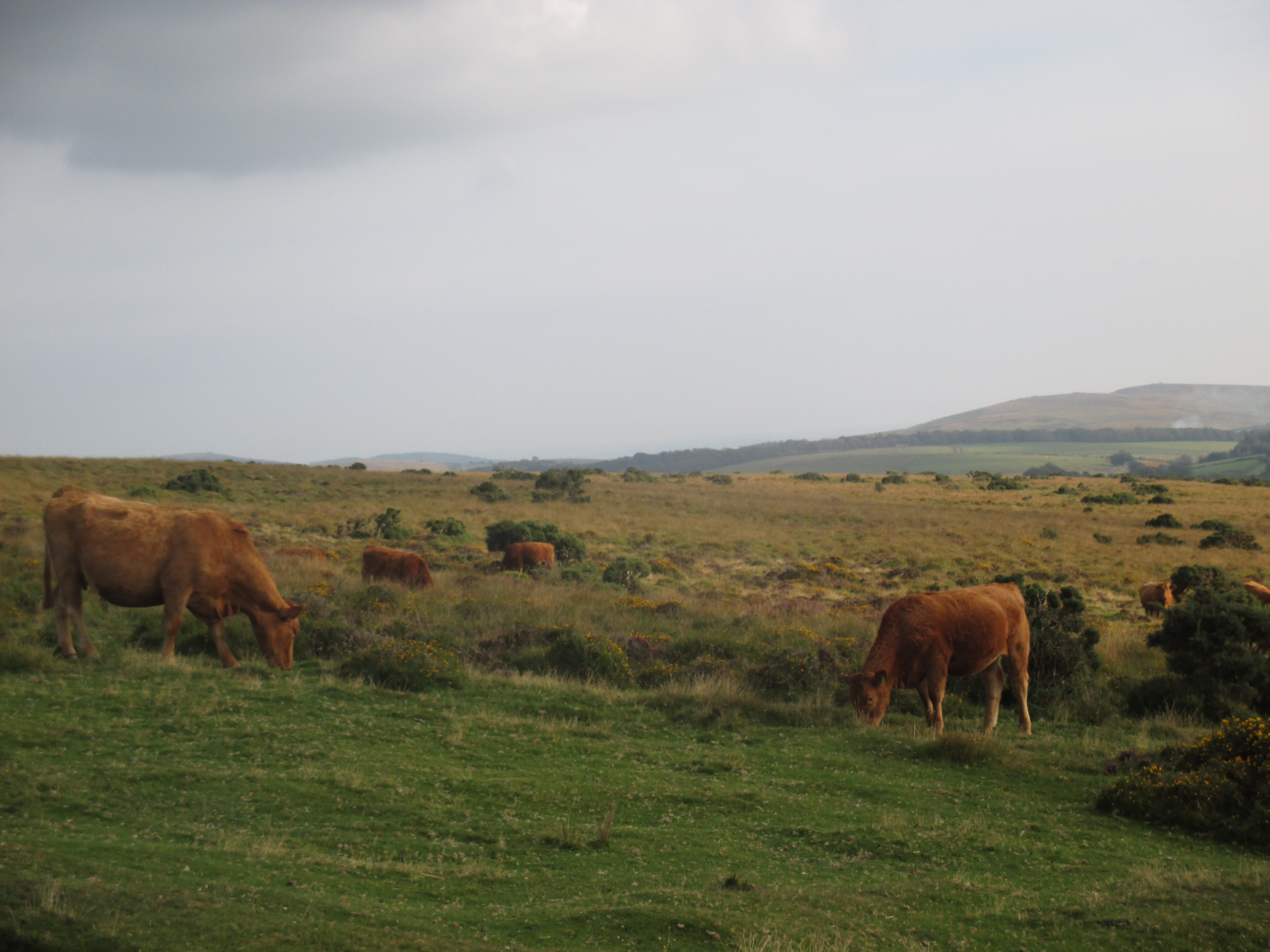 I leave Yelverton and climb up the steep but quiet road up into Dartmoor. I’m just taken aback by the wilderness and rugged majesty of the scenery, of which there’s little hint until one takes the high road to Princetown. The hills steep up but there’s little on them, very few trees except the odd cluster that form a woods, giving out splendid wide views of the moors, a mixture of golden-russet browns and faded dark greens of the wilting bracken, the yellow buds of the gorse, small trenches and grooves in the grass which cause it to continually ripple, and all about these rocky tors, crops of rock embedded within the terrain with the same mystery and oblique sophistication as the menhirs of Orkney or West Penwith. There are animals roaming the land: plenty of sheep of different breeds, black-faced and white-faced, then small horses and ponies that at times dash across the road as traffic approaches.
