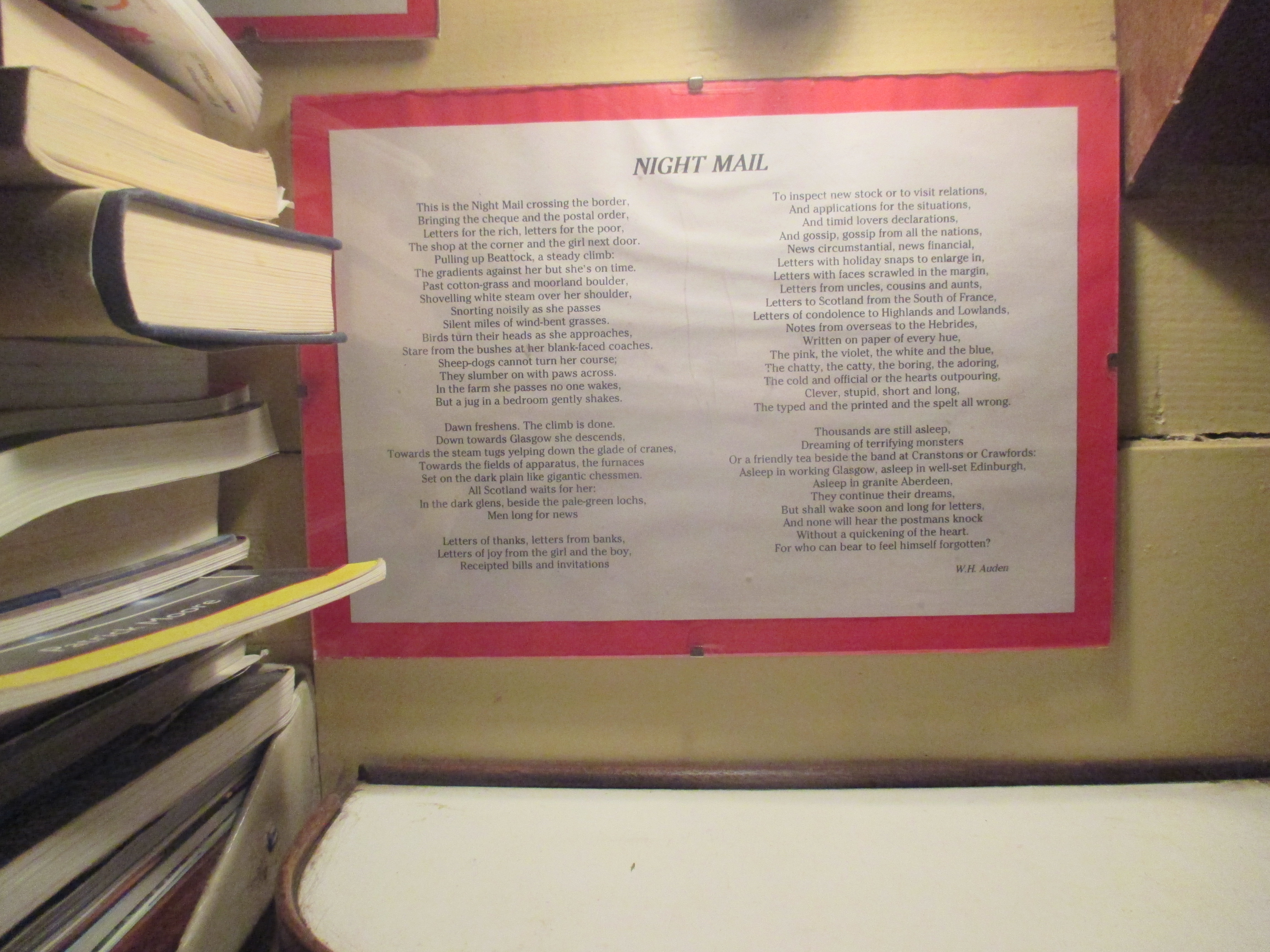 ‘Has the world changed, or have I changed?’ The world’s changing, it always has, and changing us at the rate that we change it. As I rub my eyes and yawn with tiredness, I peer at the poem “Night Mail” by W.H. Auden, framed on the brake-van wall. ‘Letters of thanks, letters from banks // Letters of joy from the girl and the boy’, one world alive with communications amongst itself, not digital but by post, ‘gossip, gossip from all the nations’. There’s a ‘quickening of the heart’ when a non-spam email is received, like the ‘postman’s knock’ eight decades back. Something dated, something timeless, for, as Auden ends, and the kernel of truth in all this: ‘who can bear to feel himself forgotten?’