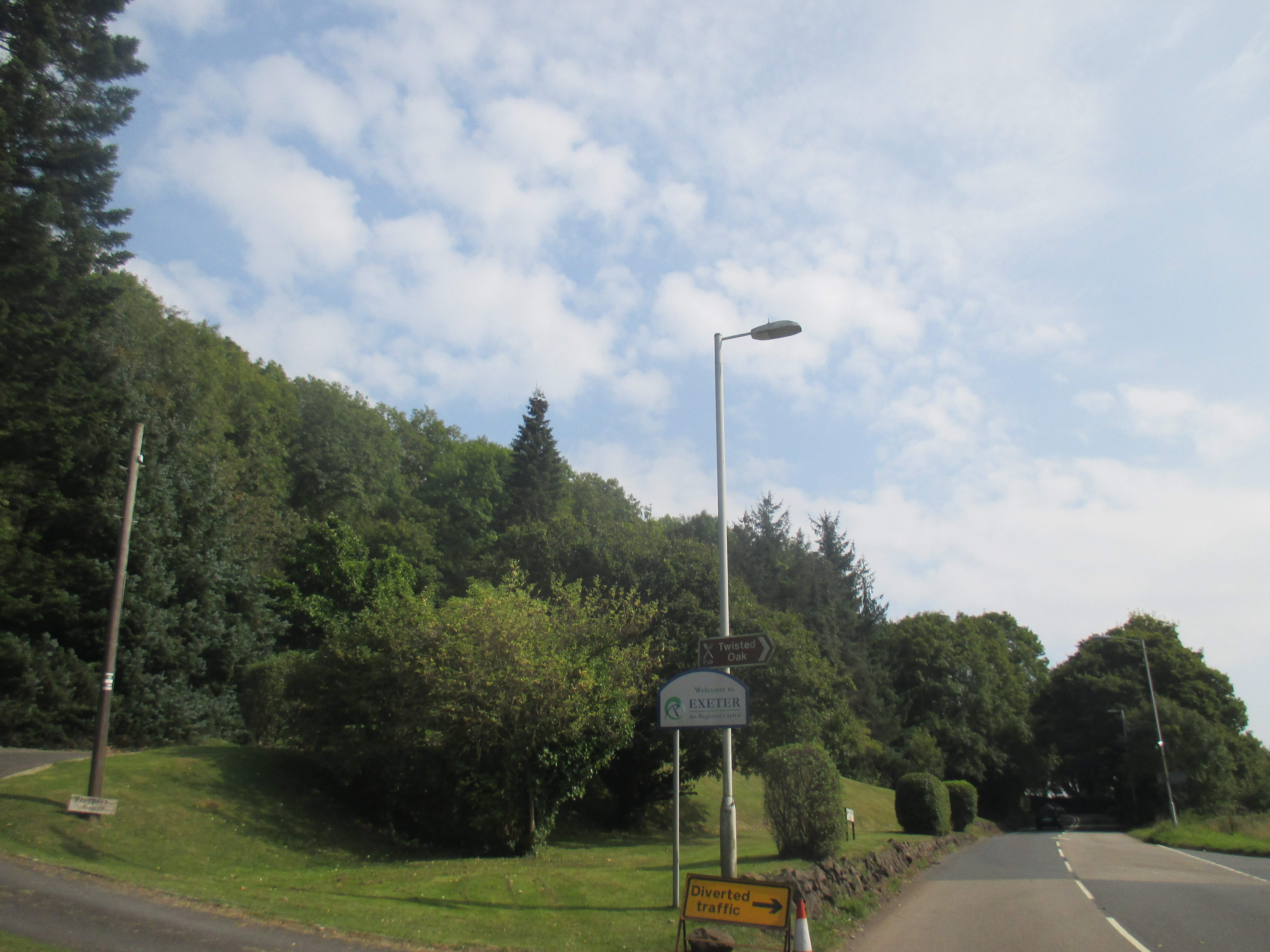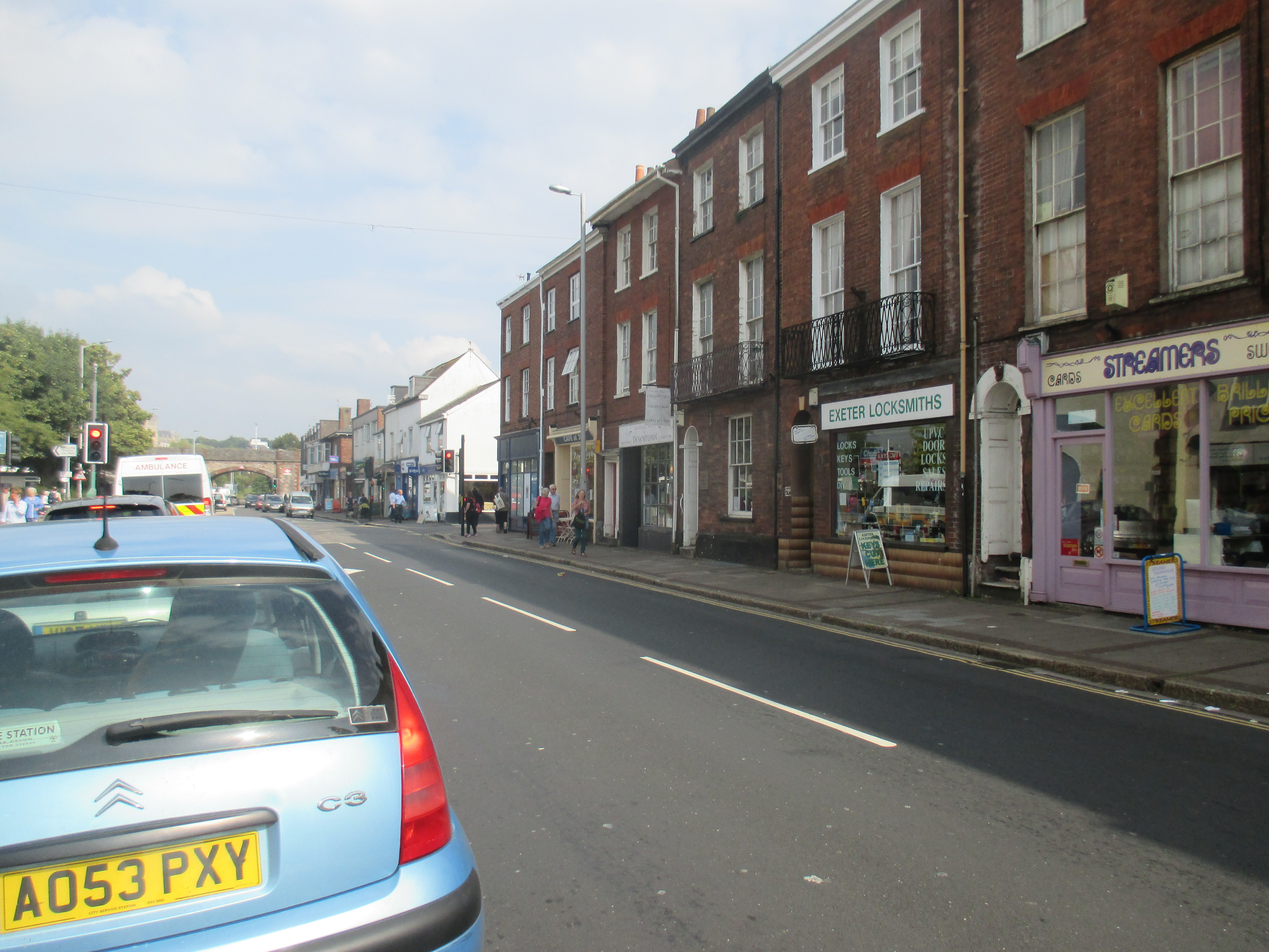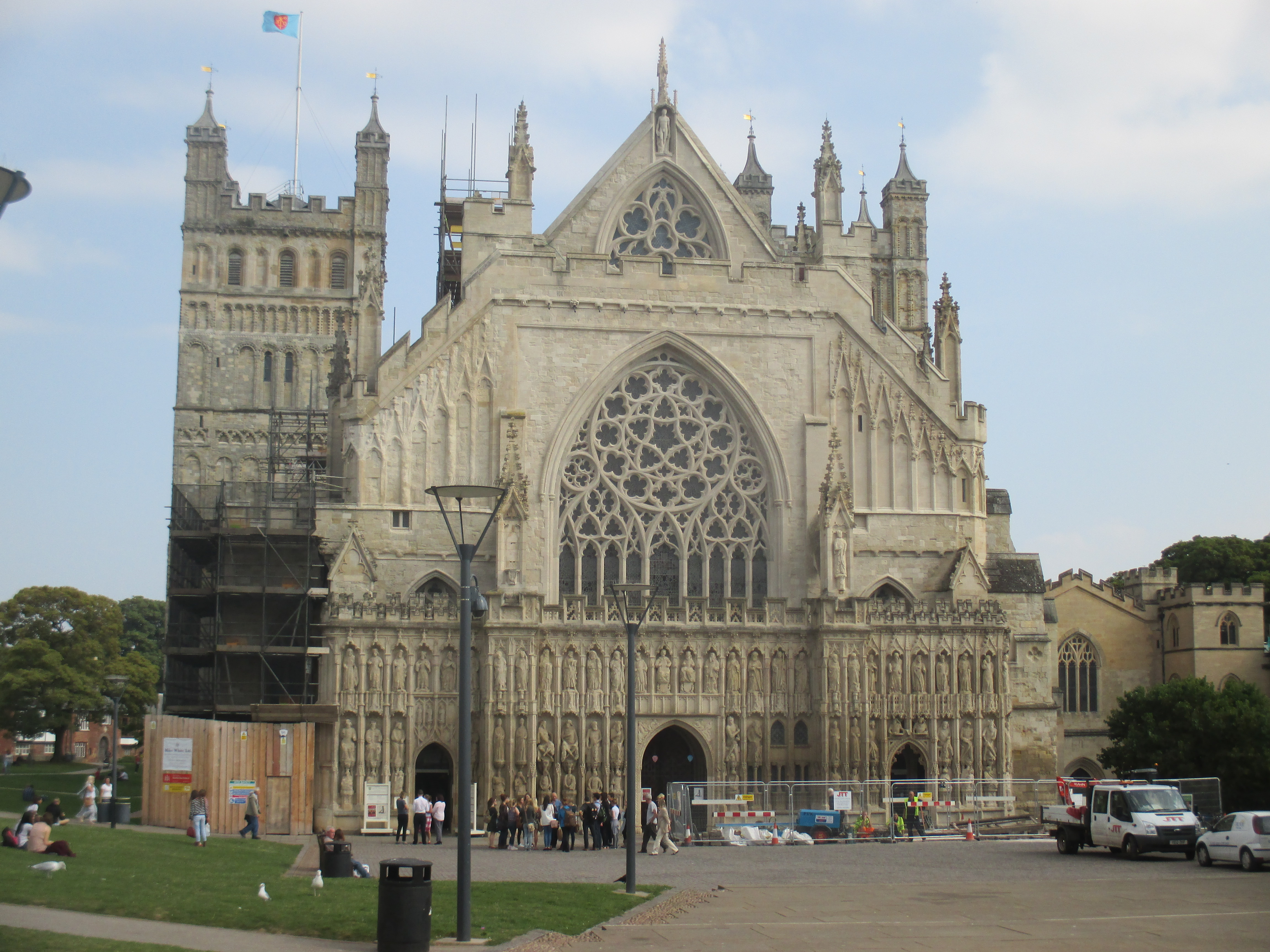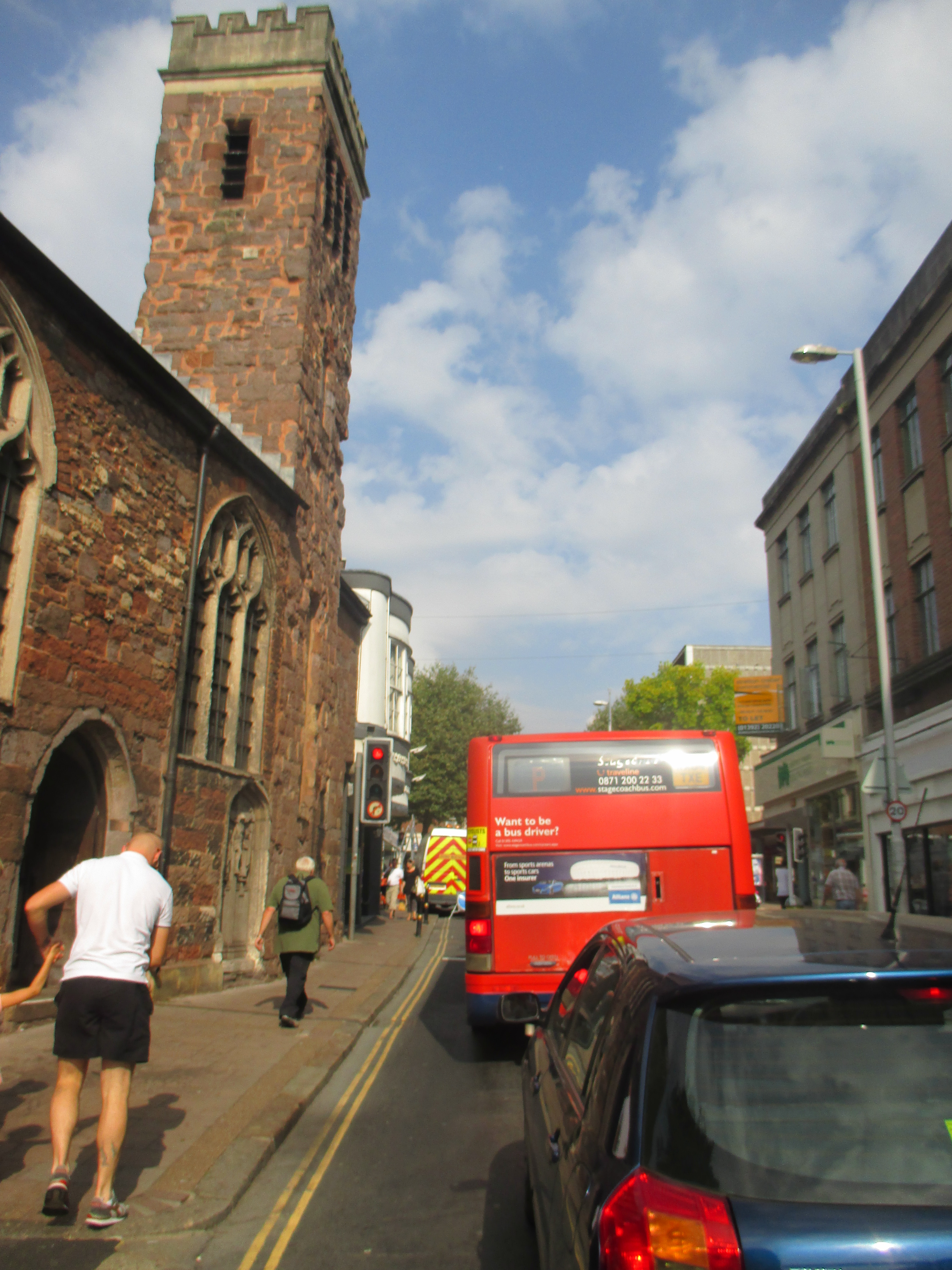 I ride out of Christow, passing the ruins of an old helicopter and a Christian retreat centre, all in strange proximity to Teign Rail and each other, before riding up towards Exeter. The land is more cultivated here than Cornwall, with thick hedgerows lining the road, and beyond them sweeping cocoa-coloured fields, freshly tilled, or wide expanses of golden corn fields. Clusters of woods peep up here and there as the road rises up towards Exeter then plunges down towards the city, situated in a valley. Its huge cathedral is remarkable from a distance, the bright white of its marble and gothic features dominating everything around it. It must’ve appeared staggeringly otherworldly to the rural Devonshire people as they travelled into the town for market days. The rest of the town is small and underwhelming. I push through Exeter St. Thomas, a tatty but friendly seeming suburb, then over the river Exe and into the centre.