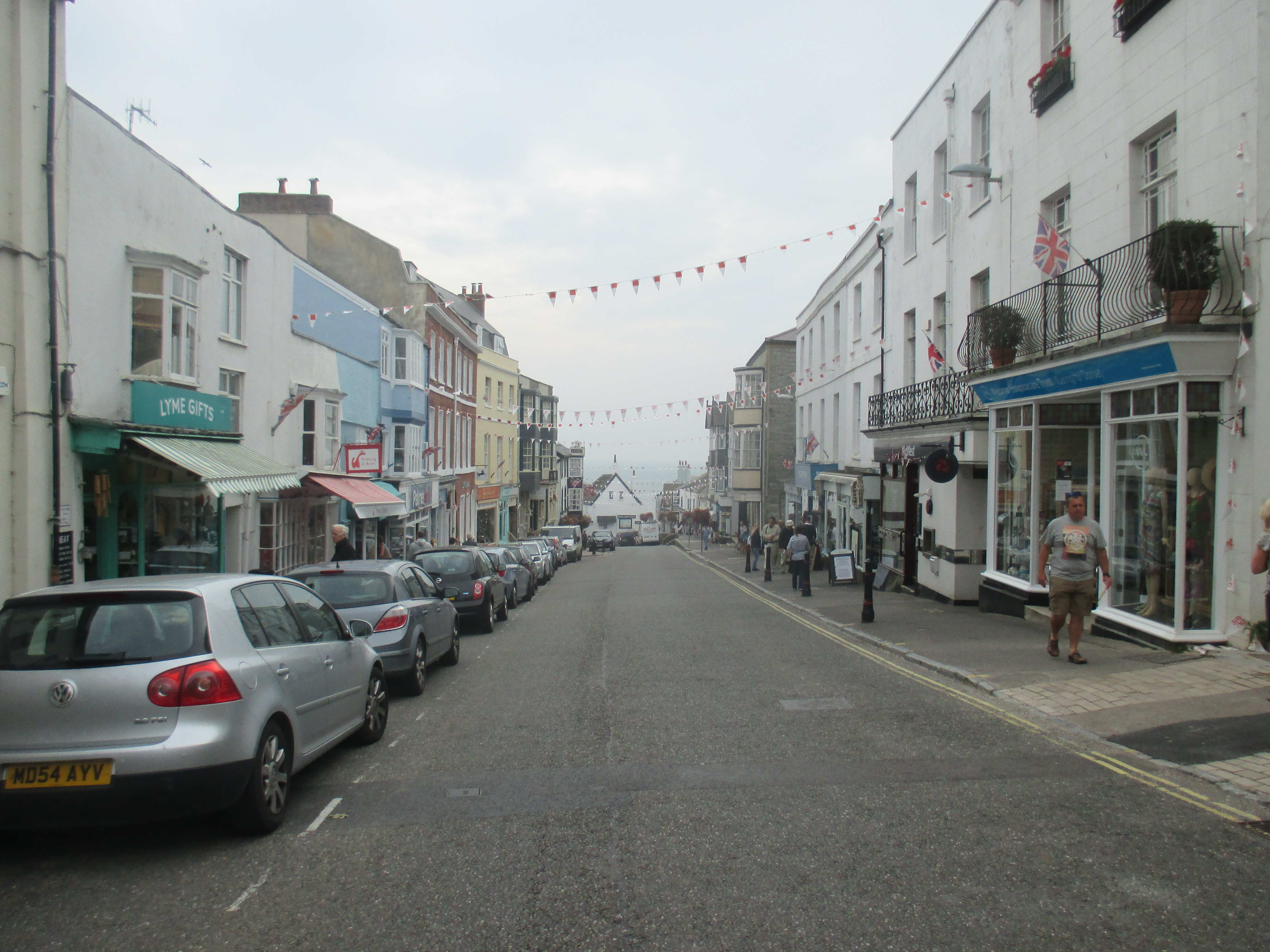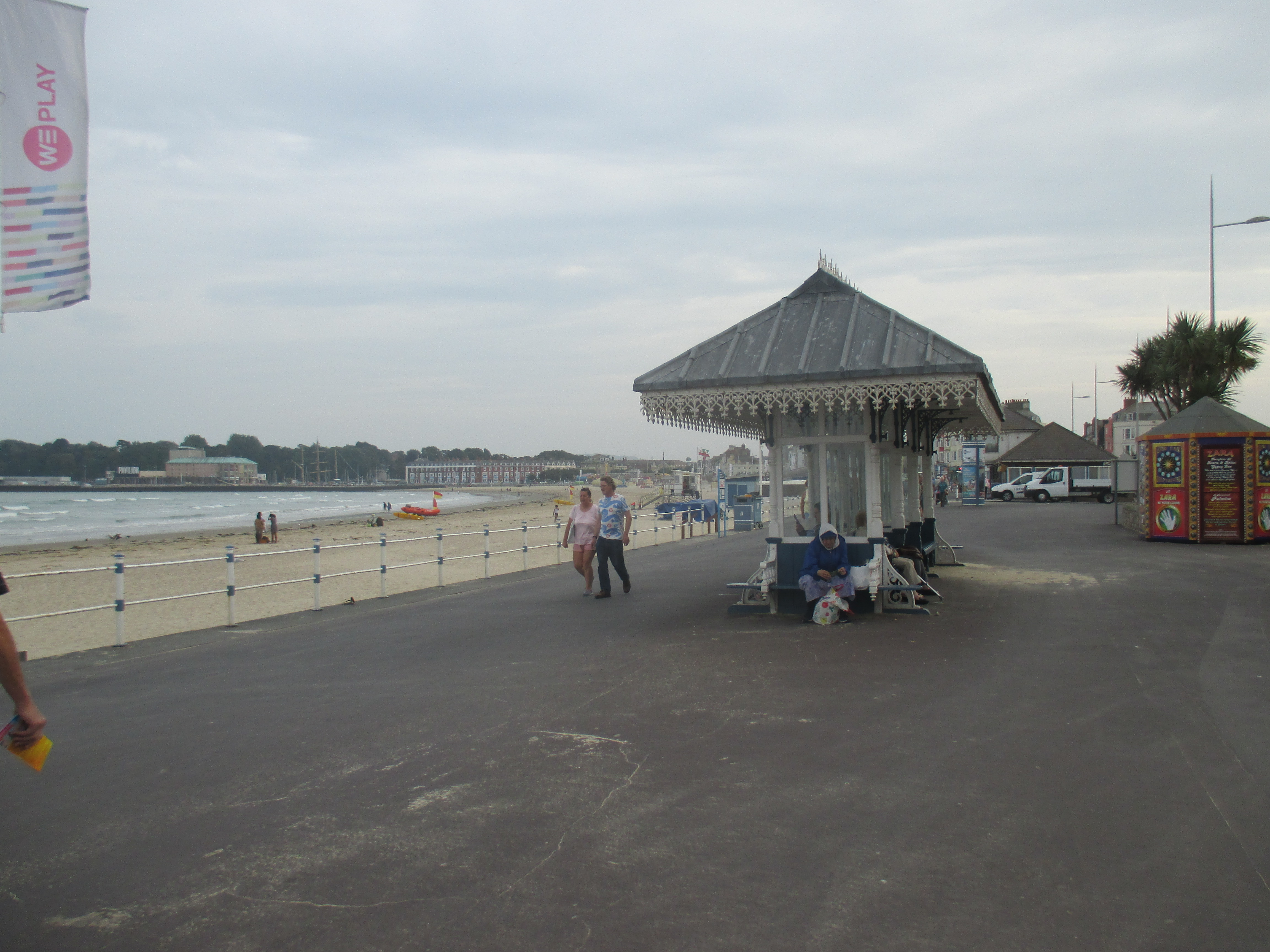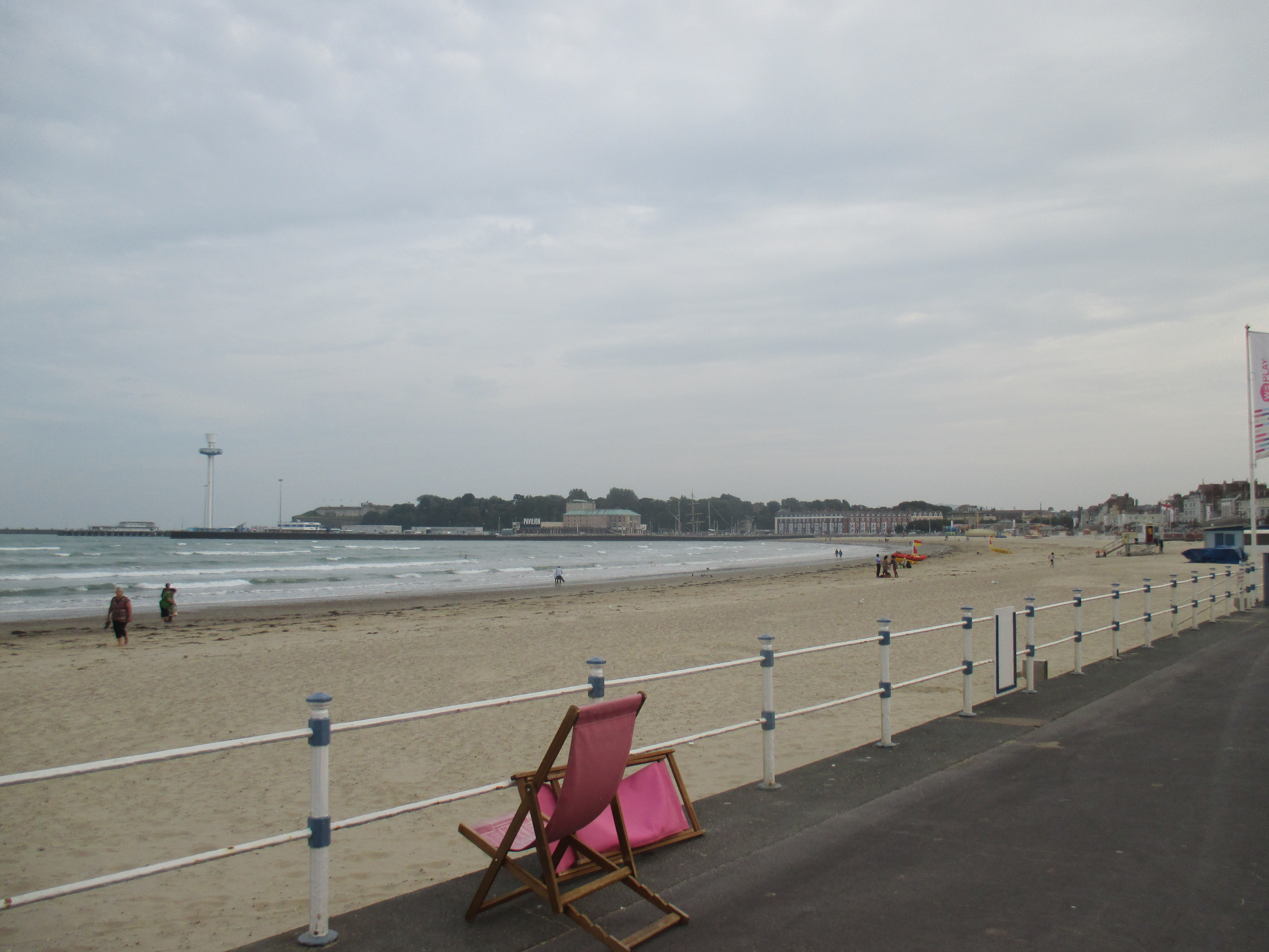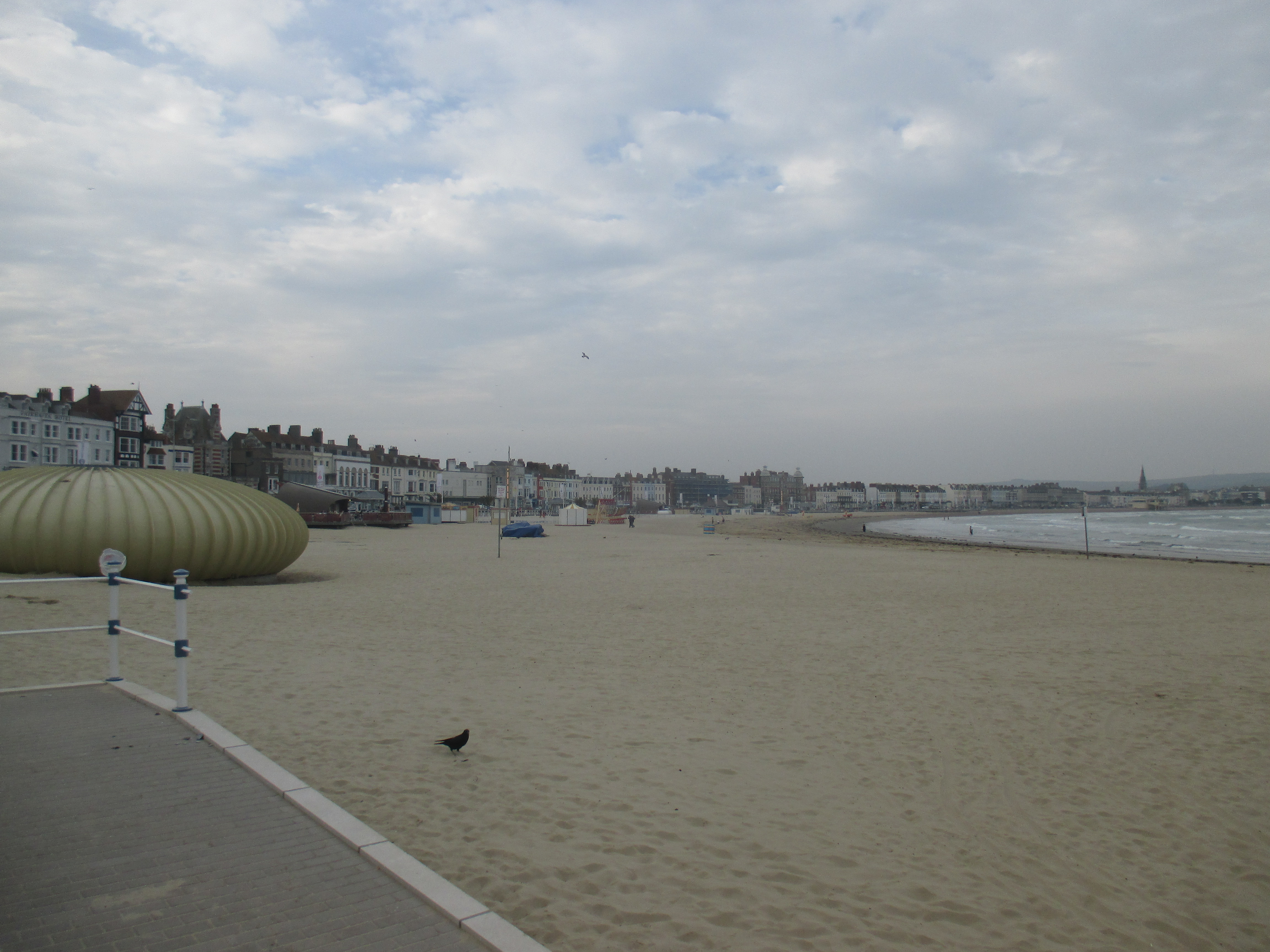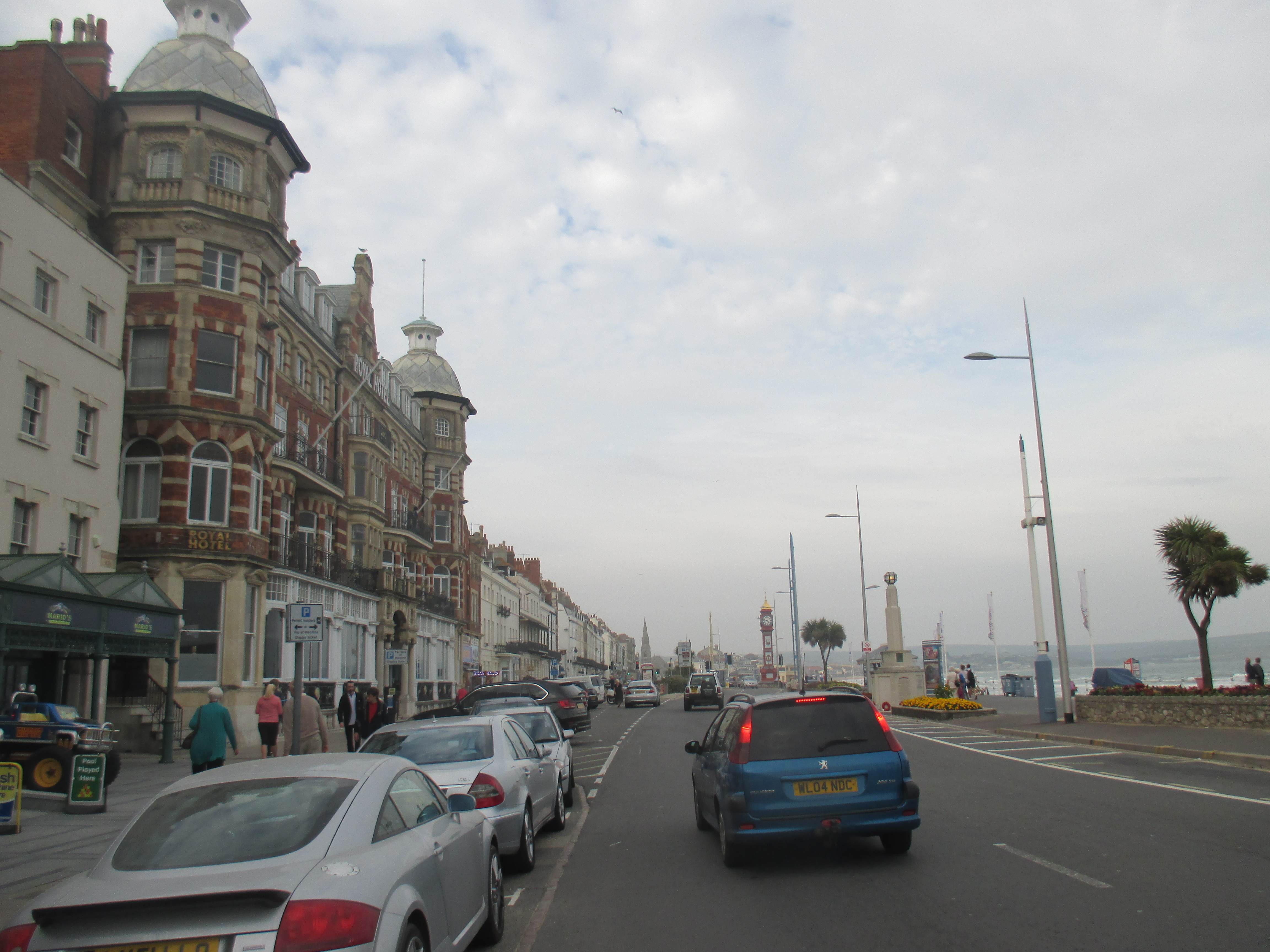 Wyke road is long and dull, a steep rise then drop into the large harbour at Weymouth. There’s a couple of retail barns on the other side, but the town itself largely retains the character of a Georgian-cum-Victorian seaside resort. Its long esplanade and twee shelters look pretty against the backdrop of the light-tan sands and an unoccupied beach. A long row of Victorian townhouses stand along the prom, bay windows and tall staircases jutting out. There are countless fish and chips and amusement businesses, most of whose insignia has not been updated since the Eighties.