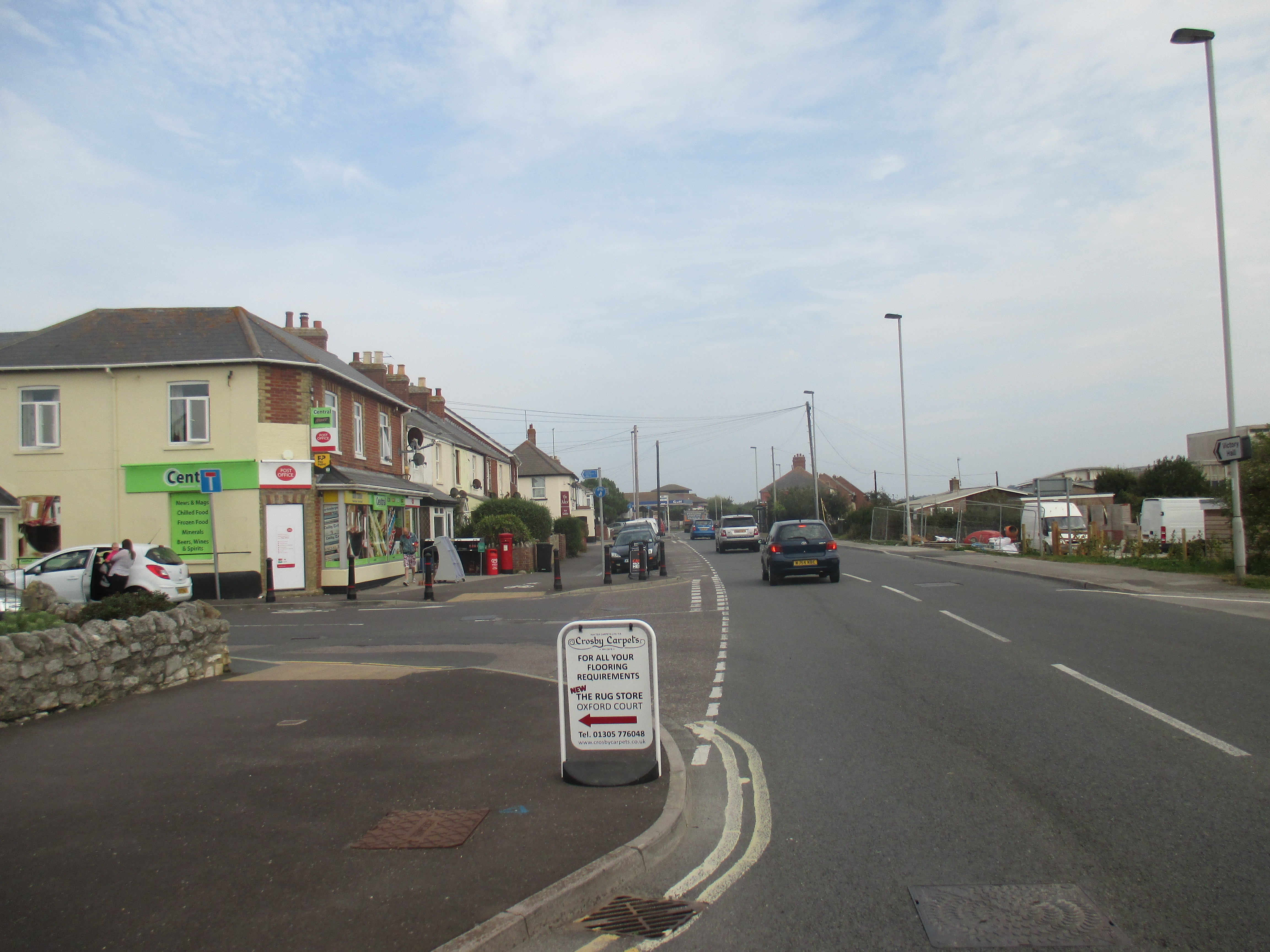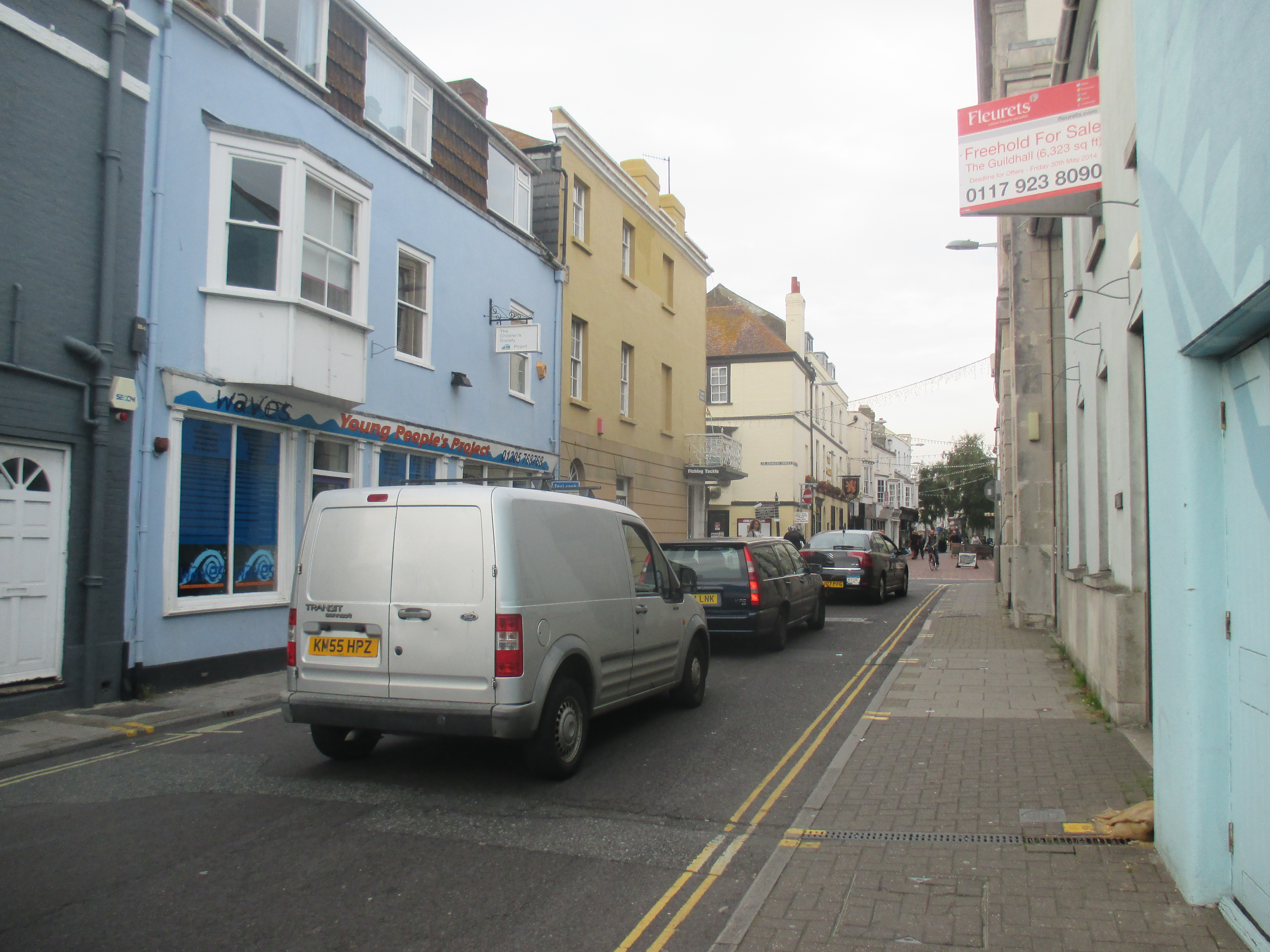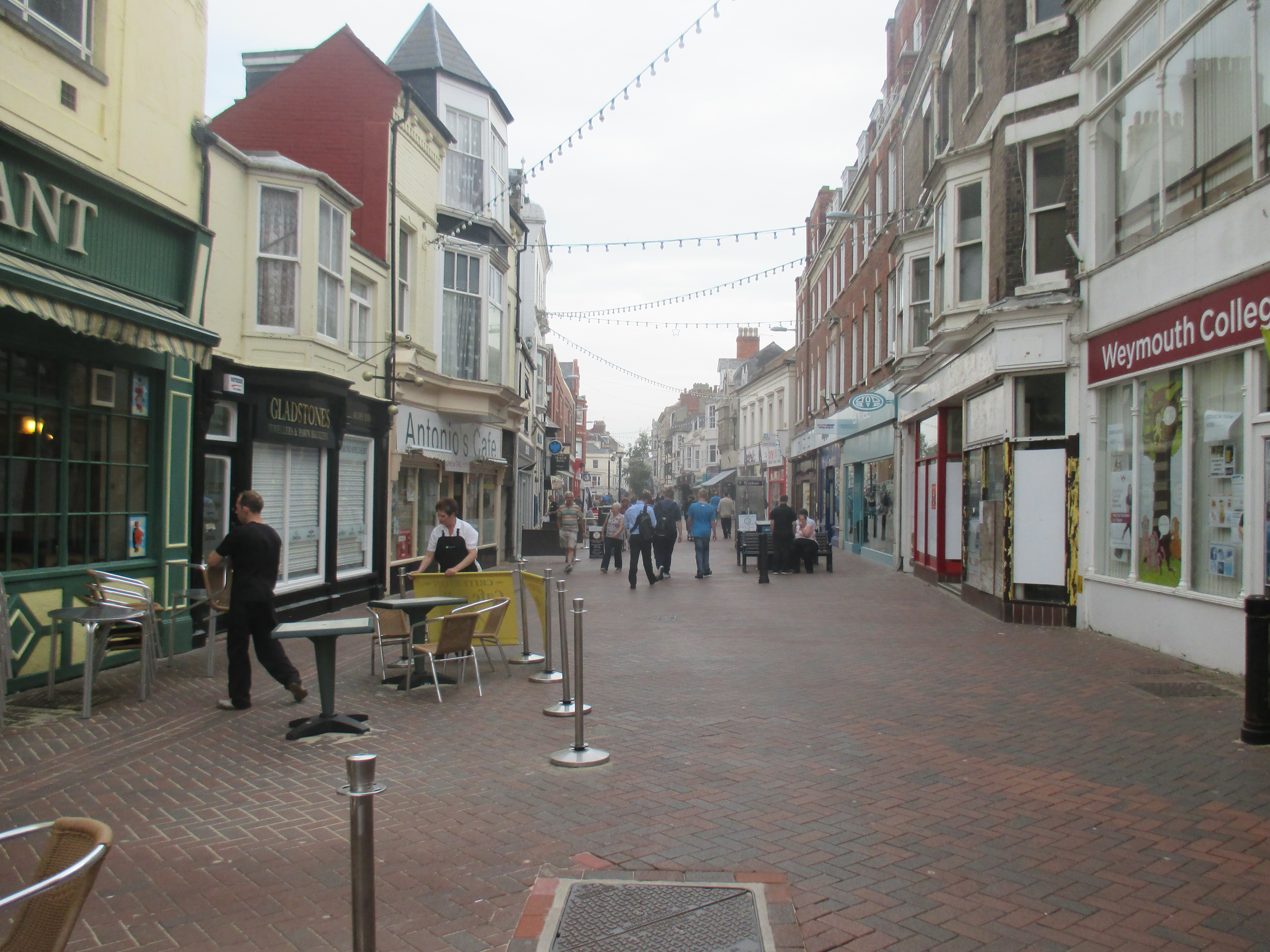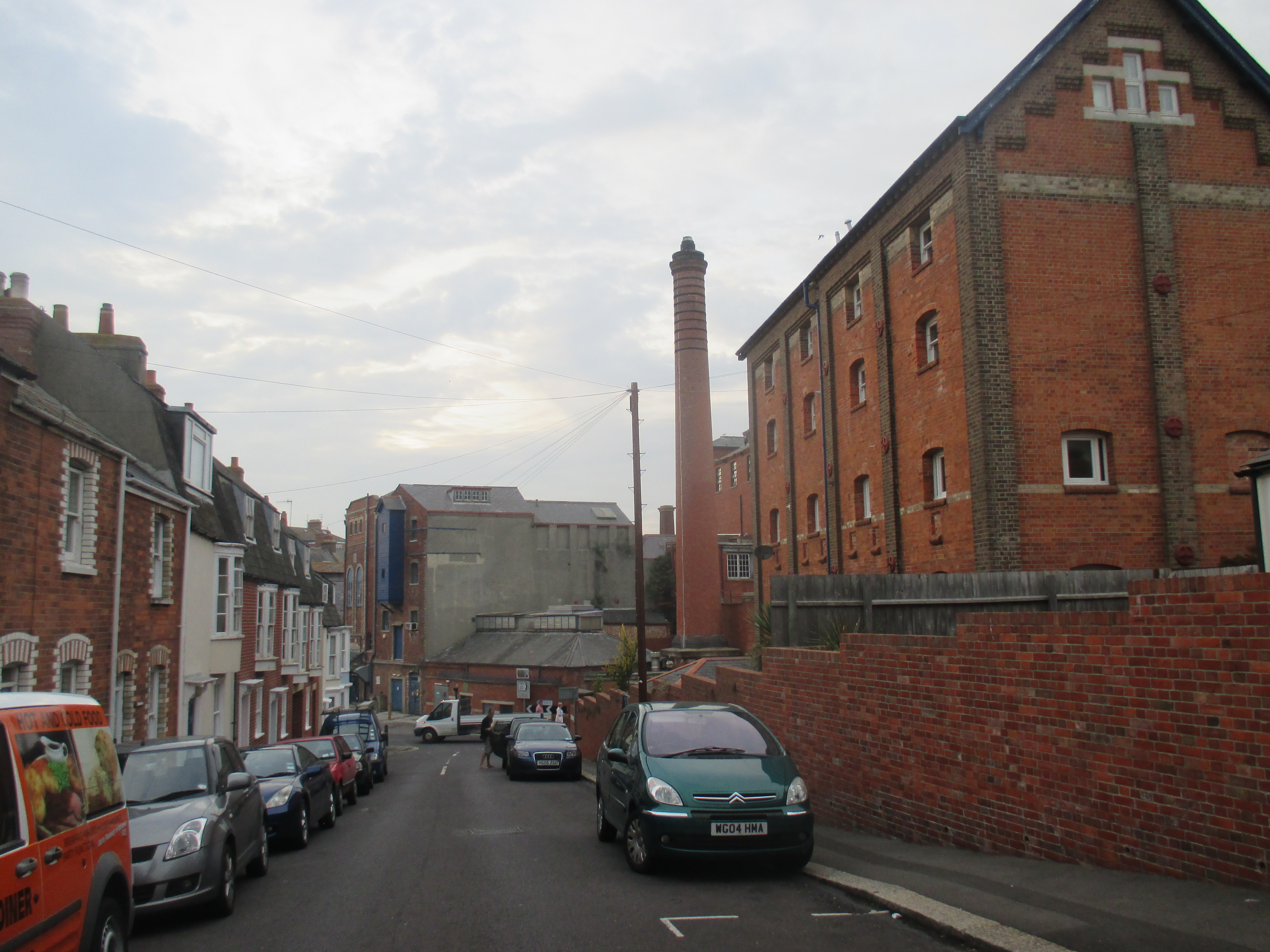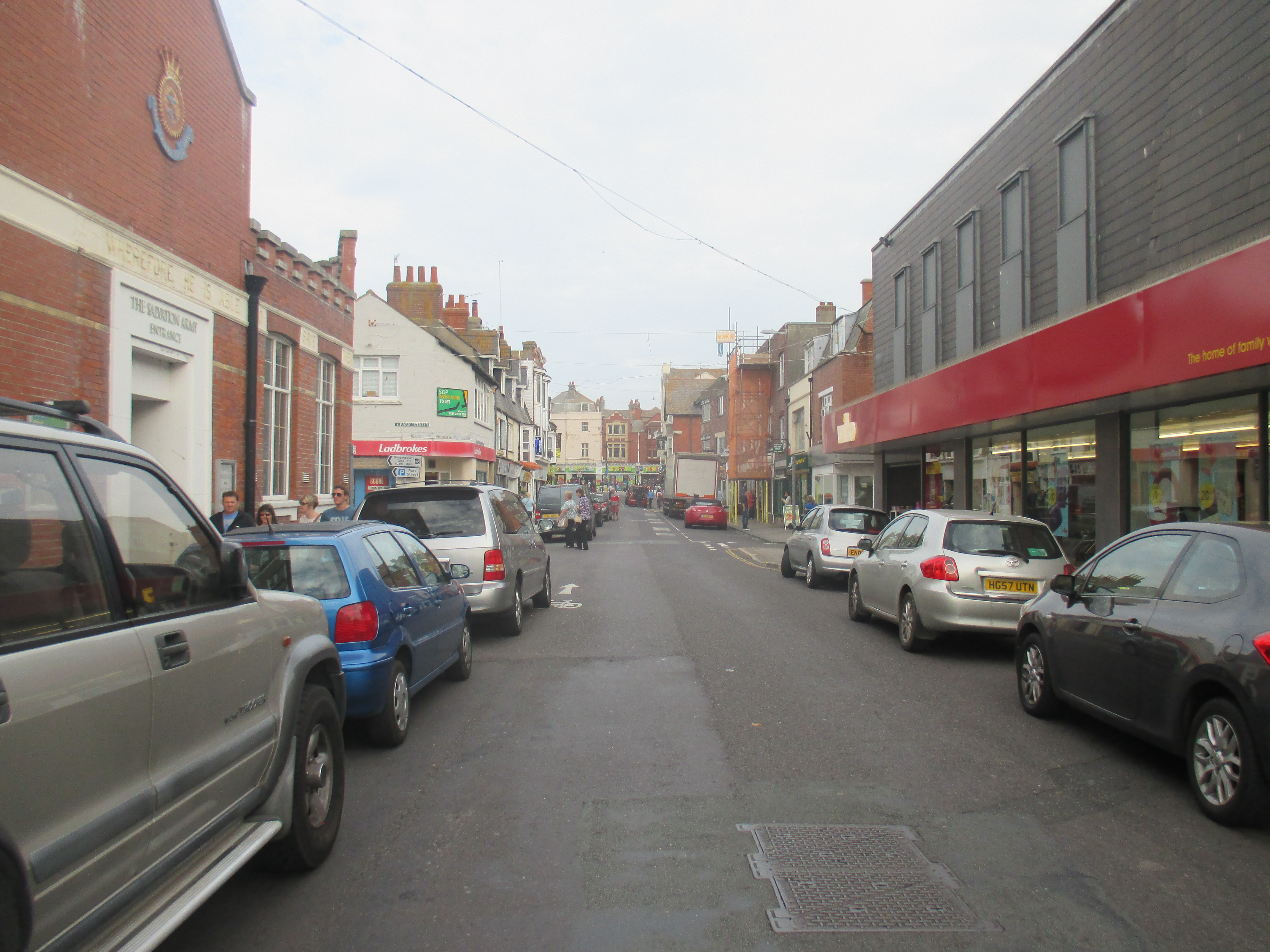Wyke road is long and dull, a steep rise then drop into the large harbour at Weymouth. There’s a couple of retail barns on the other side, but the town itself largely retains the character of a Georgian-cum-Victorian seaside resort. Its long esplanade and twee shelters look pretty against the backdrop of the light-tan sands and an unoccupied beach. A long row of Victorian townhouses stand along the prom, bay windows and tall staircases jutting out. There are countless fish and chips and amusement businesses, most of whose insignia has not been updated since the Eighties.