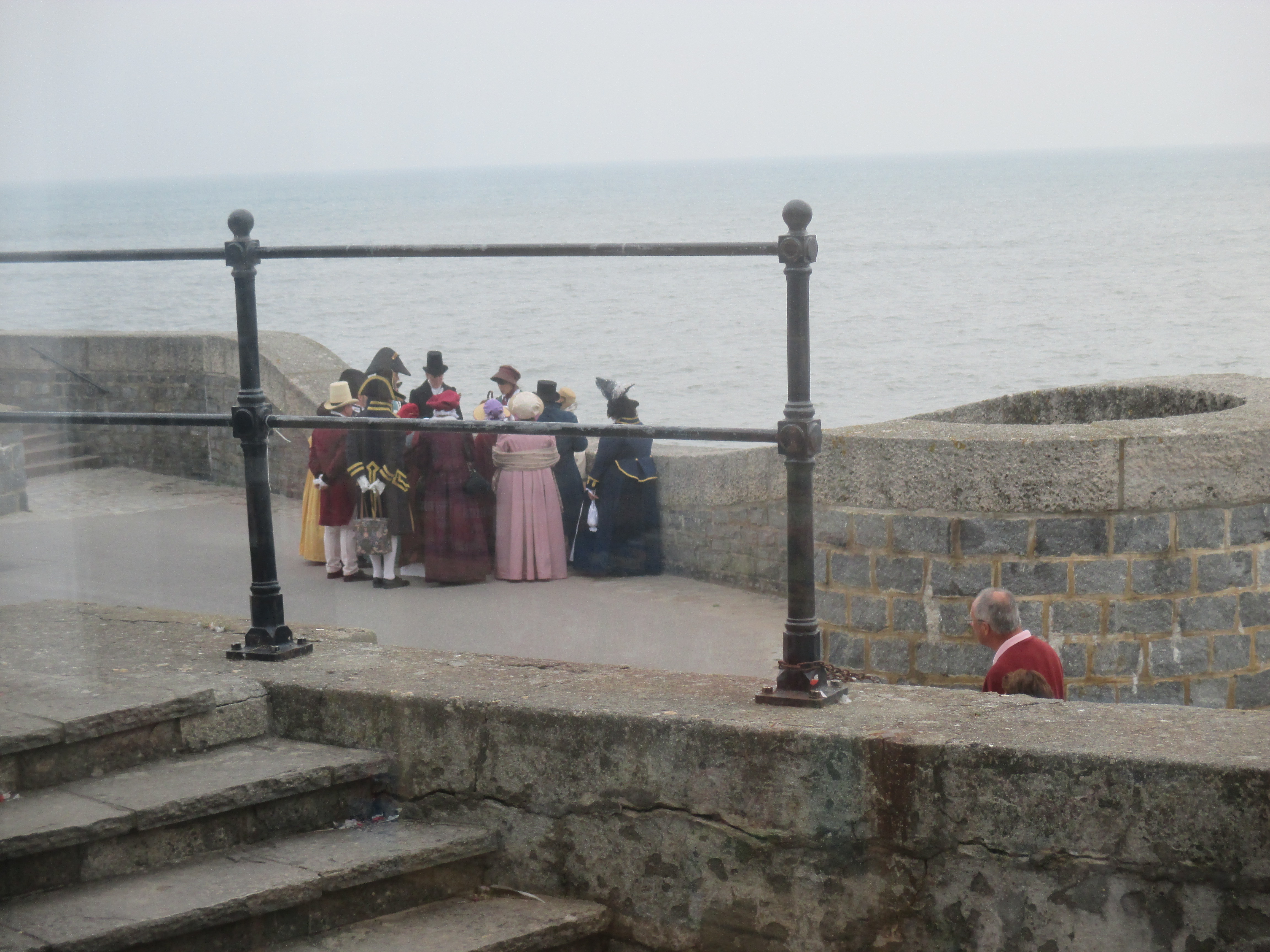 The cliffs are collapsing into the sea, 200 million years old here, 260 million years old by Exmouth. The entire area’s a world heritage site, and as I leave Monmouth beach I pass tourists clustered in a number of seaside cafes, sipping cream teas and nibbling bacon butties. There’s more fudge on sale, stuff that no-one wants to eat, but which we all must buy. Hikers bulk-buy sandwiches. I get some half-price cereal bars at the Co-op, a bag of granola at Tesco, and head down towards Lyme’s museum. Near the Marine Theatre, a group dressed in Regency garb wander along the sea-front, a party of Americans just arrived from Bath. They are surprisingly sober and humourless, perhaps attempting even the emotional cladding of that period, and look out onto the windy bay.