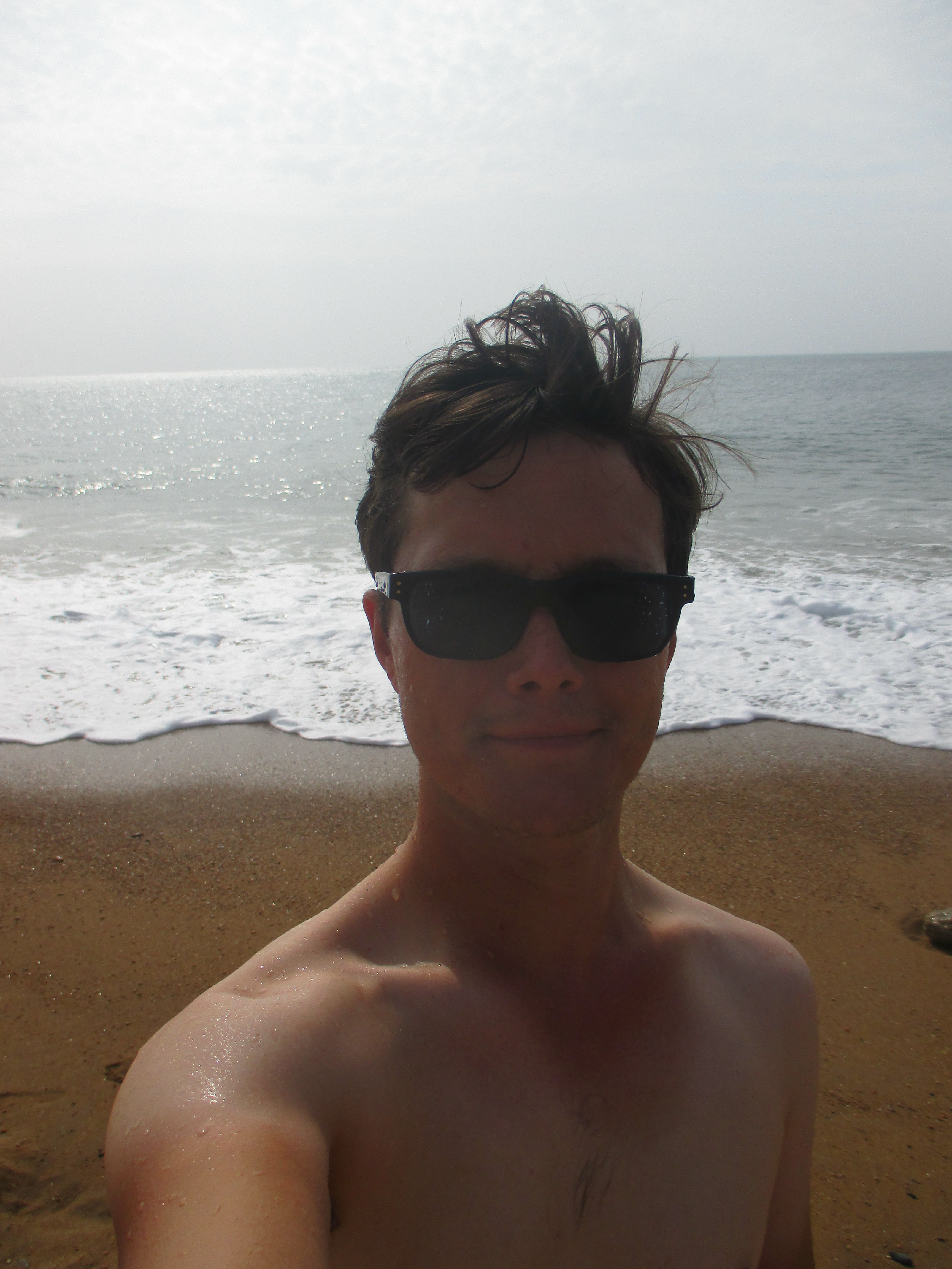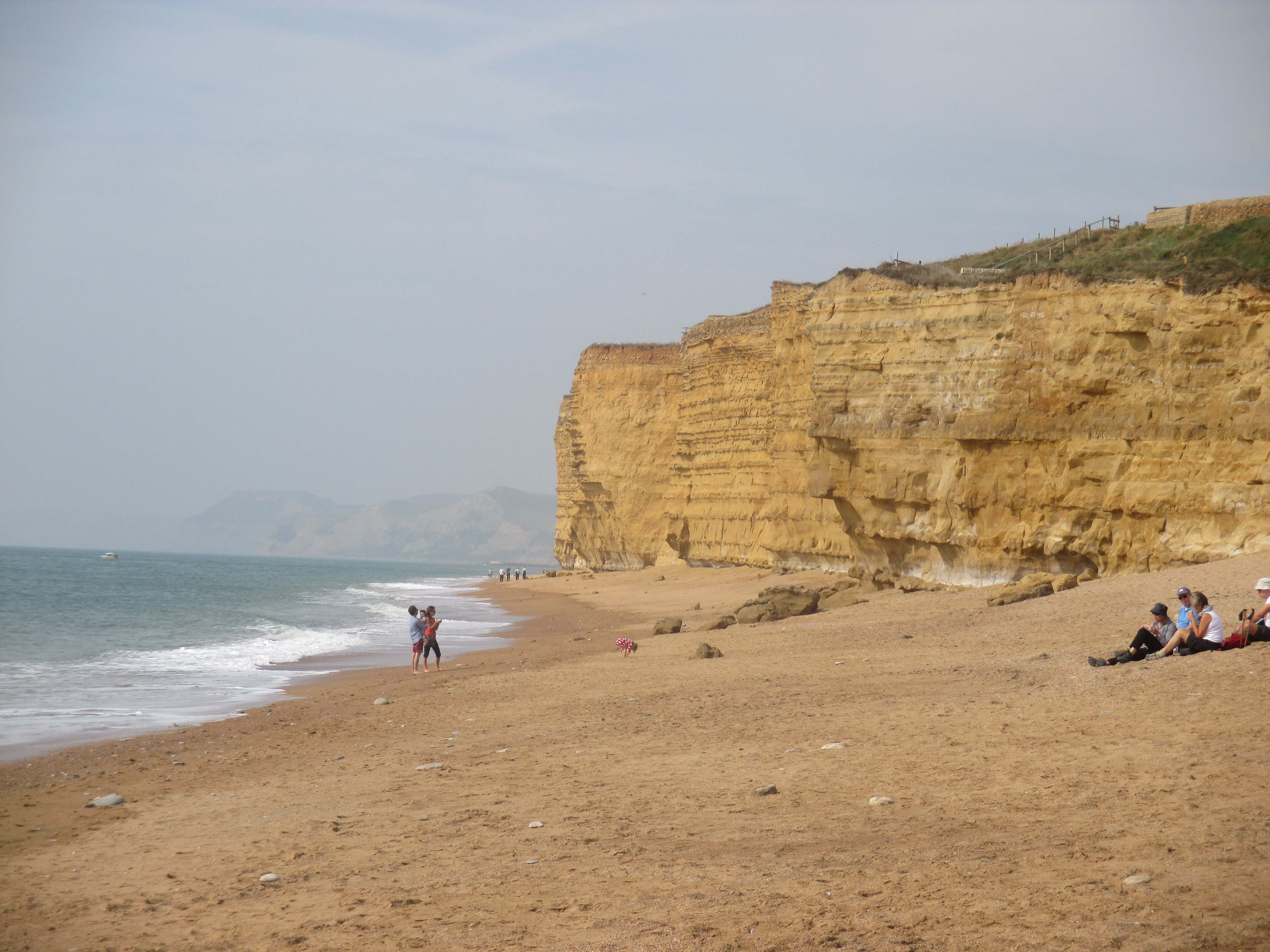 I take a stop at Burton Bradstock, where there’s a lovely sandy beach owned by the National Trust. For the first time on my trip, it’s sunny and warm enough to chance a dip in the sea. I can’t resist, particularly after reading about the benefits of sea bathing in Lyme. Though I have no horse-drawn shed contraption, I undress and reveal to the world my ridiculous tan lines. The sea is cool but pleasant, and I swim around in the waters, delighted, tasting the salt on my tongue, splashing around, gazing back at the distant land, the layered sandy cliffs, and the fishermen catching nothing with a certain oceanic meditative joy.