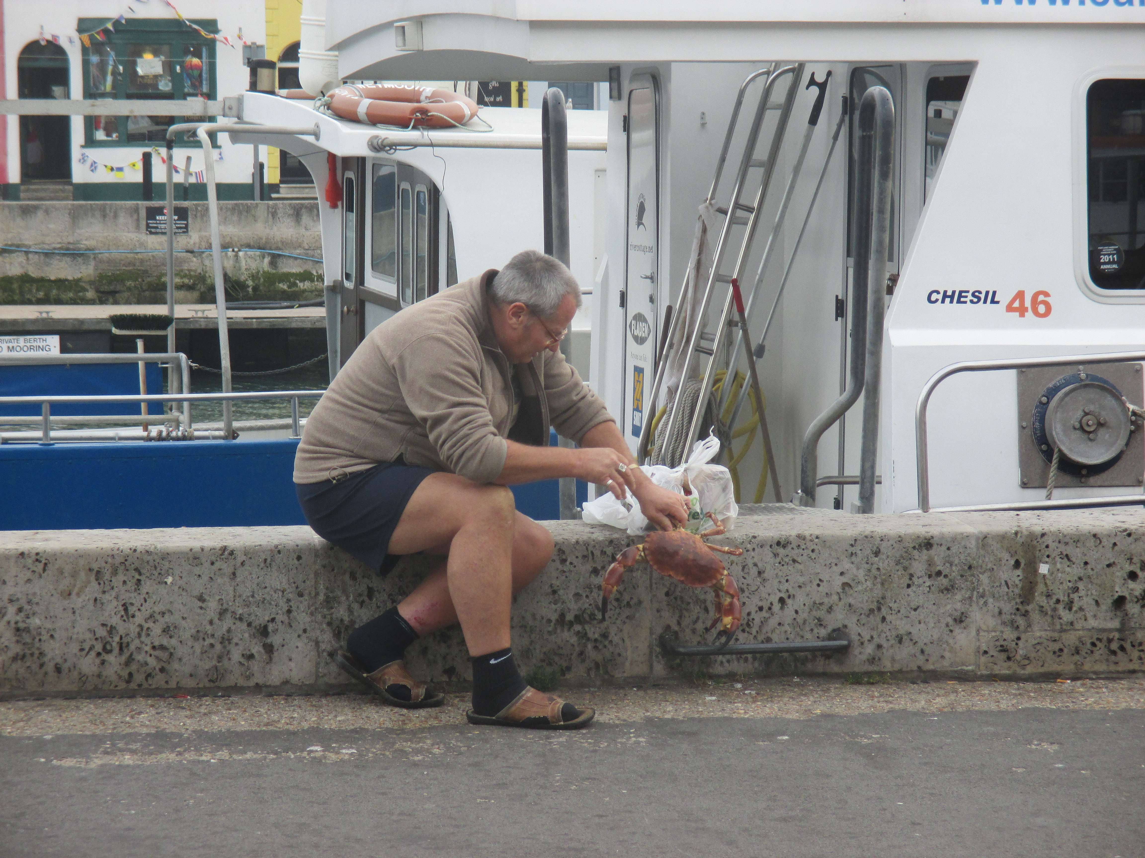 We wander round to the south side of the harbour over a small bridge, passing Bennett’s fish and chip shop where we share a delicious if overpriced portion of chips. This chippie was involved in a local chef’s campaign to sell sustainable fish, and makes a great show of its sale of mackerel, though punters still queue up and pop in for overpriced haddock and cod. Some habits can be inherited without thinking, and as consumers the British often struggle to taste the difference between battered fish. A recent food survey found that up to a third of fish in Glasgow were mis-labelled, and the problem’s thought to be only a little less severe elsewhere. As a fried potato connoisseur, I’ve seen the price rise and quality fall as I’ve proceeded south, but at least this bucks one trend. Gulls stand and shriek by our feet, menacingly goading us to surrender a chip, but we refuse, and their hunger leads two to start pulling apart a fish net whilst they wail at each other.