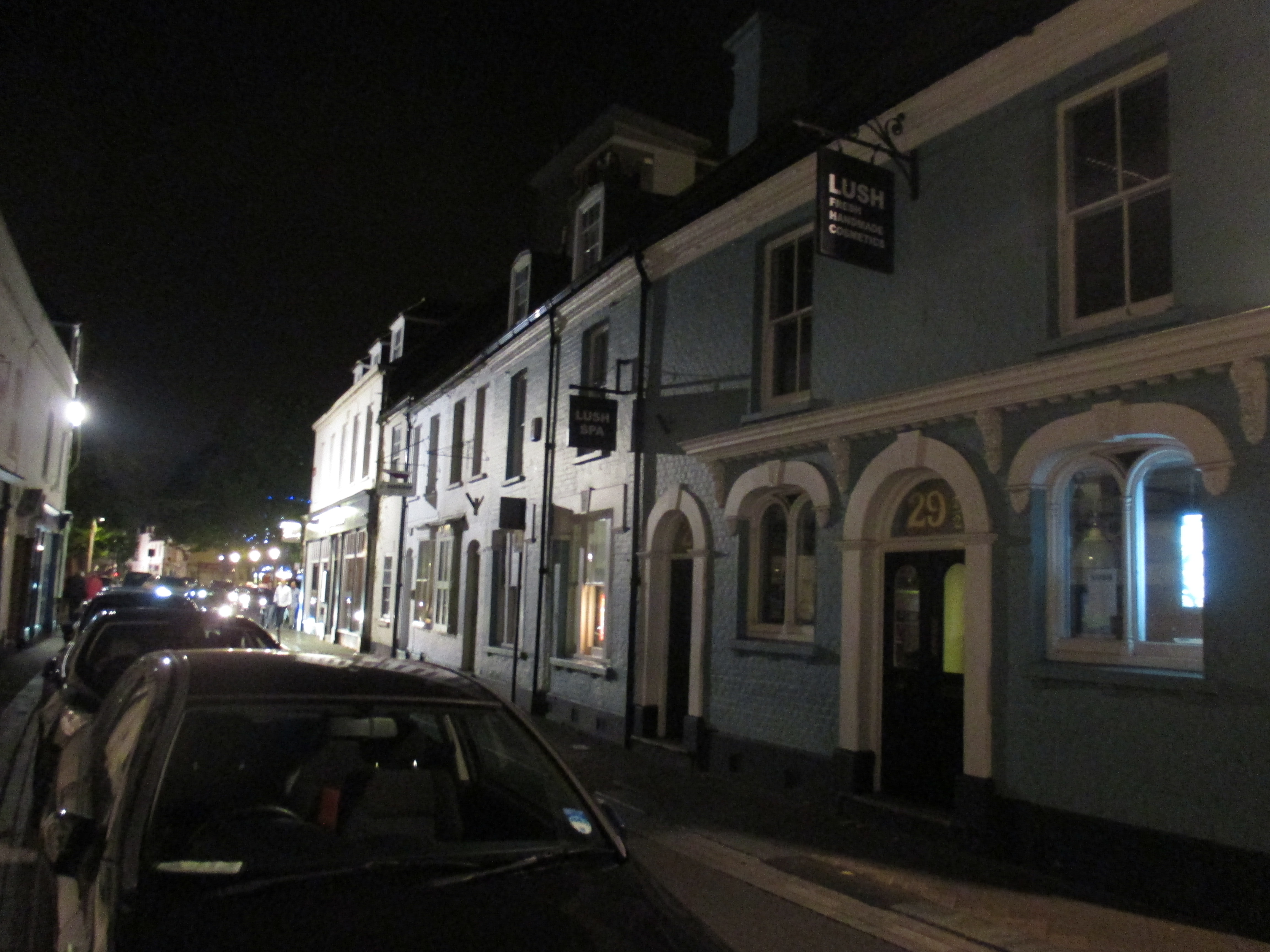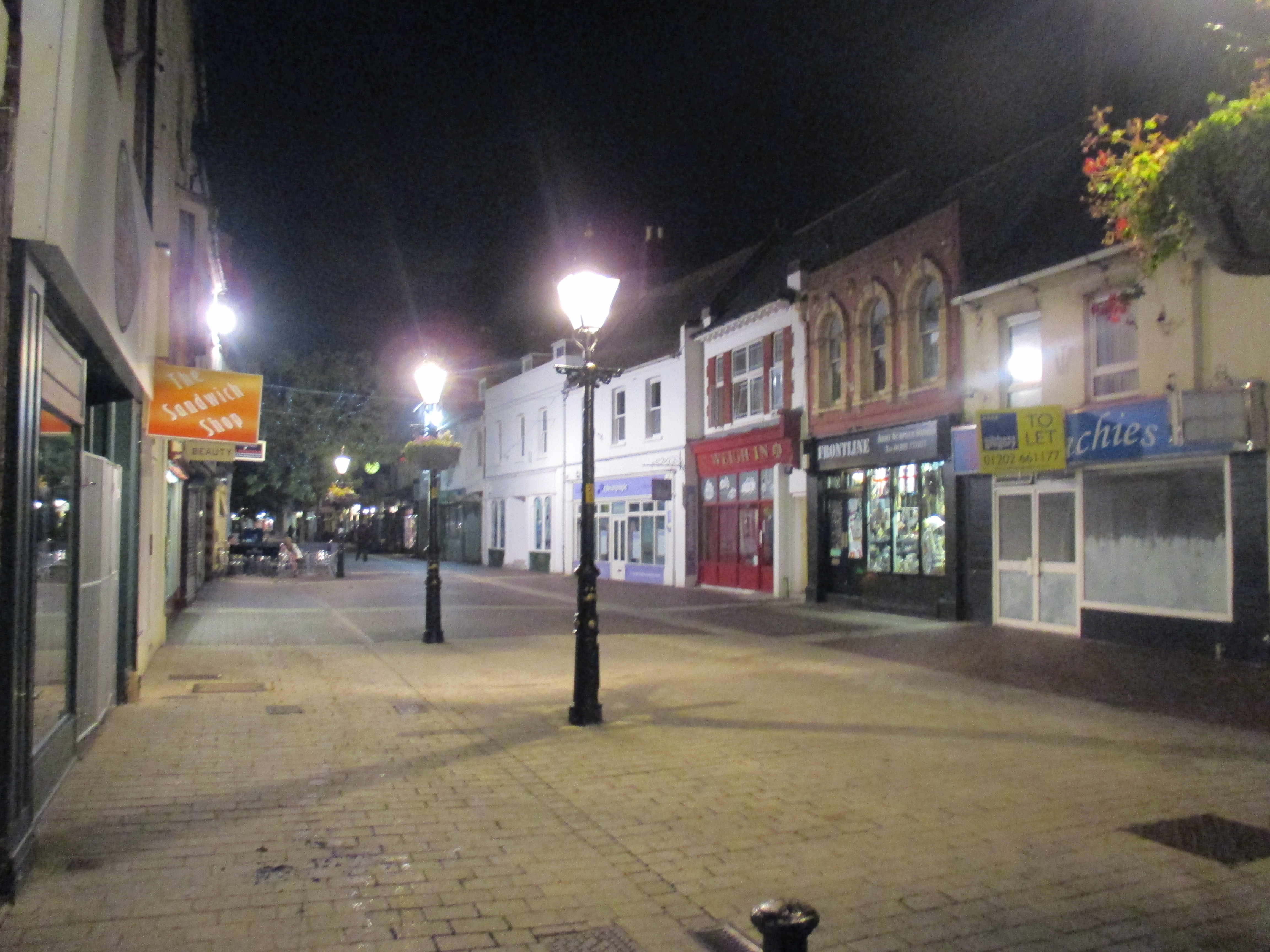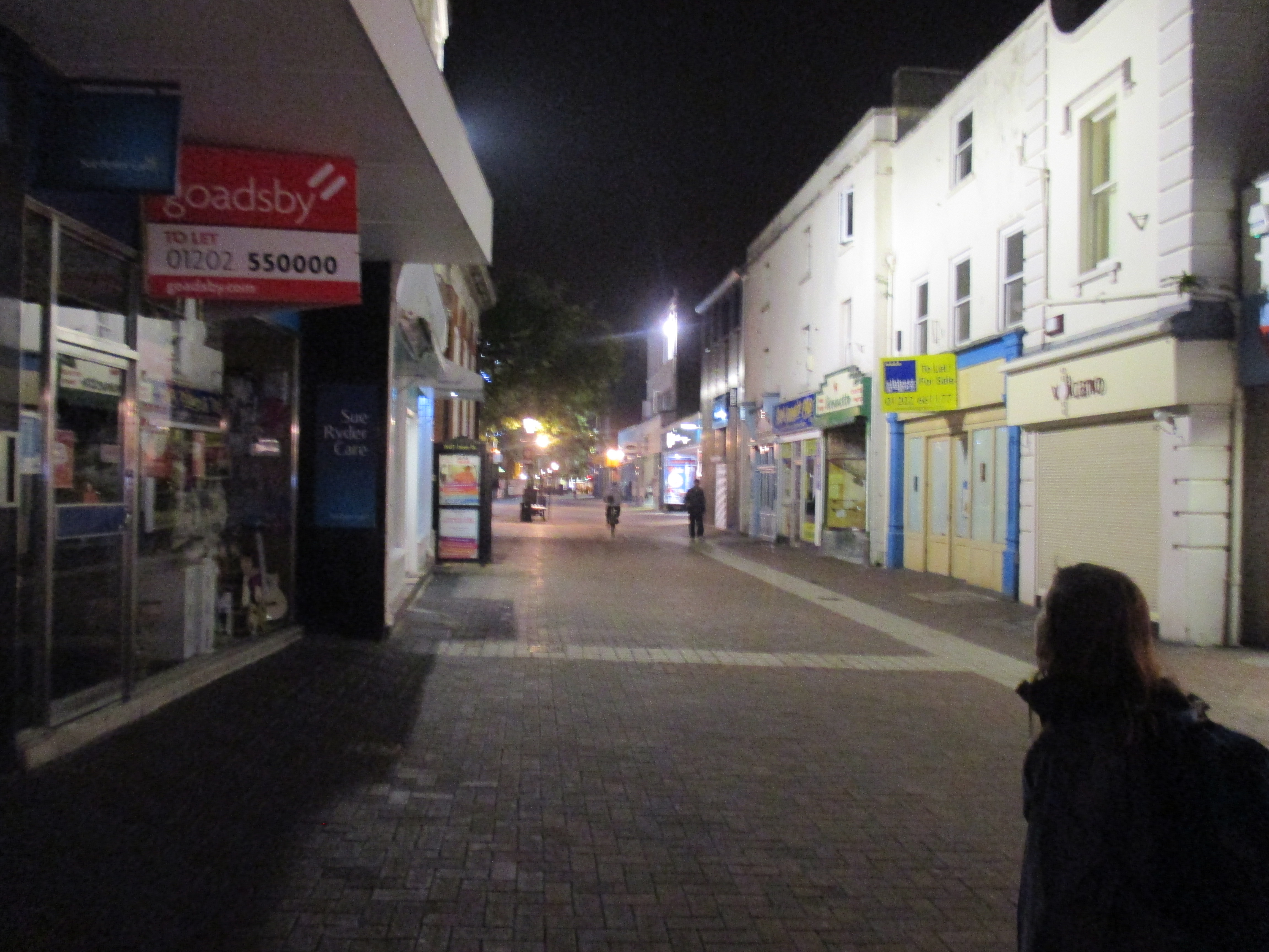 We arrive in Poole. Whilst I’m riding off the ferry, one of my panniers flies off. A harbour worker helps me attach it back on whilst the traffic passes. It’s a strange non-place for conversation, but he warmly tells me about his desire to travel around his campervan. He really likes the town and the beaches, good for surfing, ‘but I’m working all the time, always working’, he says, his face etched with several nights’ worth of deprived sleep. The harbour itself is relatively small, and the area around it a little run-down, but as we approach Poole there’s more to the town. There’s a long old high-street with many a pub, though most are depopulated and the area deserted, strange for a Saturday night. Though the to-let shops are apparent, there’s not an obvious feeling of depression about the place. Outside one fruit machine arcade, a young assistant cleans the windows with languorous care. He tells us that he absolutely loves it here. He moved here from Somerset for work, and ‘I’d never want to go back’. He cites the nightlife, the beaches, and the proximity of Bournemouth, with its mixture of young workers and students.