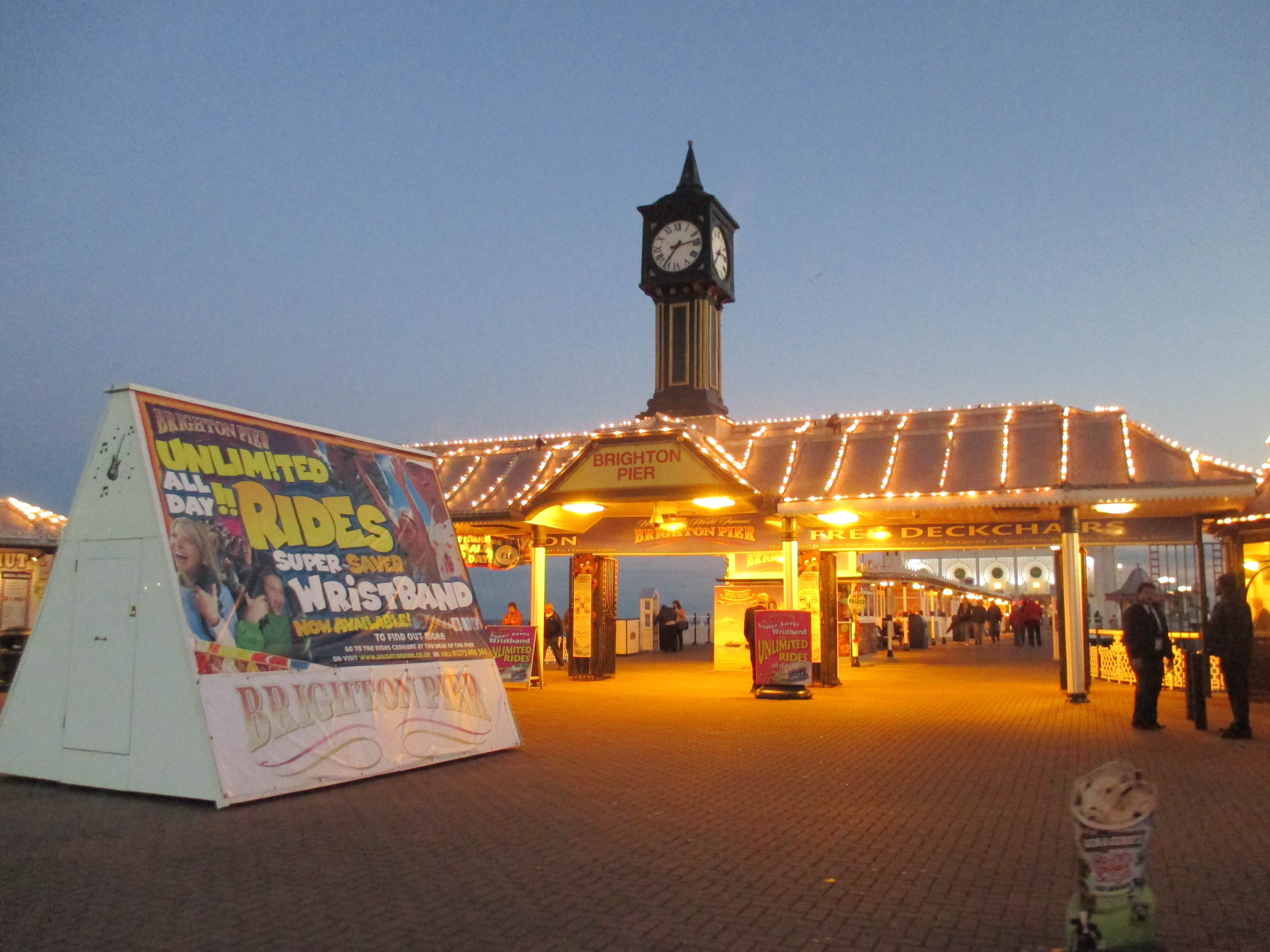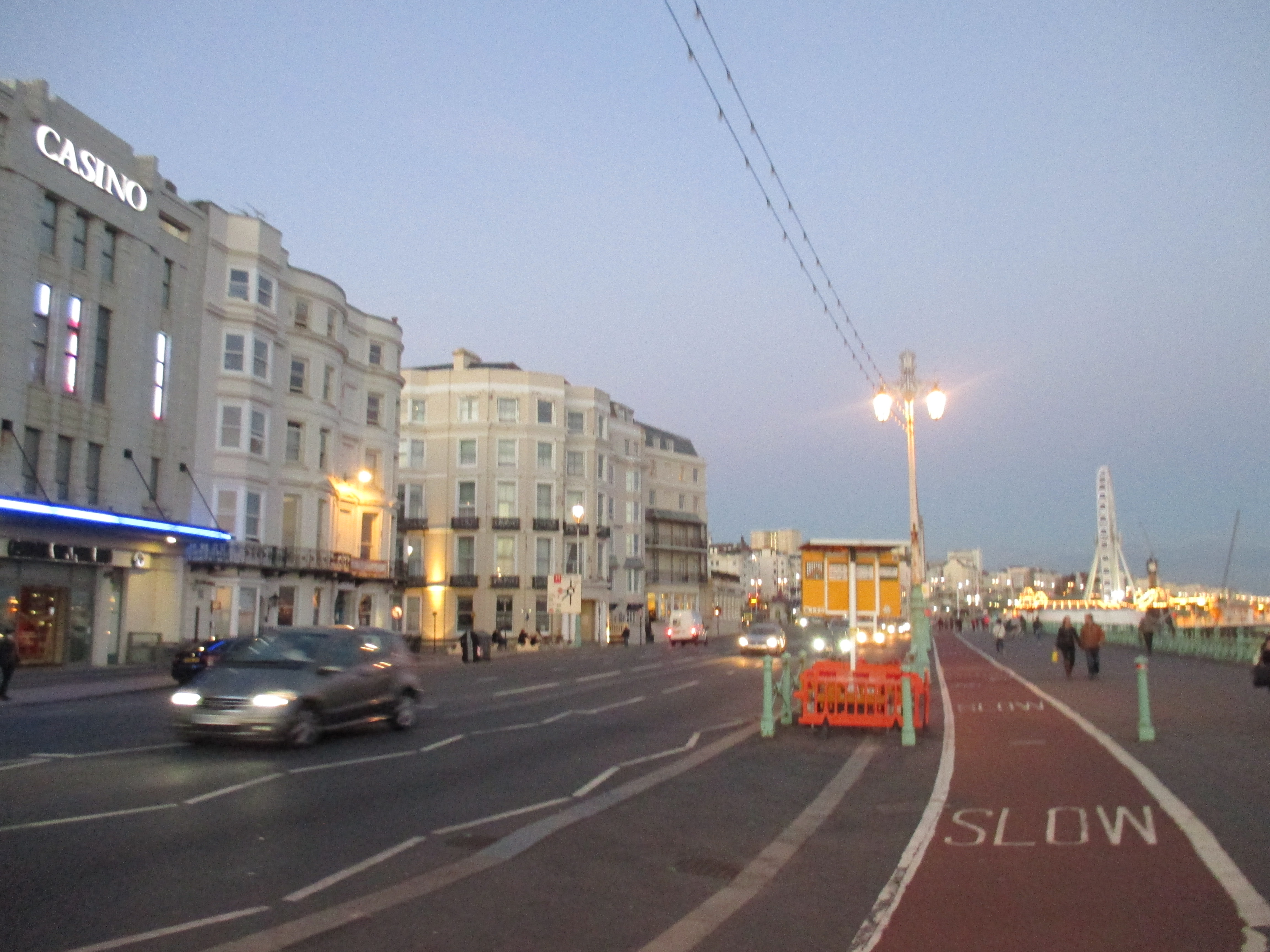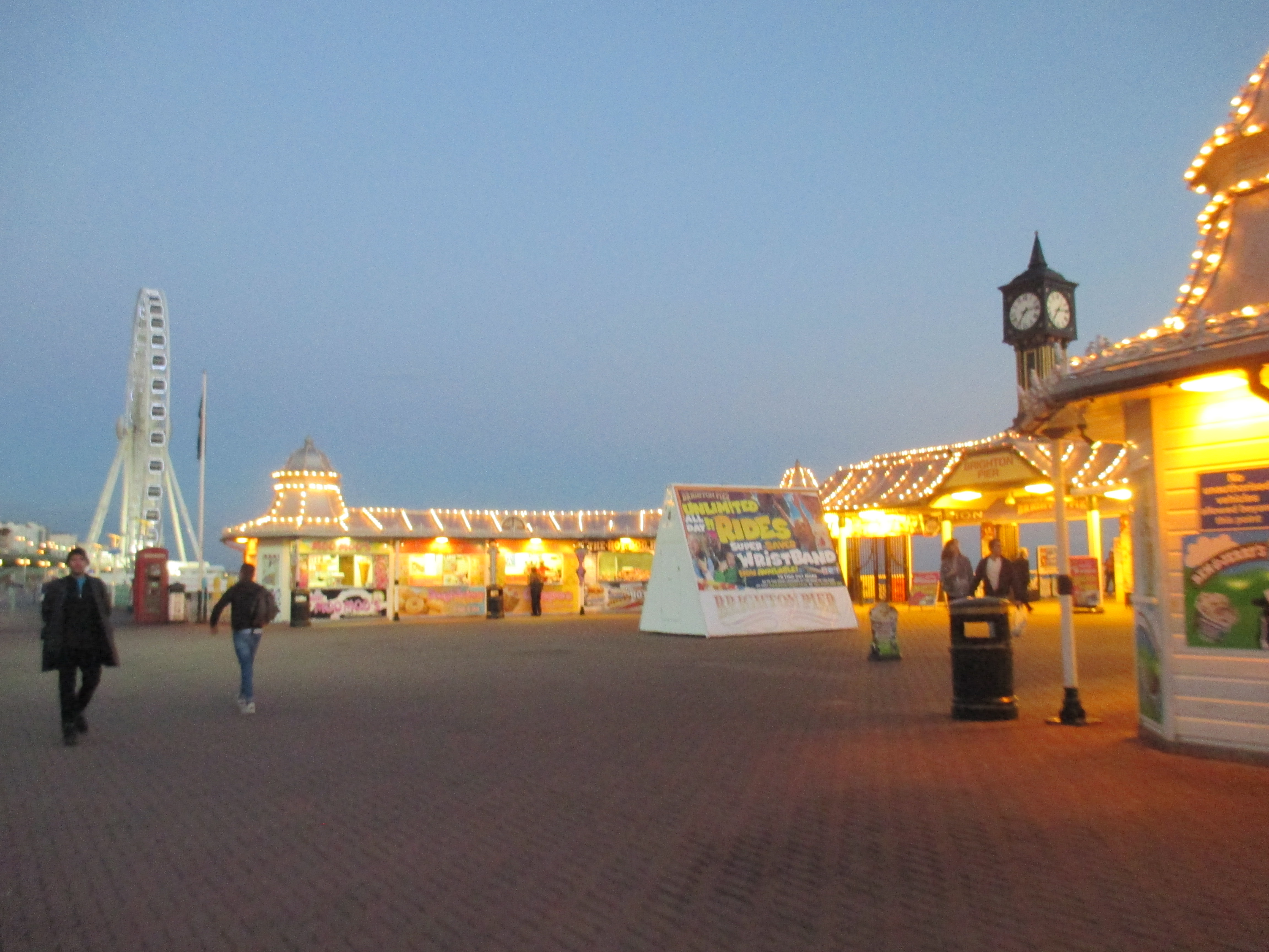 I ride on, past takeaways, pubs, a cheery if seedy tattiness presiding. The town’s successfully managed to hold back the more irresponsible instincts of developers and speculators, and there’s only one idiotic retail park I pass, not three or four as is usually the case with a town this size. In fact aside from the modern University of Brighton buildings close to the seafront, there are very few new buildings whatsoever. Much of its centre retains the narrow lanes, promenades, crescents and stuccoed terraces of the Regency period of the late 18th century, with Brighton booming as a fashionable spa resort over the 19th century. There are countless pubs, bars, boutiques and cultural centres here. I drift around, past the Royal Pavilion with its fanciful minarets and onion domes, and a garden where Bob Dylan’s ‘Blowing in the Wind’ is sung to an audience of drunk vagrants. I pass the Grand Hotel where Debussy writes La Mer, and along the seafront where mods and rockers would gather every bank holiday on their scooters and bikes for a mass beach brawl. Those were the days, crime-free, unplagued by violent teenage gangs, right… Brighton’s sole surviving pier, the Palace, dizzily flashes with gaudy lights and cheap spectacles, the burnt remains of the West Pier not far along the coast.
