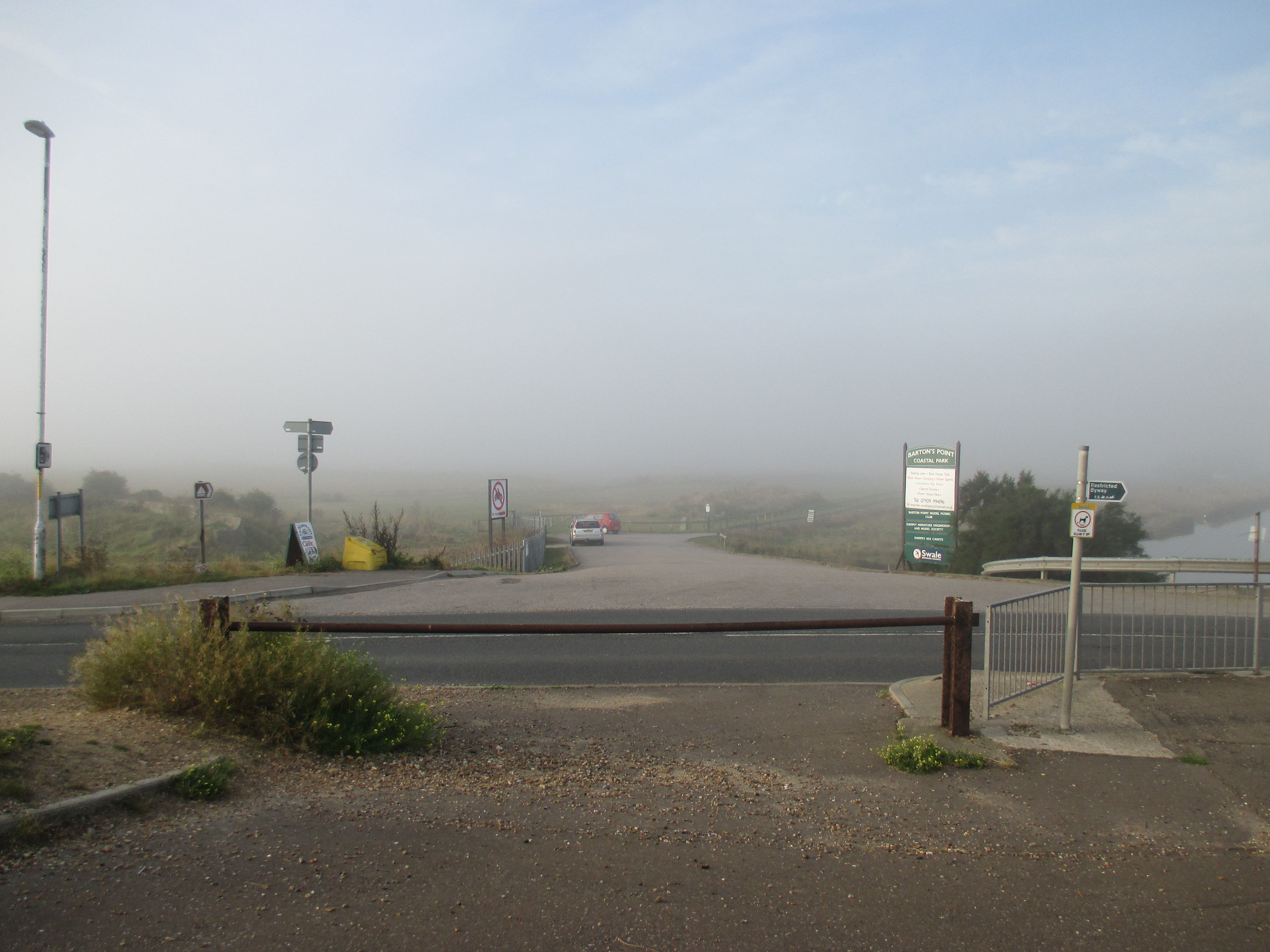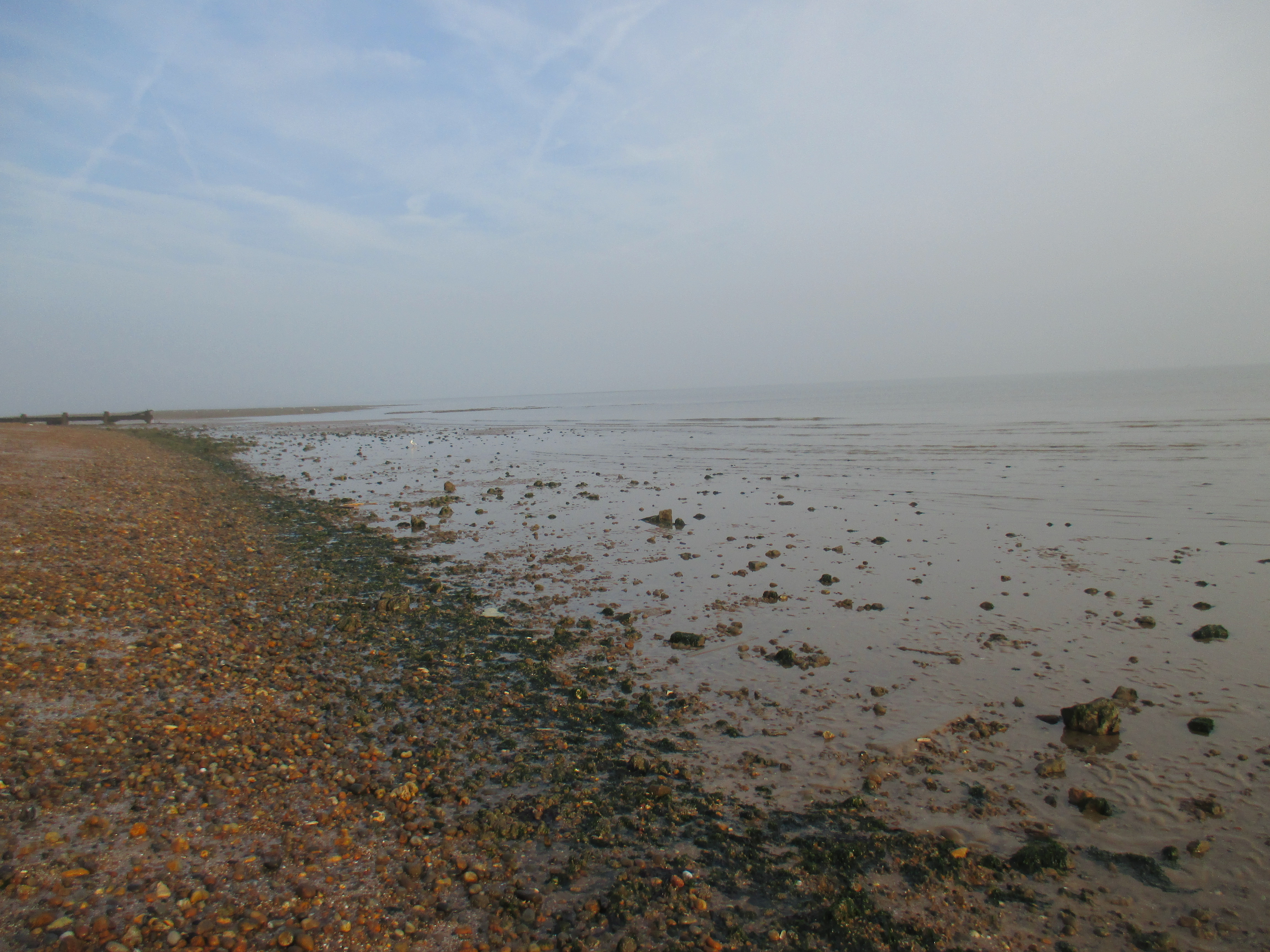 I’ve slept beside some kind of stream in the recesses of Barton Park. It’s early morning, but dog-walkers are roving around in the distance, and I have to keep low until I can guarantee desertion in order to make a respectable exit. (Believe me, no more wild-camping in anywhere remotely near human civilisation…) I’m close to the northern shore of Sheppey, whose road I’d followed last night leaving Sheerness. There are silvers and blues in that morning sky over the beach, the tide lapping gently against piles of pebbles and dark seaweed coughed up by the sea. There’s heat in the air, thankfully, accompanied by a pinching cool breeze. A white disc hangs heavily over the seas, and in the distance I see nothing.