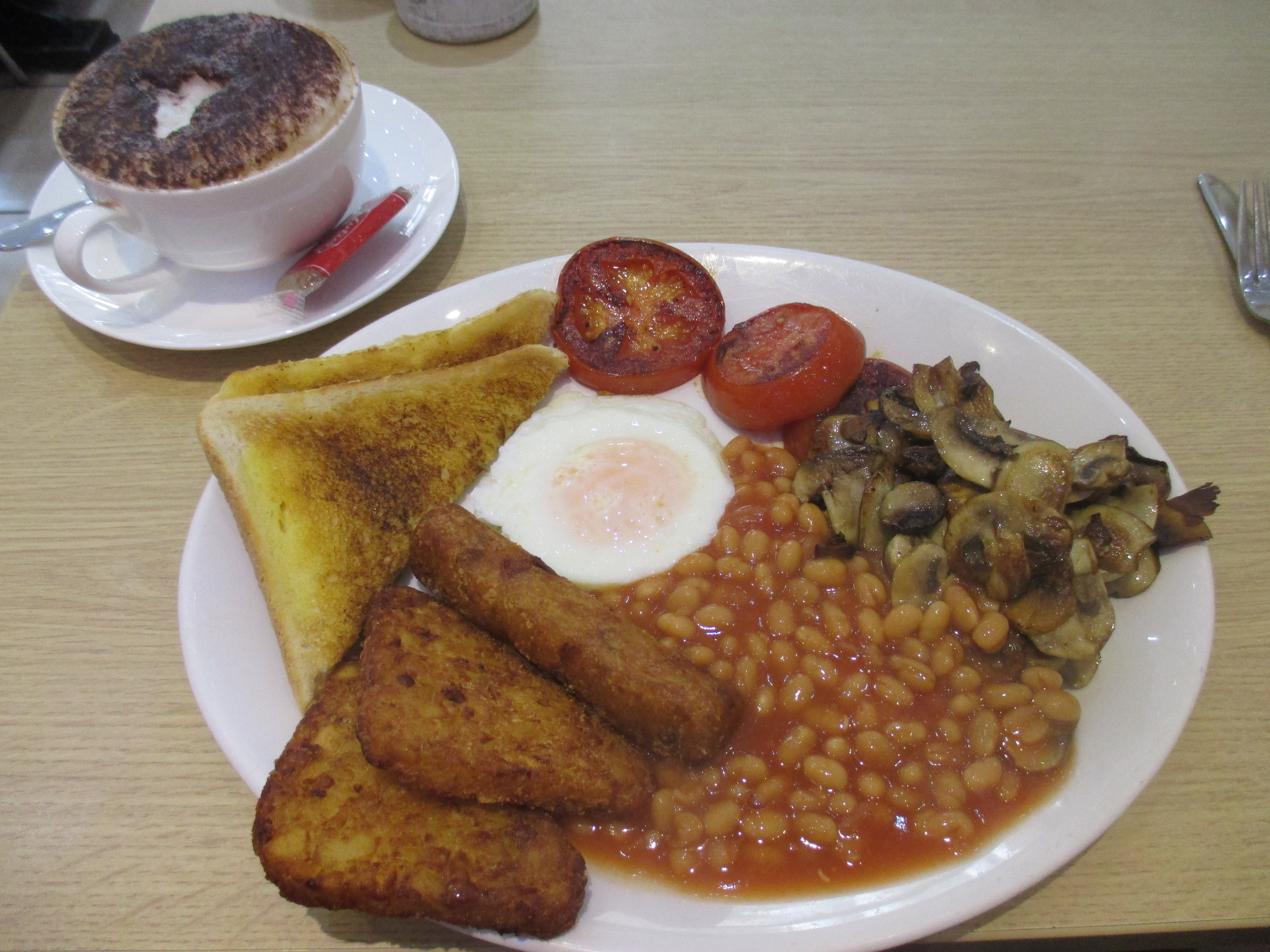 Who knows the origin of the English breakfast? It’s a mishmash of different things, once hastily and carelessly assembled together then habitually reproduced according to a set formula. One egg, one slice of bacon, two sausages, half a tomato sliced, a large spoonful of beans, a few mushrooms tossed in for good measure. Everything fried. In some places, black pudding. Purists will scoff at the yankee hash brown and claim that chips are more English, as if New York were closer than Antwerp. But the fried breakfast plays by its own rules.