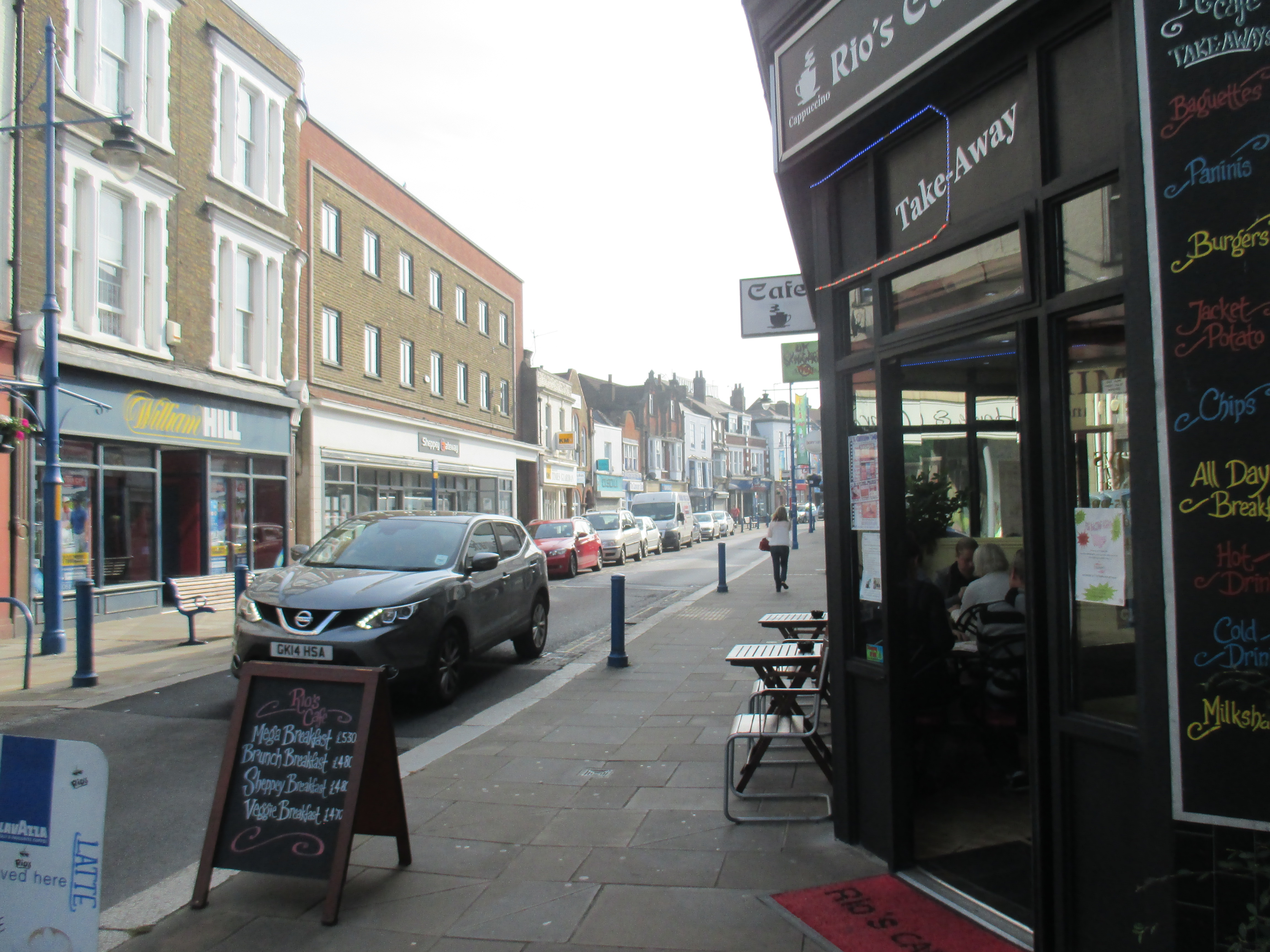 Broken-up plastics and small bones have been washed up here with the shingle. A great mist hangs over the park, and over the sea around me. I ride along the promenade, confused that this dull and tatty town was once a desirable holiday destination. The town is surprisingly large in daylight, filled with amenities, and there aren’t obvious signs of decline, like boarded-up businesses, excessive charity shops, or random acts of vandalism or damage. There’s a good number of independent shops, and a fairly chipper feeling in the air. The Rio caff lures me in with an olfactory onslaught of fried finery.