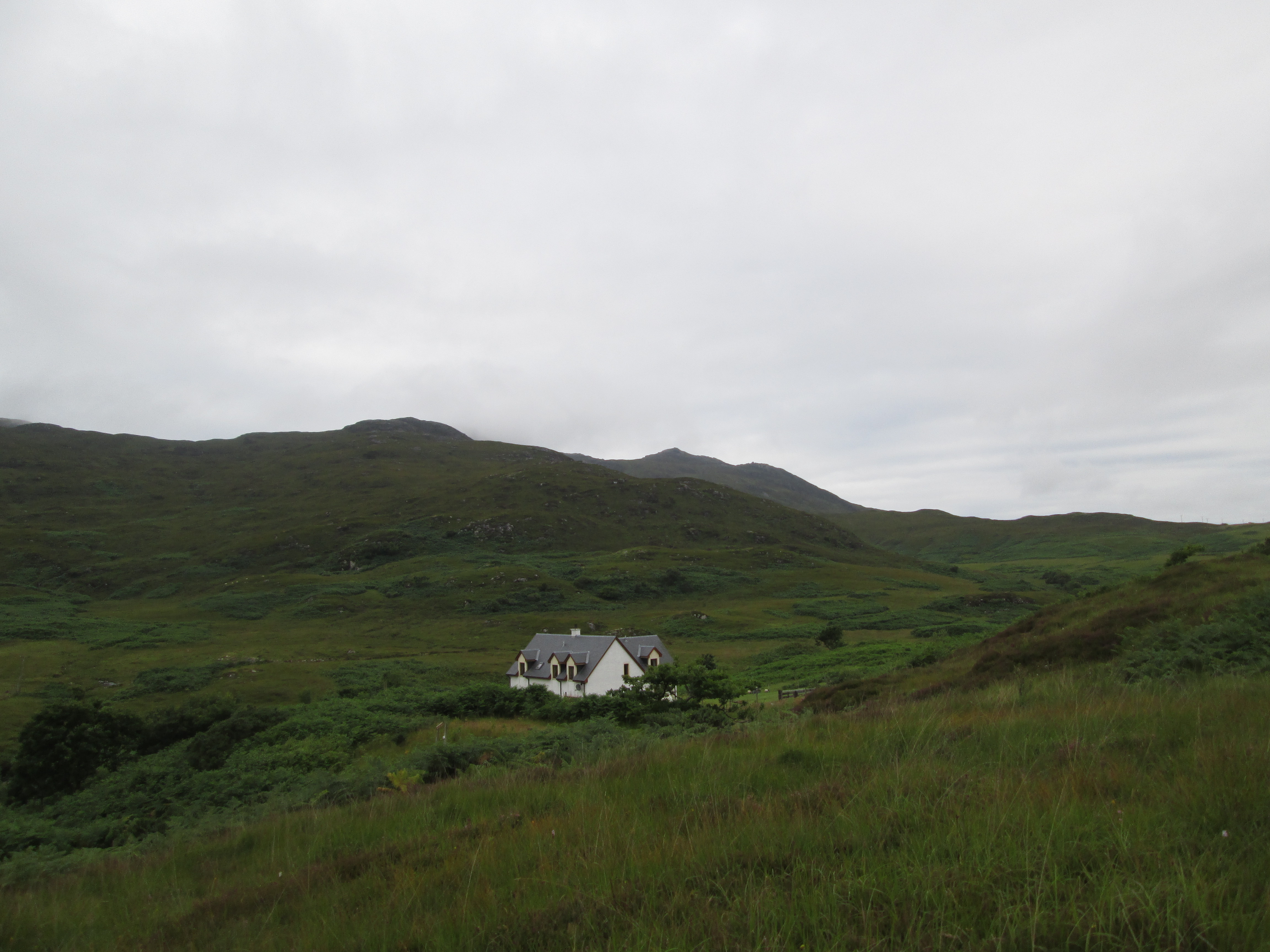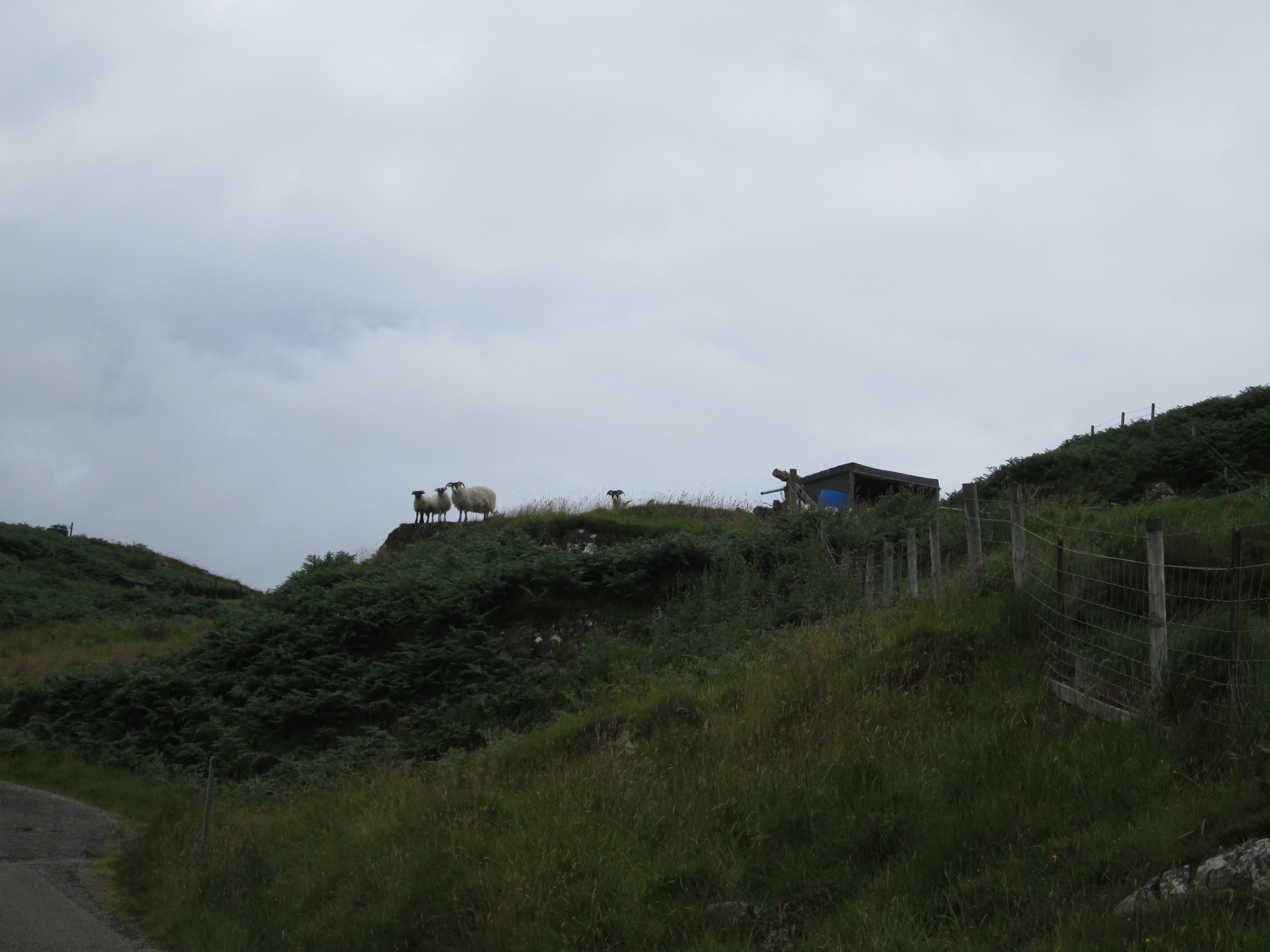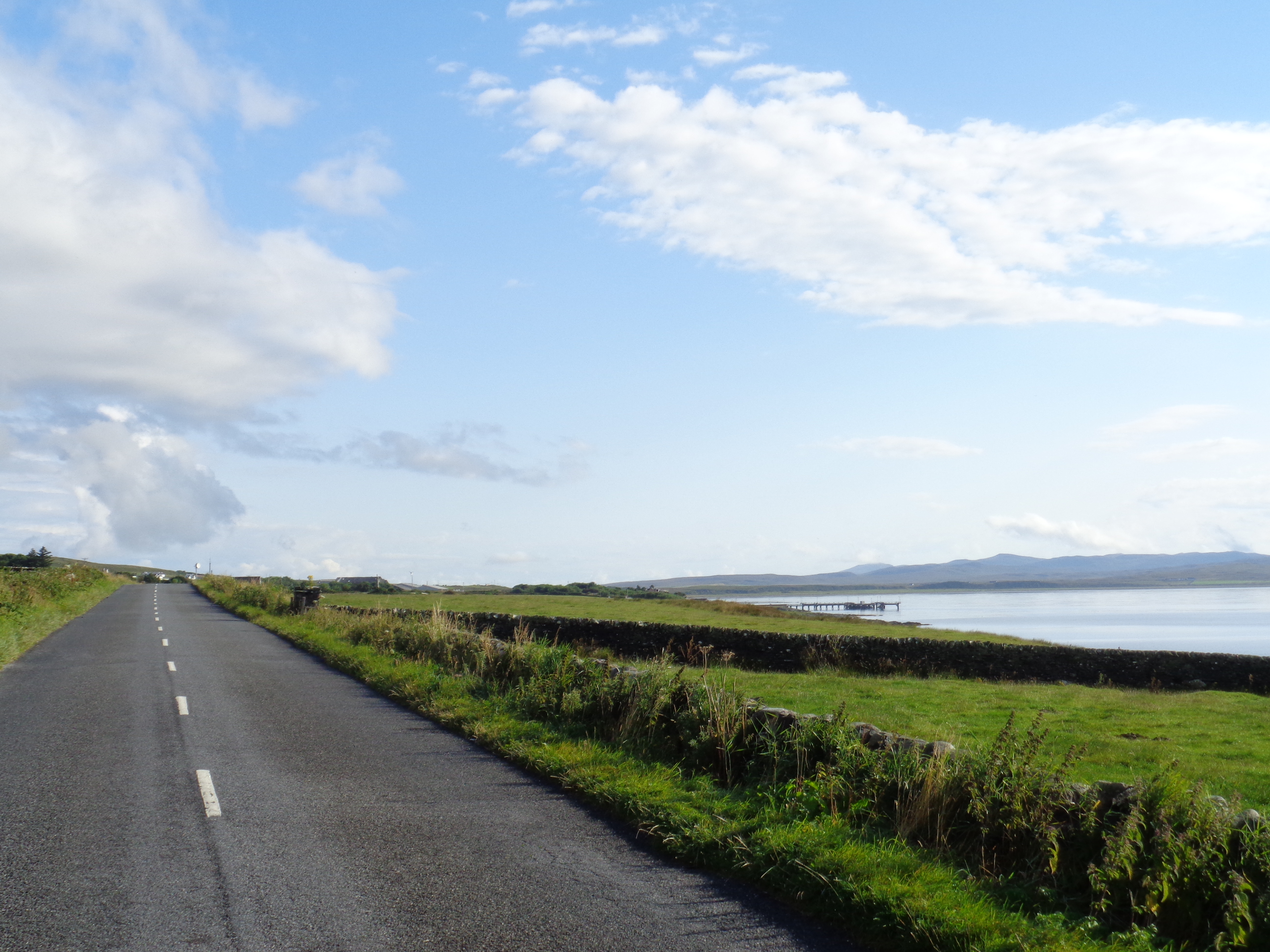 The countryside leaving Dalmellington has been farmed with cattle, as has much of Ayrshire, and it gently slopes here and there with a pleasant though familiar aspect: green, farmed fields give way at their peaks to the beginnings of gentle mountains, marked with bursts of trees and shrubs. Further along, the road drills through a valley, small mountains sloping into the distance. It’s a relatively quiet road and there’s no threat of rain today. I pedal along gently, slowly building up a pace.